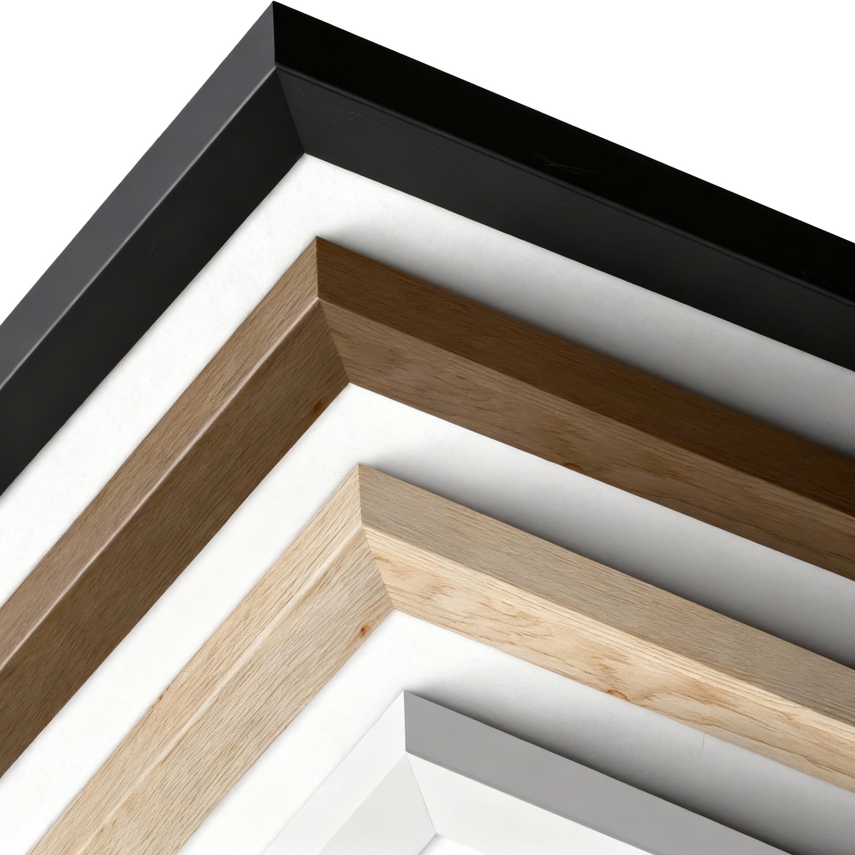Jede Leinwand wird präzise gespannt und von einem hochwertigen Holzrahmen umfasst, erhältlich in Schwarz, Naturholz oder Dunkelbraun.