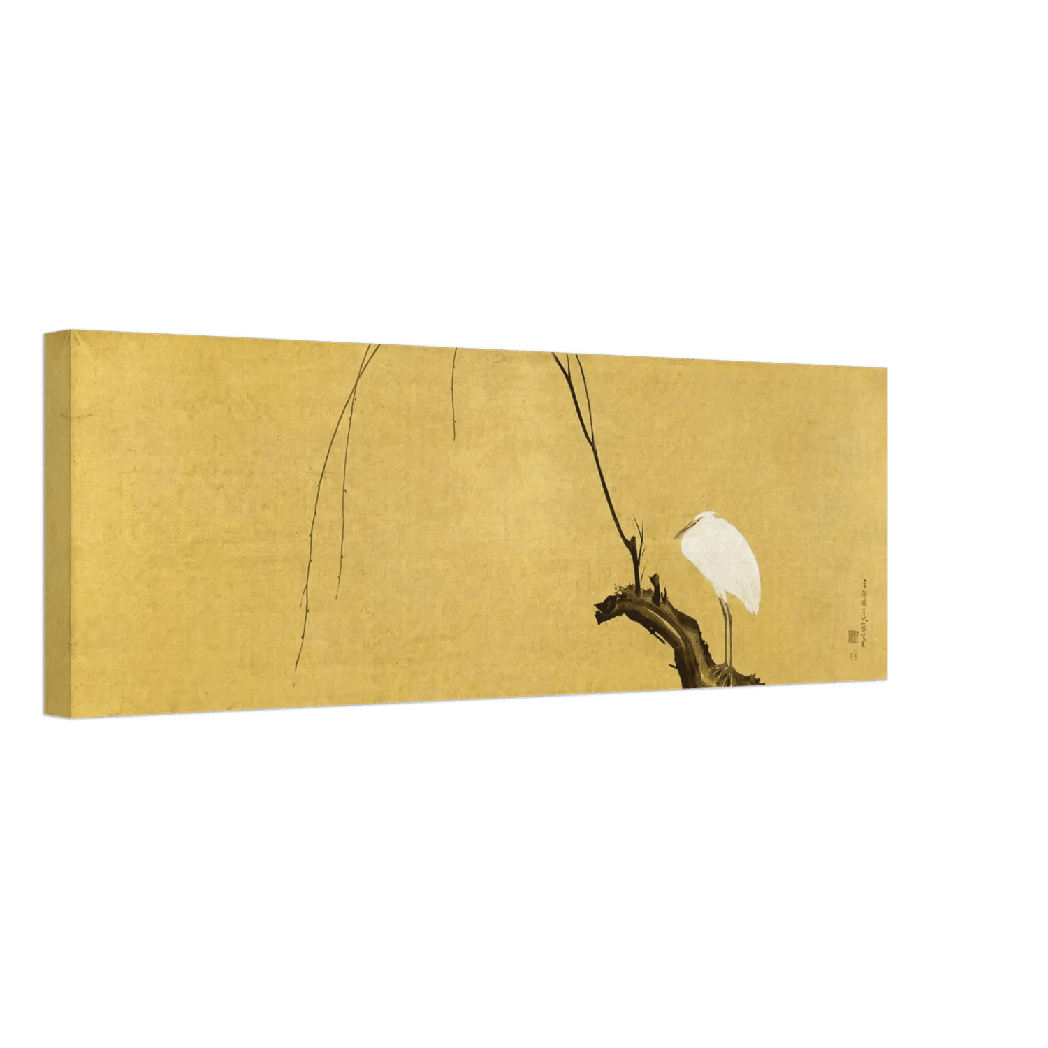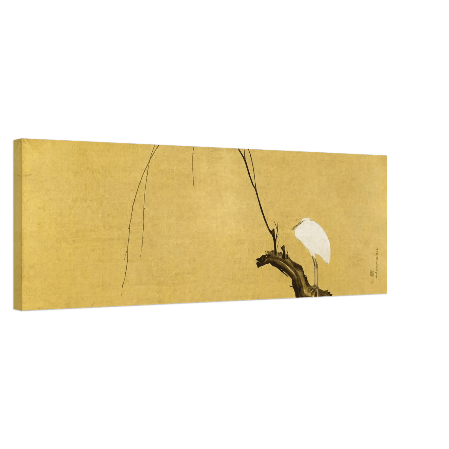 Ein einzelner Reiher ruht auf einem kahlen Weidenast, der sich elegant in den goldenen Hintergrund neigt. Die feinen Linien des Zweigs und das reine Weiß des Gefieders erzeugen eine stille Spannung zwischen Leere und Leben – ein Moment voll meditativer Ruhe.