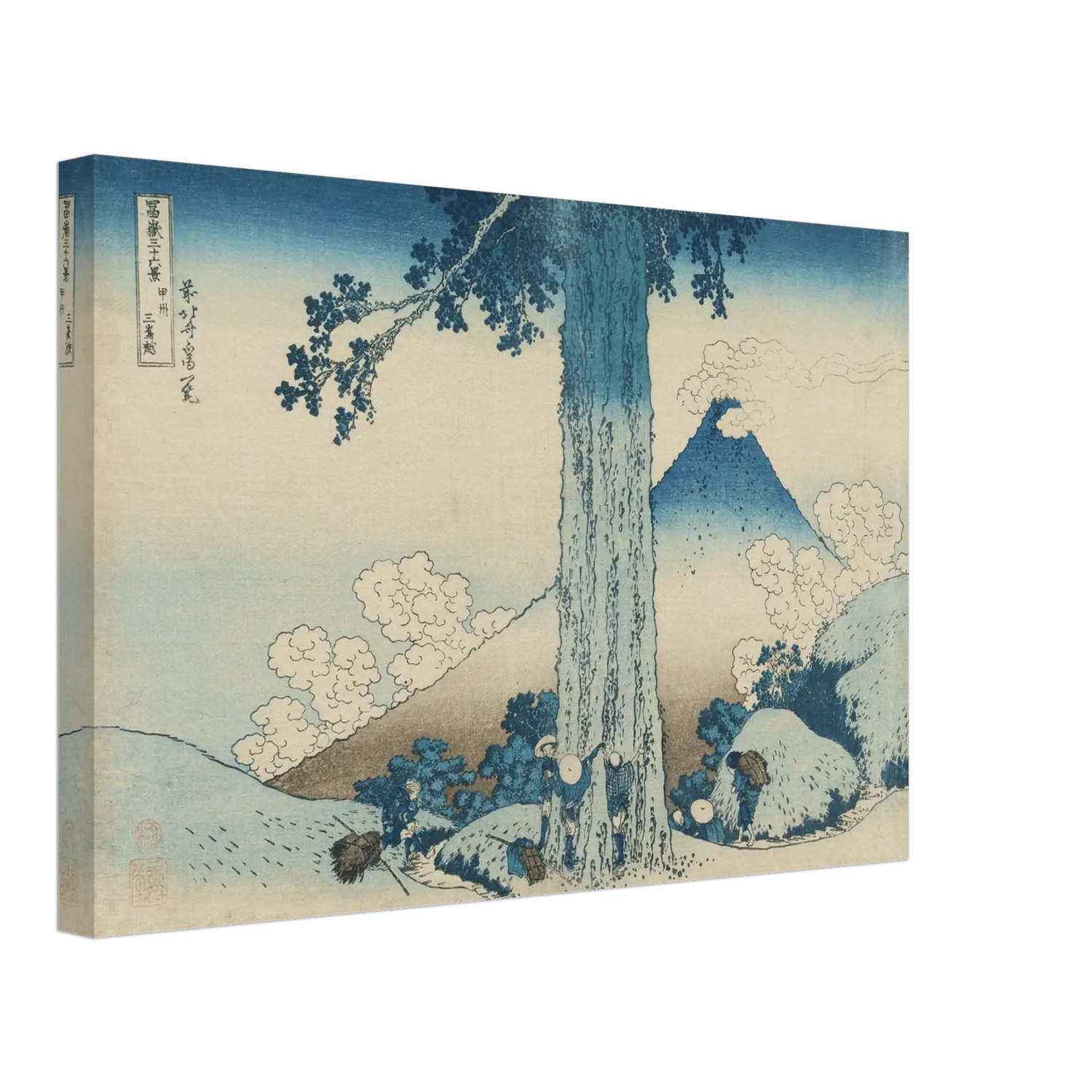 Ein mächtiger Baum erhebt sich im Vordergrund, während in der Ferne der Fuji in tiefem Blau erscheint. Kleine Wanderer und Bauern bewegen sich gemächlich über den Pfad – ihre Gestalten wirken winzig im Angesicht der Natur. Wolken treiben wie Rauch über den Berg, und die Szenerie atmet die stille Größe des Landes.