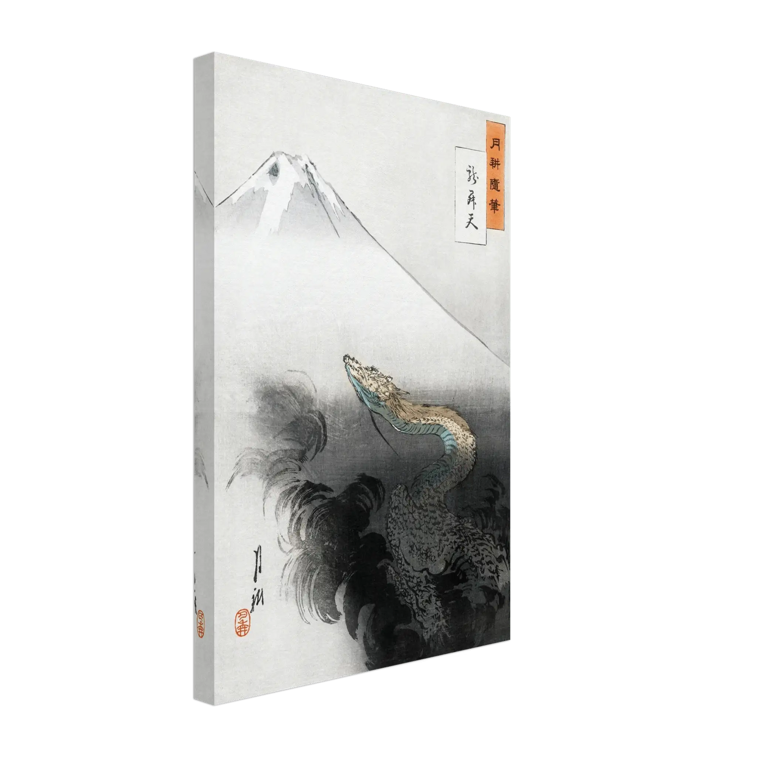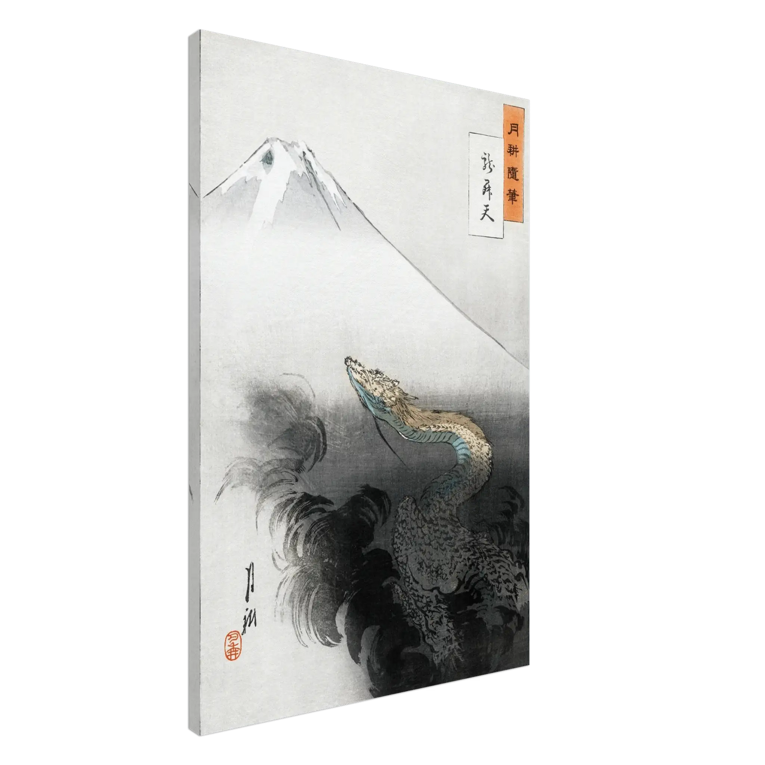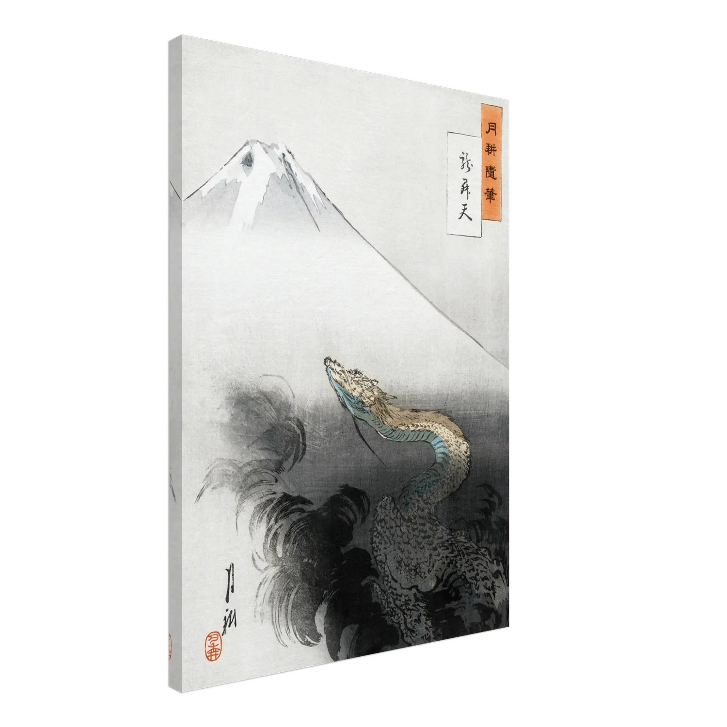 Ein mächtiger Drache erhebt sich aus dunklen Wolken und richtet seinen Blick empor zum heiligen Berg Fuji, der in kühlem Weiß über der Szene schwebt. Zwischen Licht und Schatten entsteht ein Moment von Bewegung und Stille – der Drache, Sinnbild göttlicher Kraft, steigt aus der Erde zum Himmel auf.