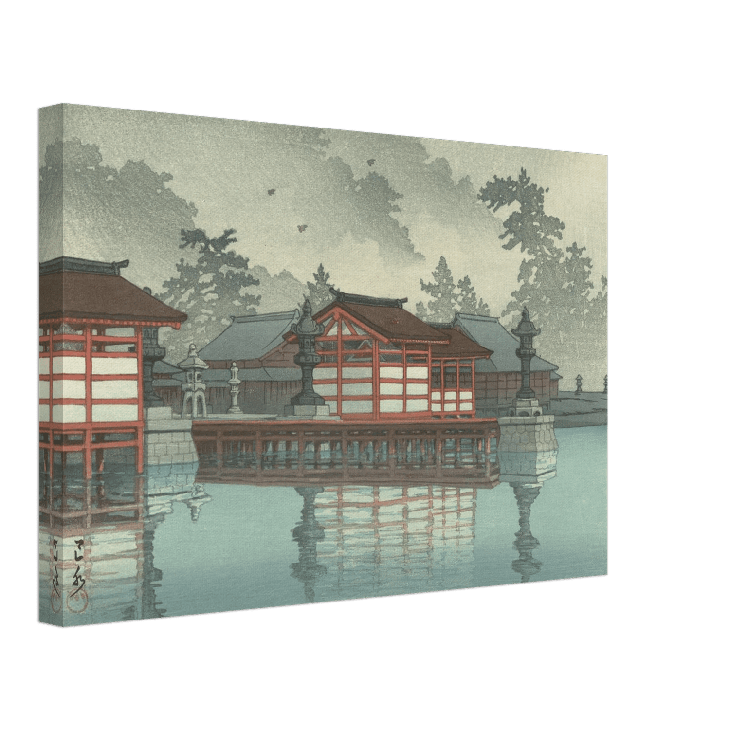 Ein zarter Nebel liegt über dem Wasser und verwischt die Grenzen zwischen Himmel, Tempel und Spiegelung. Die roten Pavillons des Itsukushima-Schreins schimmern still im matten Morgenlicht, ihre Formen lösen sich sanft im Dunst auf. Kawase Hasui verwandelt die heilige Insel Miyajima in ein Sinnbild der Vergänglichkeit – ein Ort, an dem Stille und Ewigkeit sich berühren.
