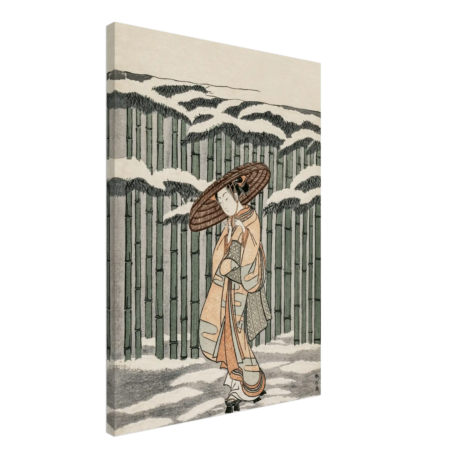Eine junge Frau schreitet anmutig durch einen verschneiten Bambuswald. Ihr zarter Kimono in Pfirsich- und Grüntönen hebt sich sanft vom stillen Weiß des Schnees ab. Über ihr senken sich die Bambushalme, schwer von der winterlichen Last, während sie ihren Weg mit ruhiger Eleganz fortsetzt – geschützt unter einem breiten Strohhut, der sie vor der Kälte bewahrt.