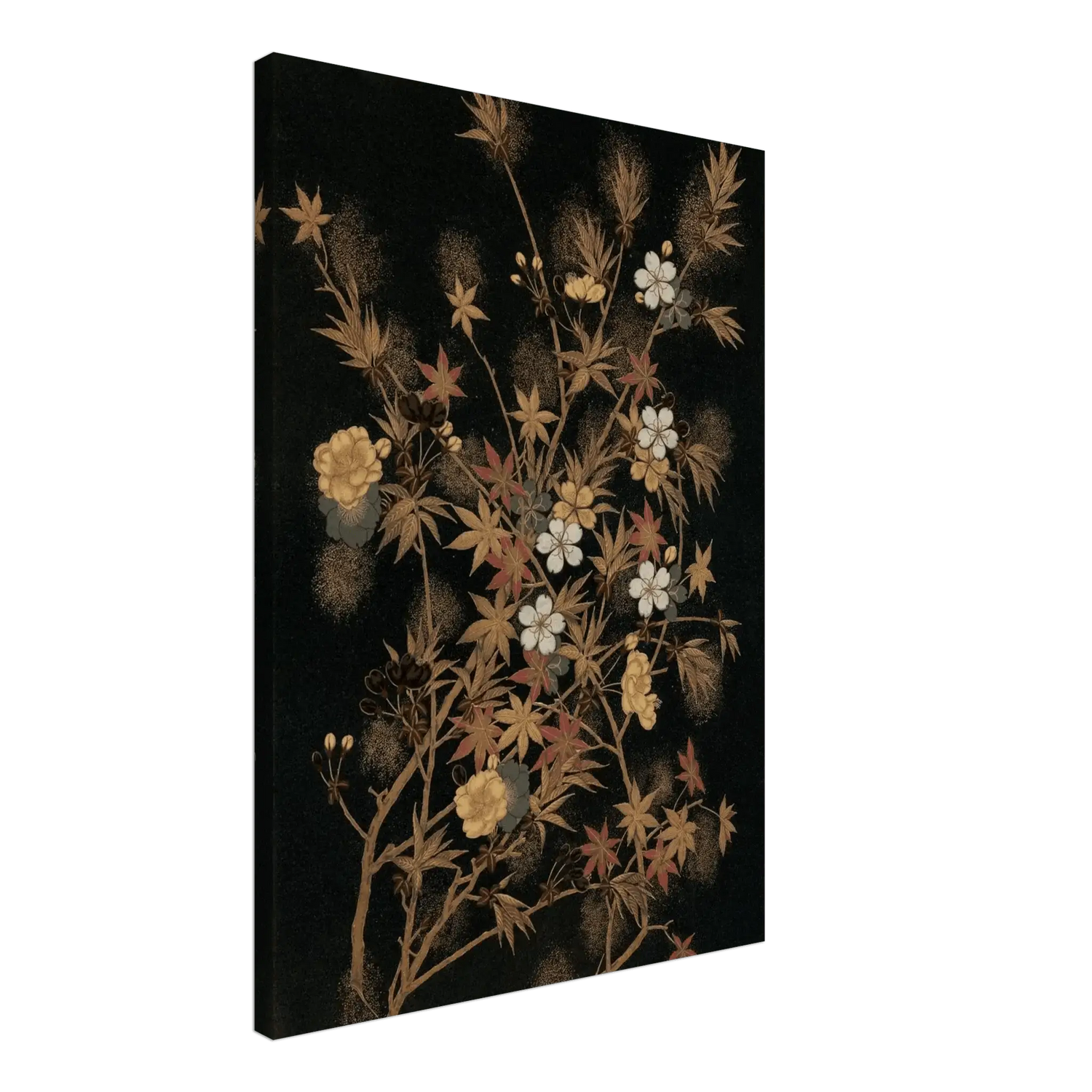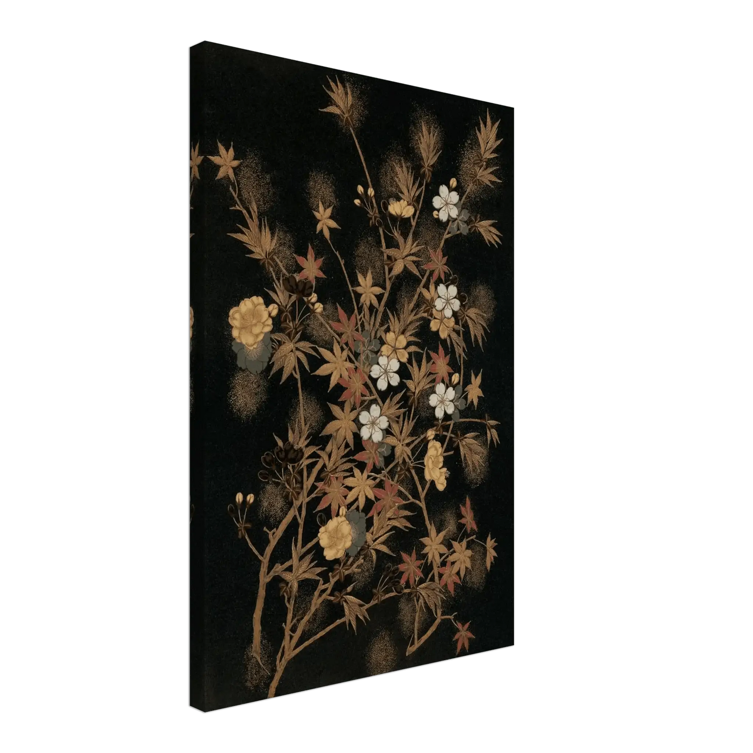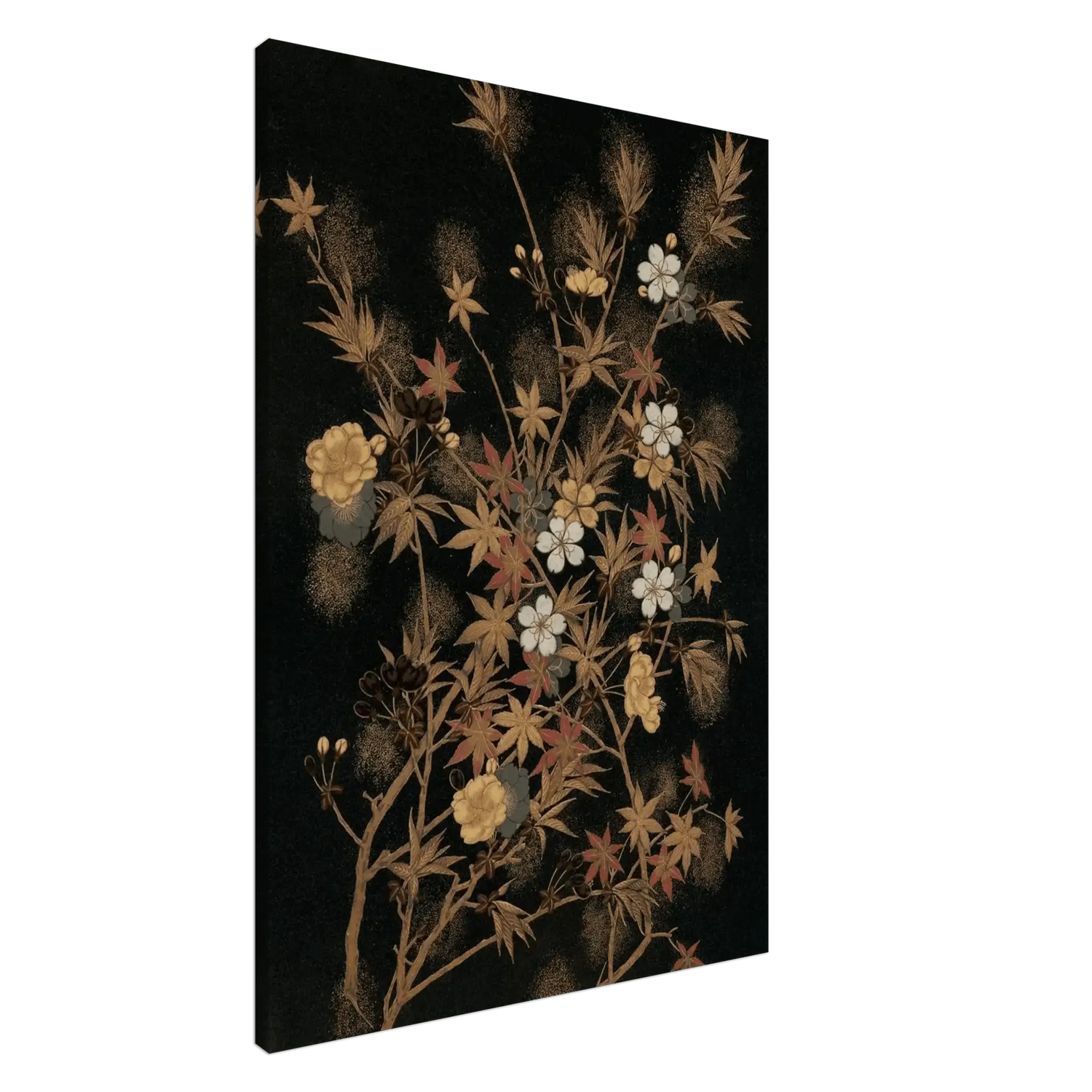 Ein feines Geflecht aus zarten Zweigen, Ahornblättern und Blüten entfaltet sich vor tiefschwarzem Hintergrund. Goldene und kupferfarbene Akzente, durchsetzt von weißen Kirschblüten und roten Herbstblättern, schaffen eine subtile Balance zwischen Fülle und Leichtigkeit.