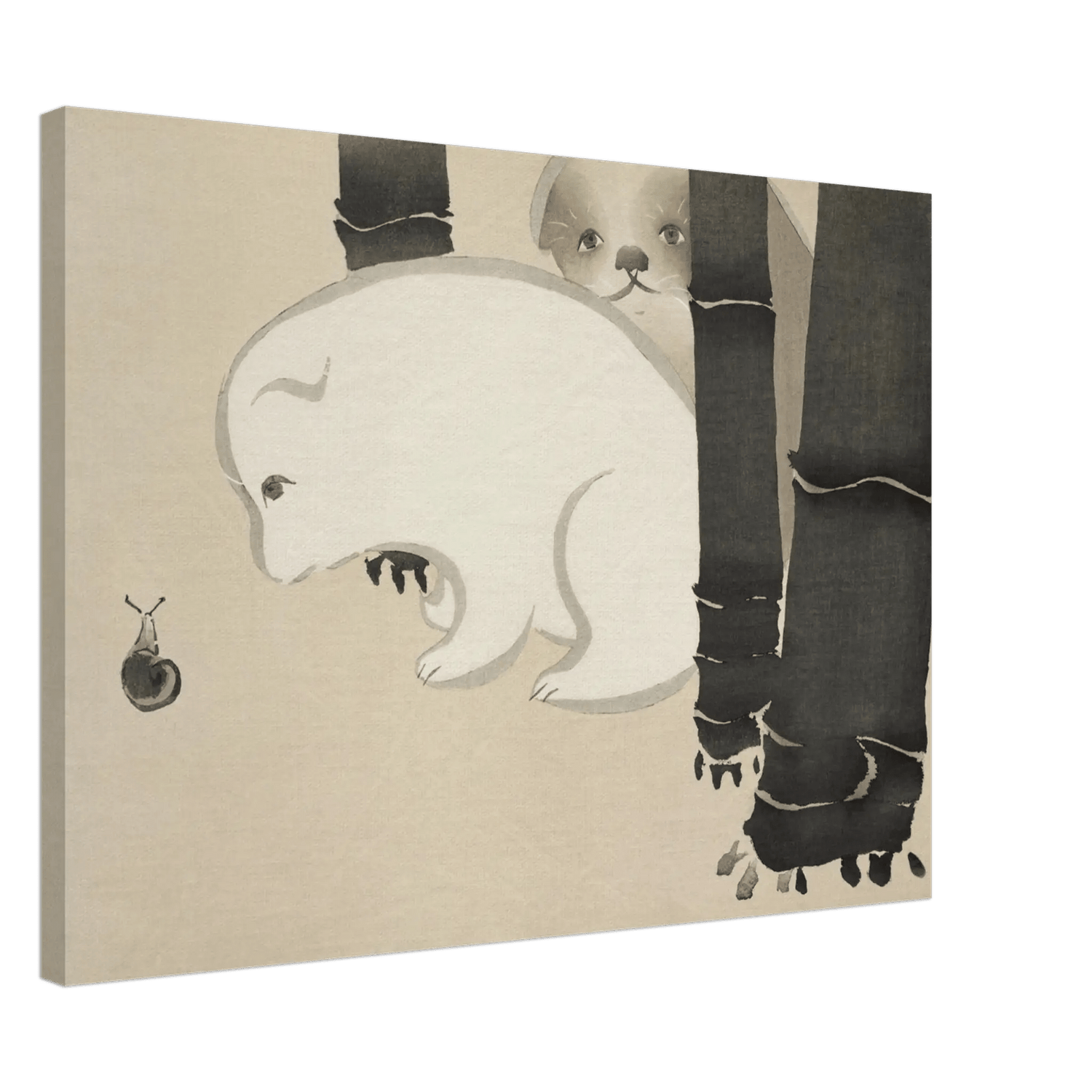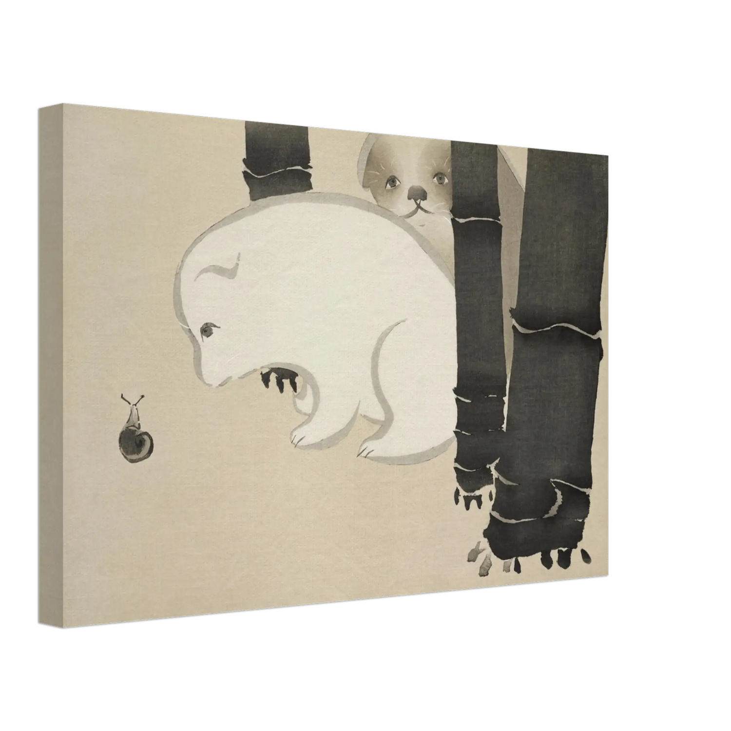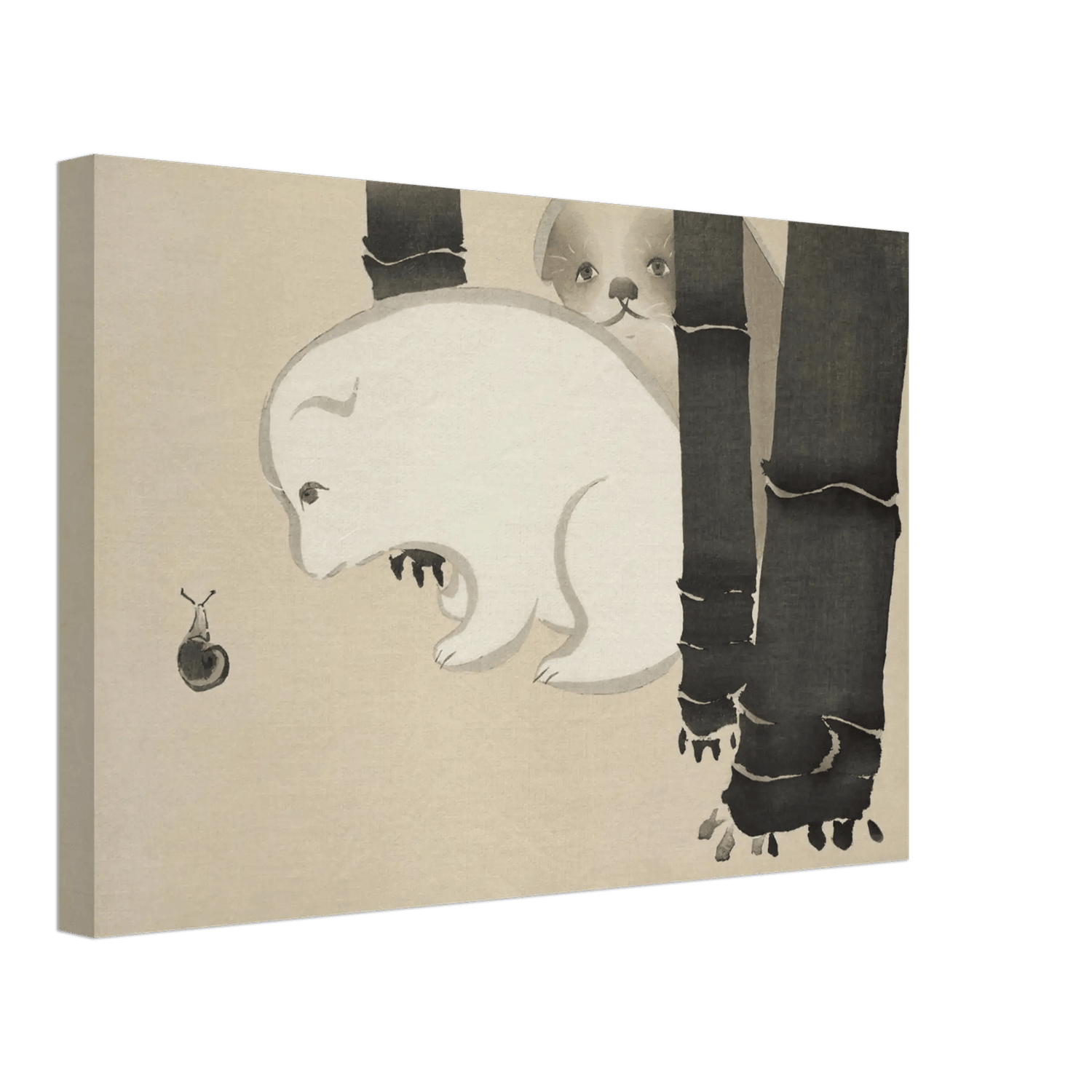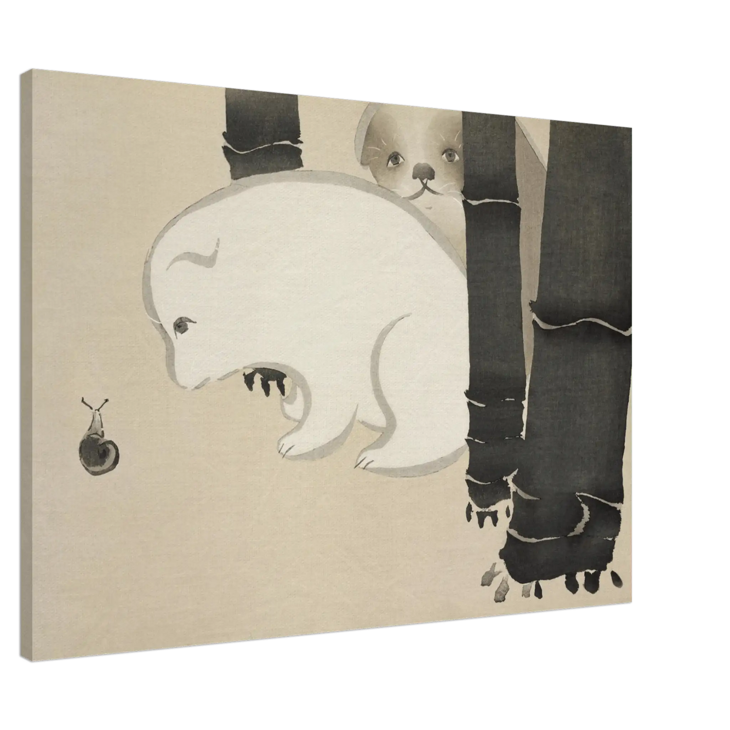 Hinter dunklen Bambusstämmen späht ein junger Hund hervor – neugierig und still zugleich. Vor ihm kriecht eine winzige Schnecke, die Szene ist leise, fast humorvoll, und doch voller Zärtlichkeit. Die weichen Linien und die Reduktion auf wenige Formen schaffen eine Atmosphäre von Reinheit und Ruhe.