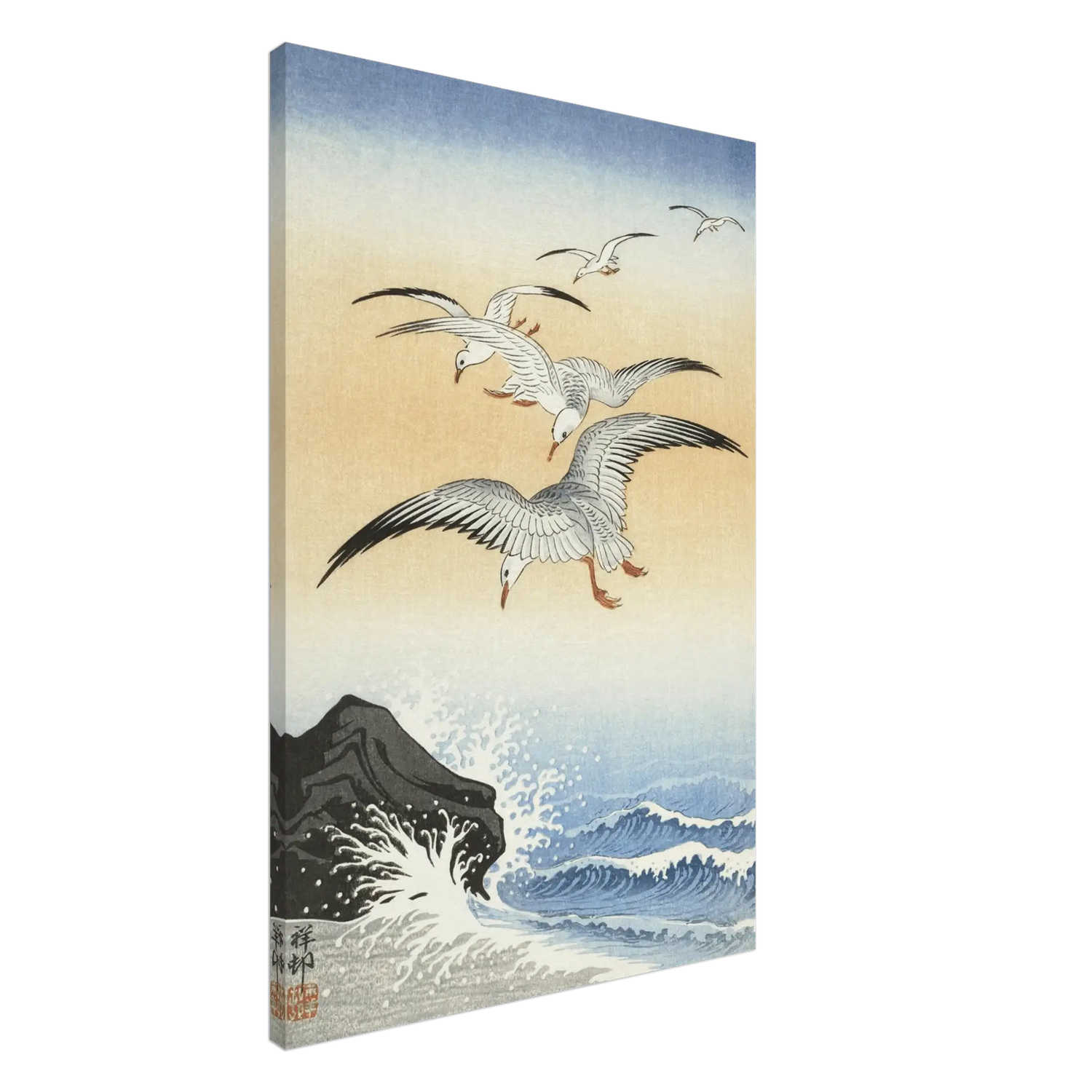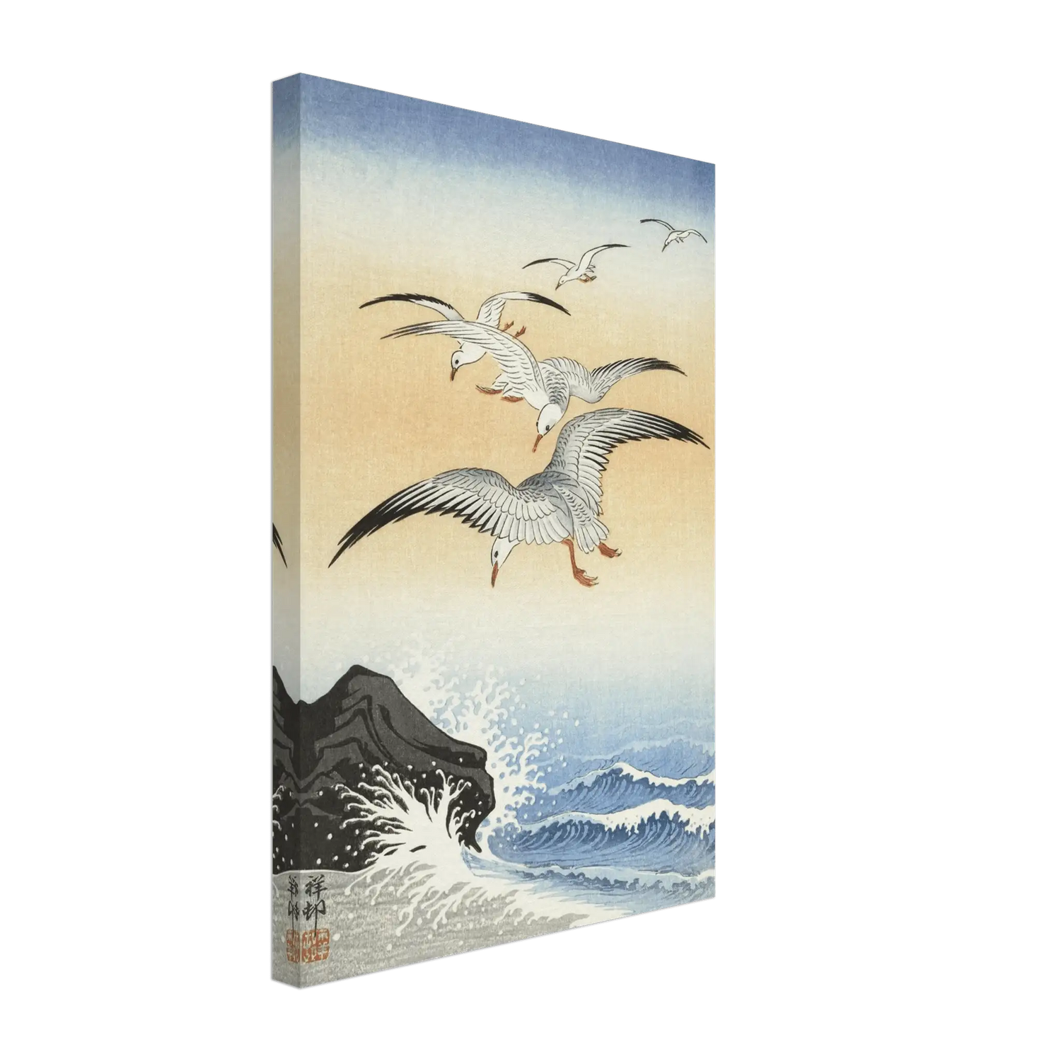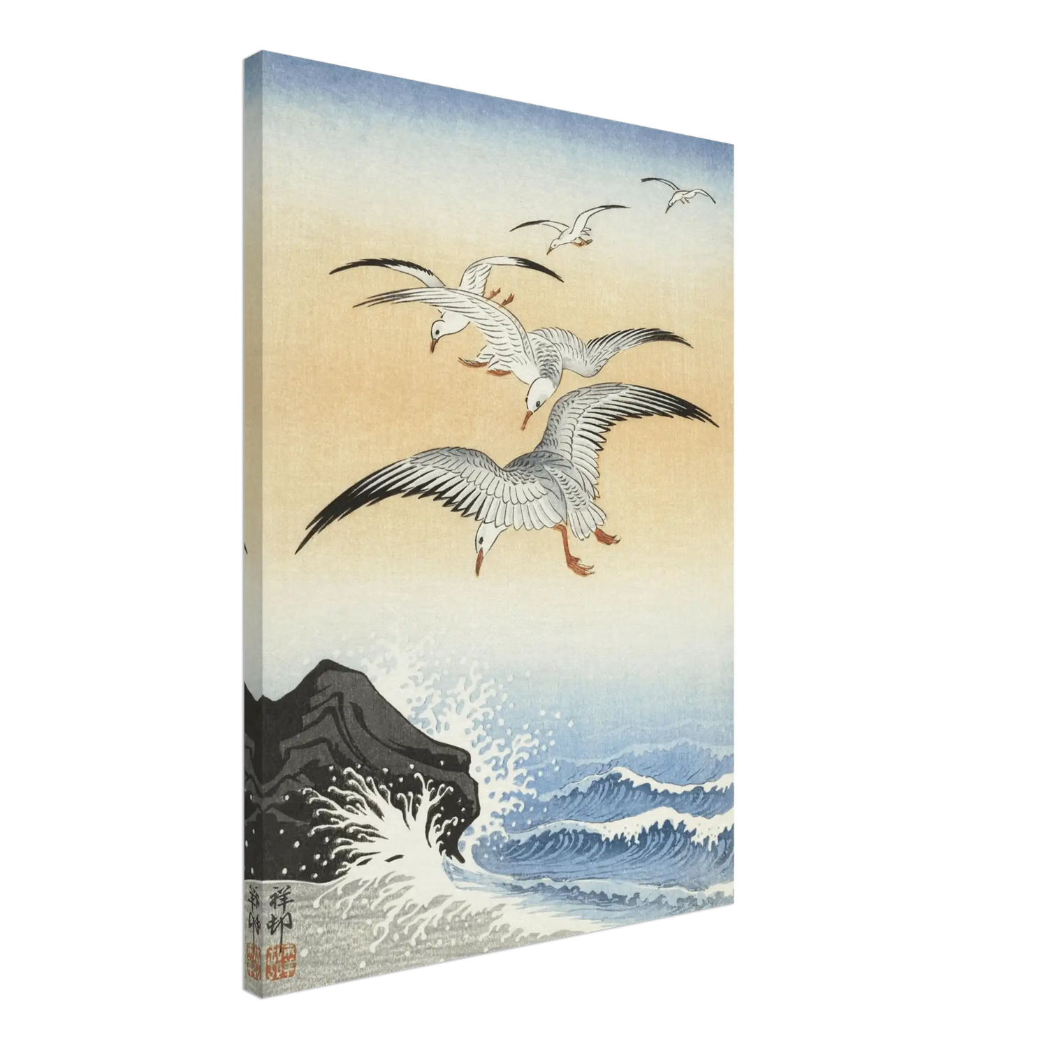 Dieses Werk stammt von Ohara Koson (1877–1945), dem Meister der Shin Hanga-Bewegung. In „Möwen über stürmischem Meer“ verbindet Koson die Kraft des Ozeans mit der Leichtigkeit des Fliegens.