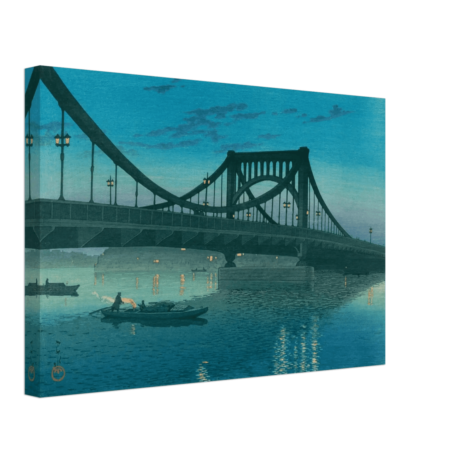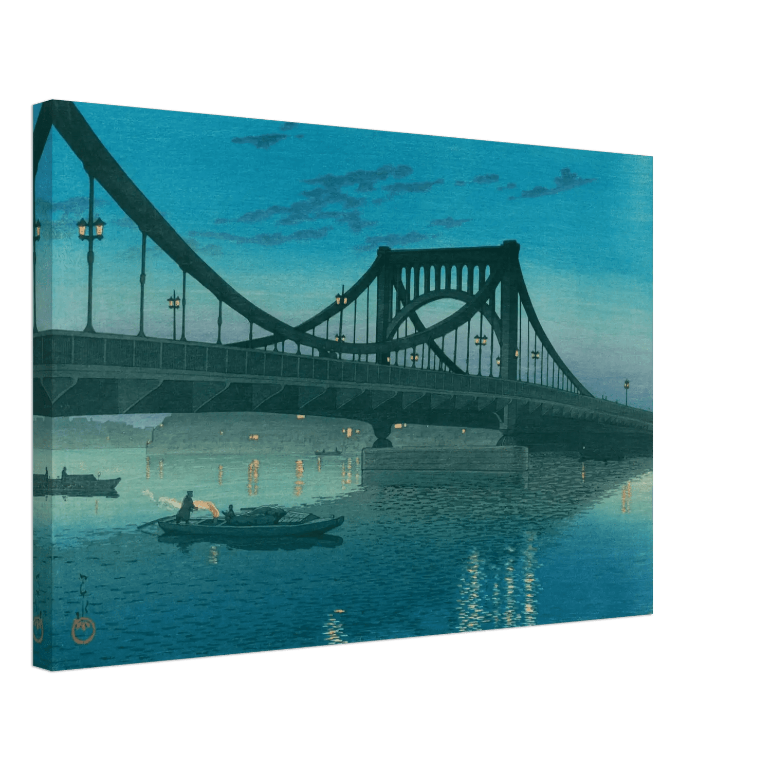 Das kühle Abendlicht spiegelt sich im Wasser des Sumida-Flusses, während die Brücke von Kiyosu in sanften Blautönen erstrahlt. Laternen glühen wie ferne Sterne, und ein Boot gleitet lautlos unter dem Stahlbogen hindurch. Kawase Hasui verbindet in dieser Szene moderne Architektur und poetische Stille – ein Sinnbild des Tokios der 1930er Jahre zwischen Tradition und Aufbruch.
