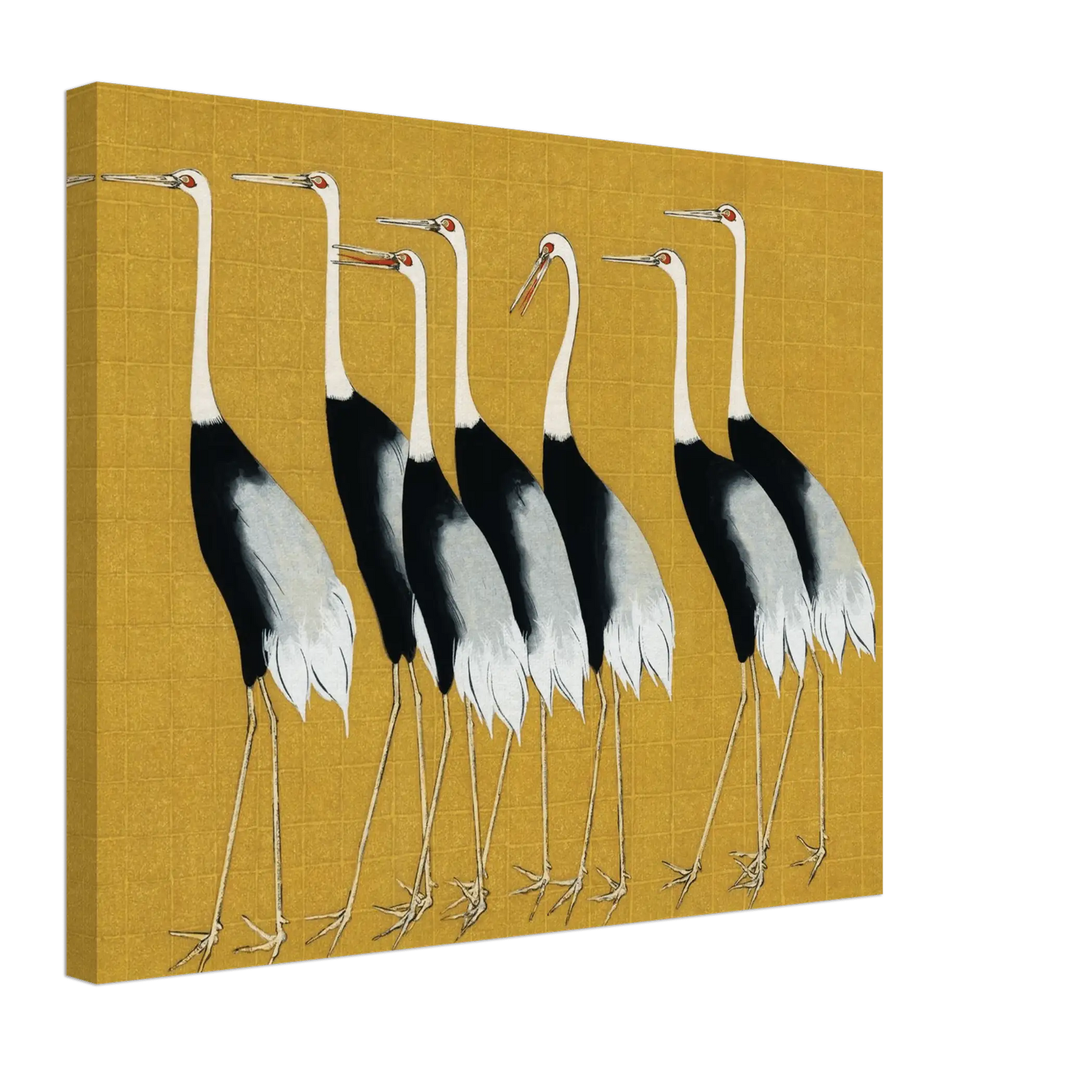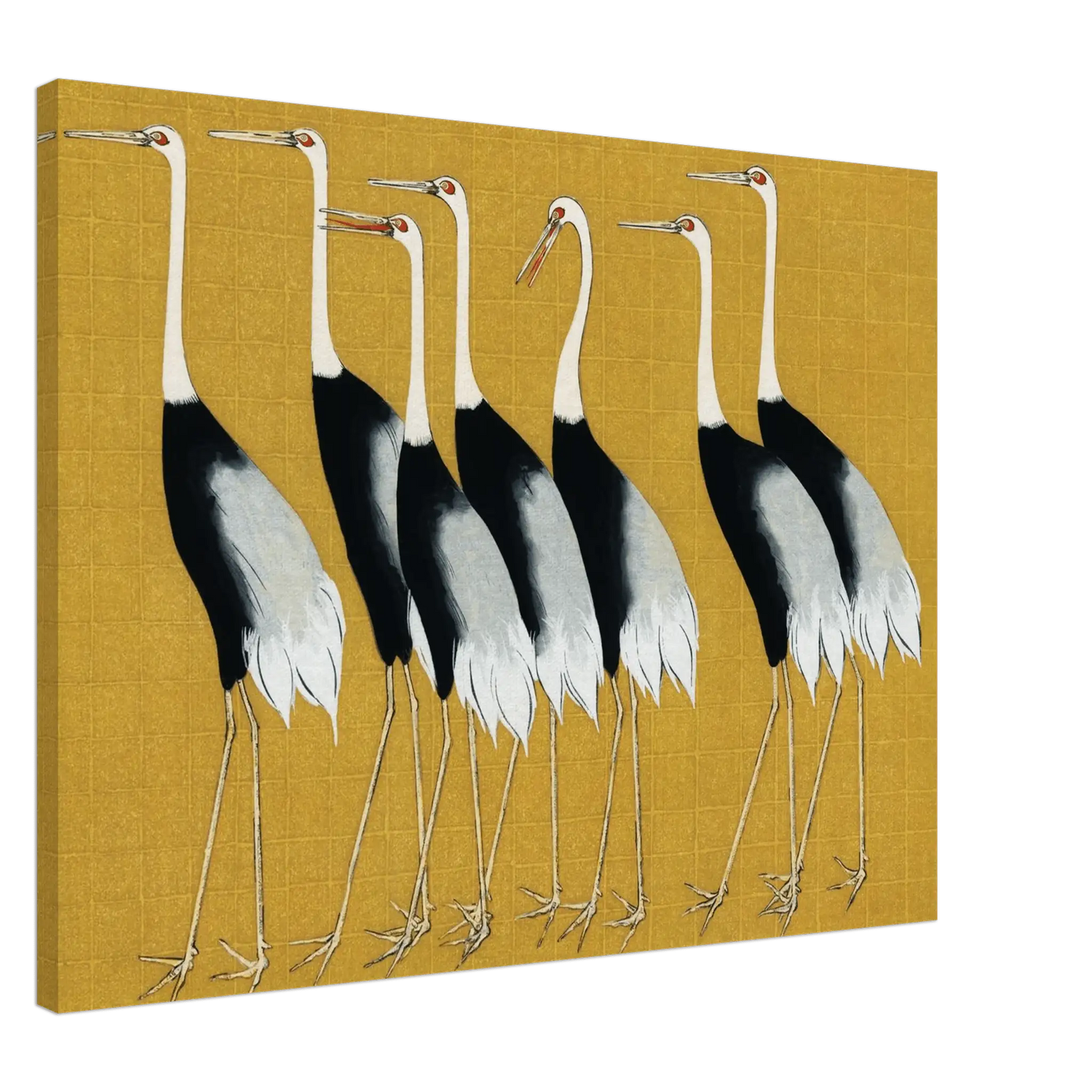 Sieben elegante Kraniche schreiten würdevoll über einen goldenen Hintergrund – ihre anmutige Haltung, die feinen Linien ihrer Flügel und die ruhige Balance der Komposition spiegeln vollkommene Harmonie wider.