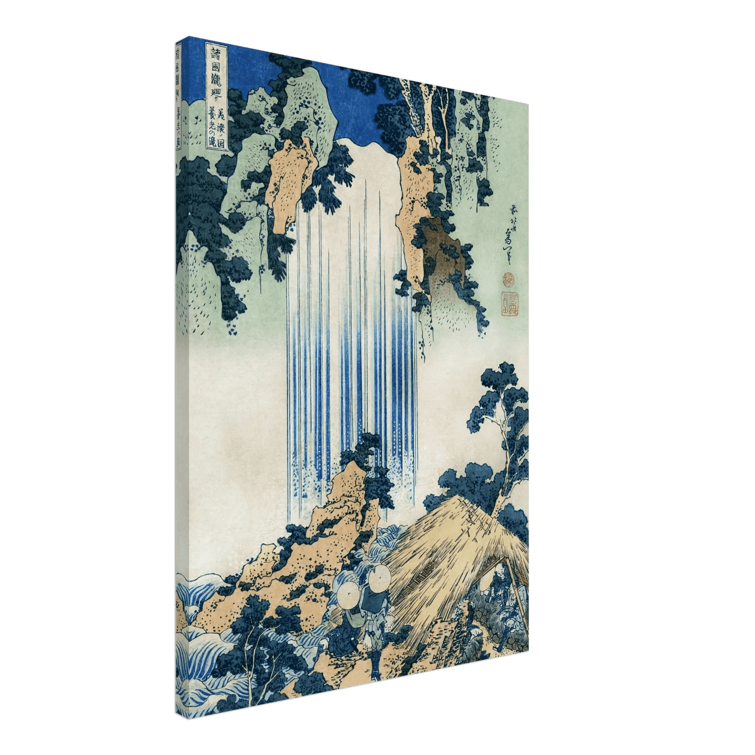 In „Yōrō-Wasserfall in Mino“ fängt er das Zusammenspiel zwischen Mensch und Natur in vollendeter Harmonie ein. Die senkrechten Linien des Wassers symbolisieren Reinheit und Beständigkeit, während die Landschaft durch die typisch tiefen Blautöne seiner aizuri-e-Technik lebendig wirkt.