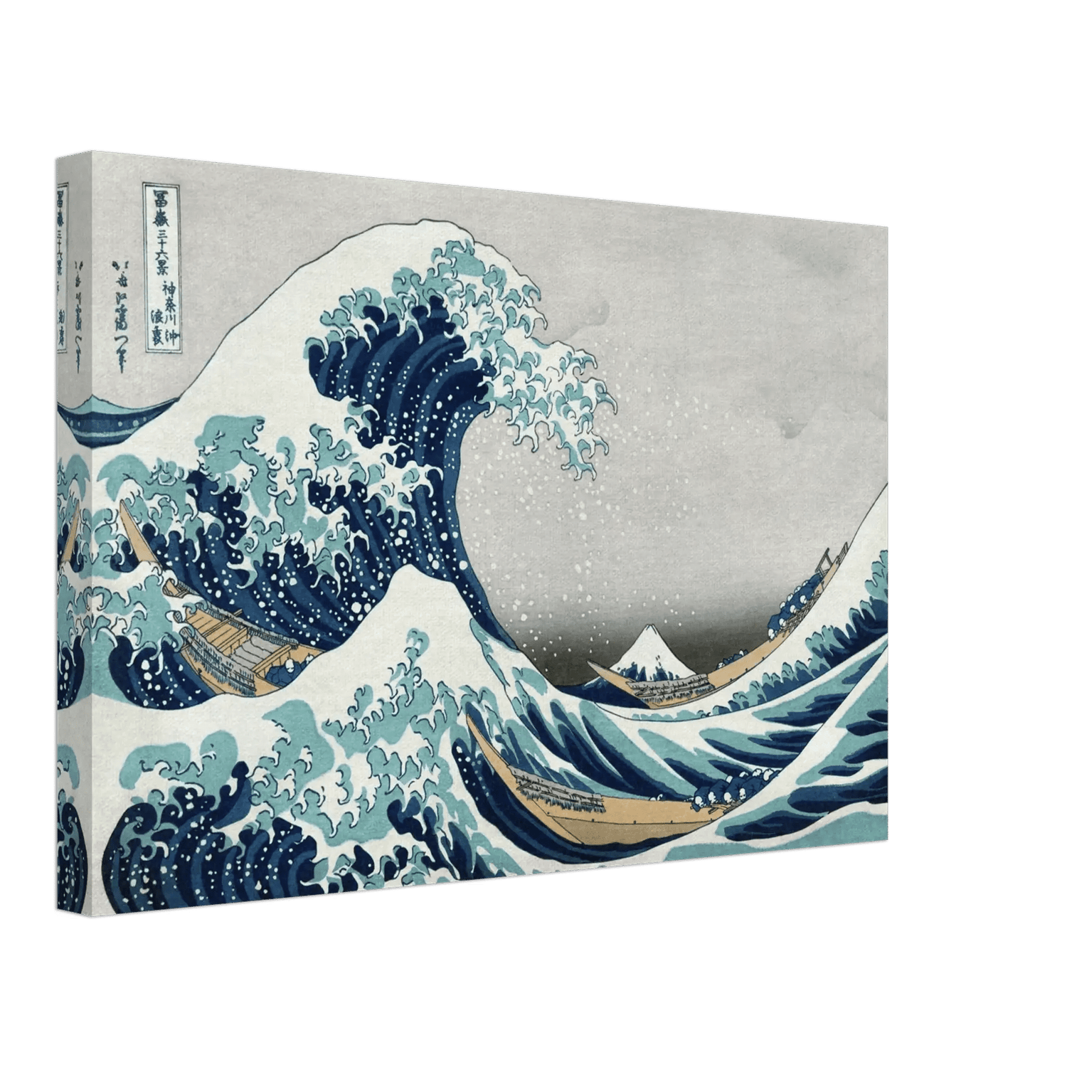 Eine gewaltige Welle erhebt sich drohend über kleine Fischerboote, ihre weißen Schaumkronen krümmen sich wie Krallen über dem Meer. Im Hintergrund, ruhig und unerschütterlich, steht der heilige Berg Fuji – Symbol der Beständigkeit inmitten des Chaos.