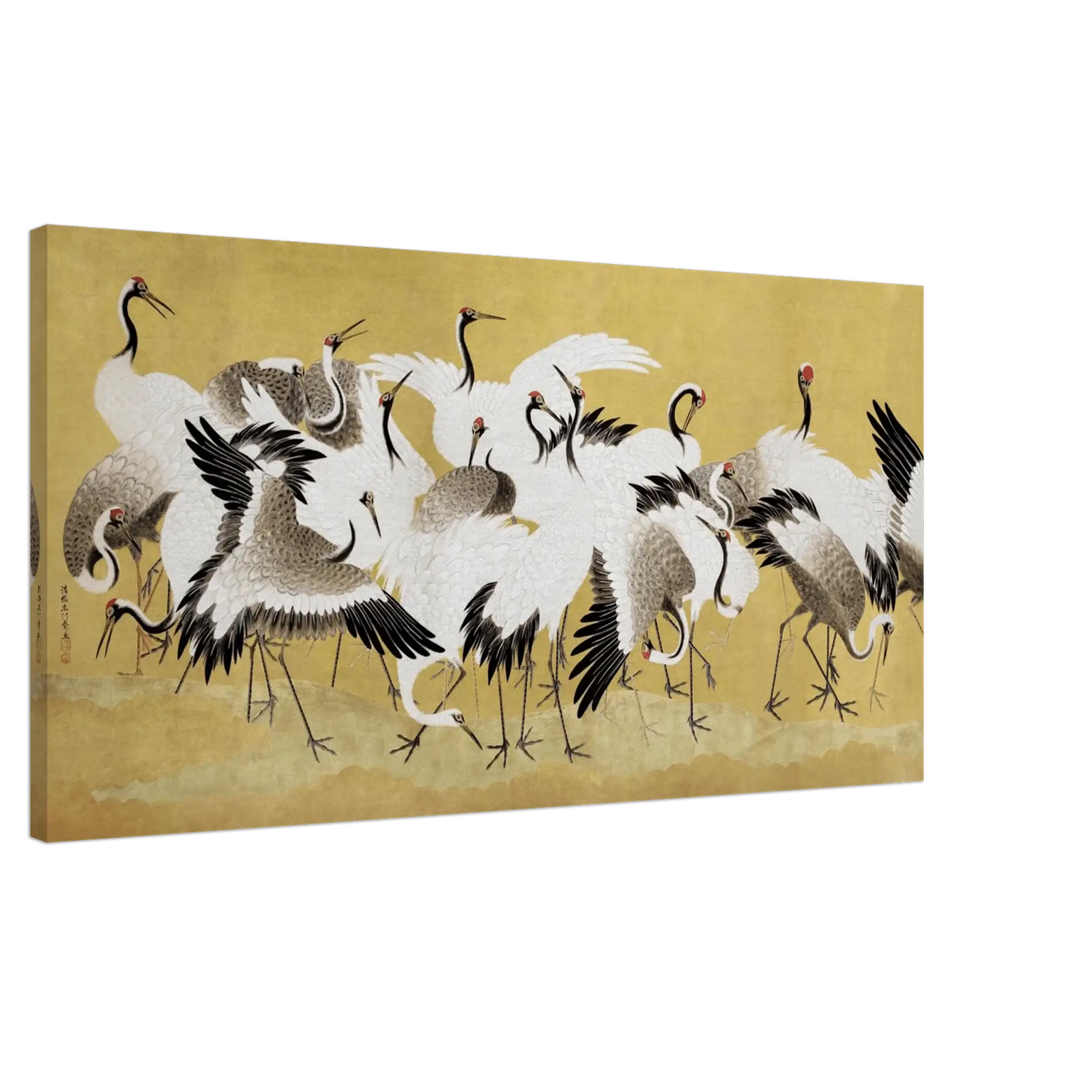 Dieses Werk stammt von Ishida Yūtei (1721–1786), einem Maler der Edo-Zeit, der für seine feine Linienführung und poetische Darstellung der Natur bekannt war. Seine Kraniche verkörpern die japanischen Ideale von Reinheit, Langlebigkeit und innerer Ruhe.