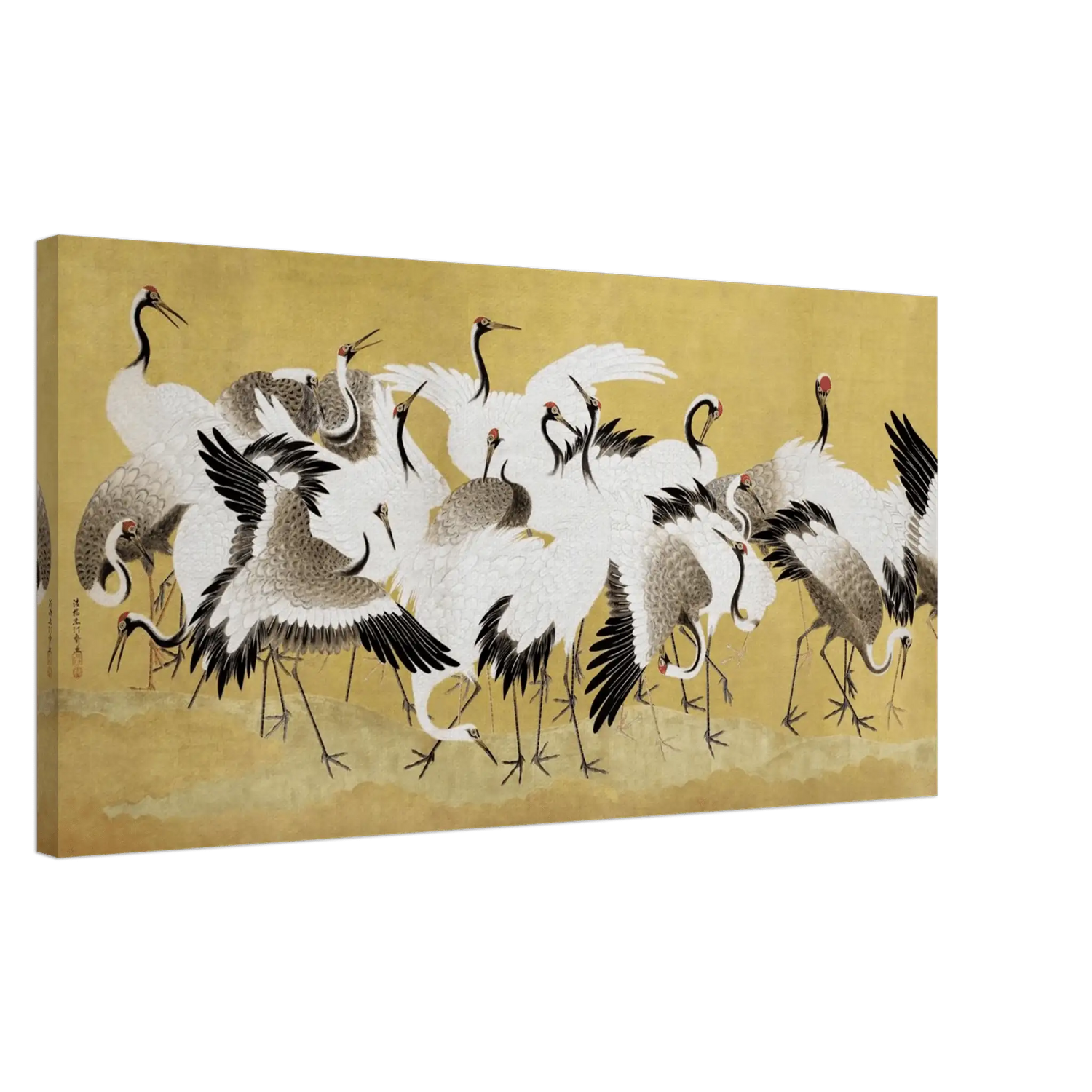 Ein Schwarm anmutiger Kraniche breitet seine Flügel aus, als würde die Zeit stillstehen. Die weißen Körper leuchten vor goldenem Hintergrund, während die feinen schwarzen und grauen Federn einen harmonischen Rhythmus aus Bewegung und Stille bilden.