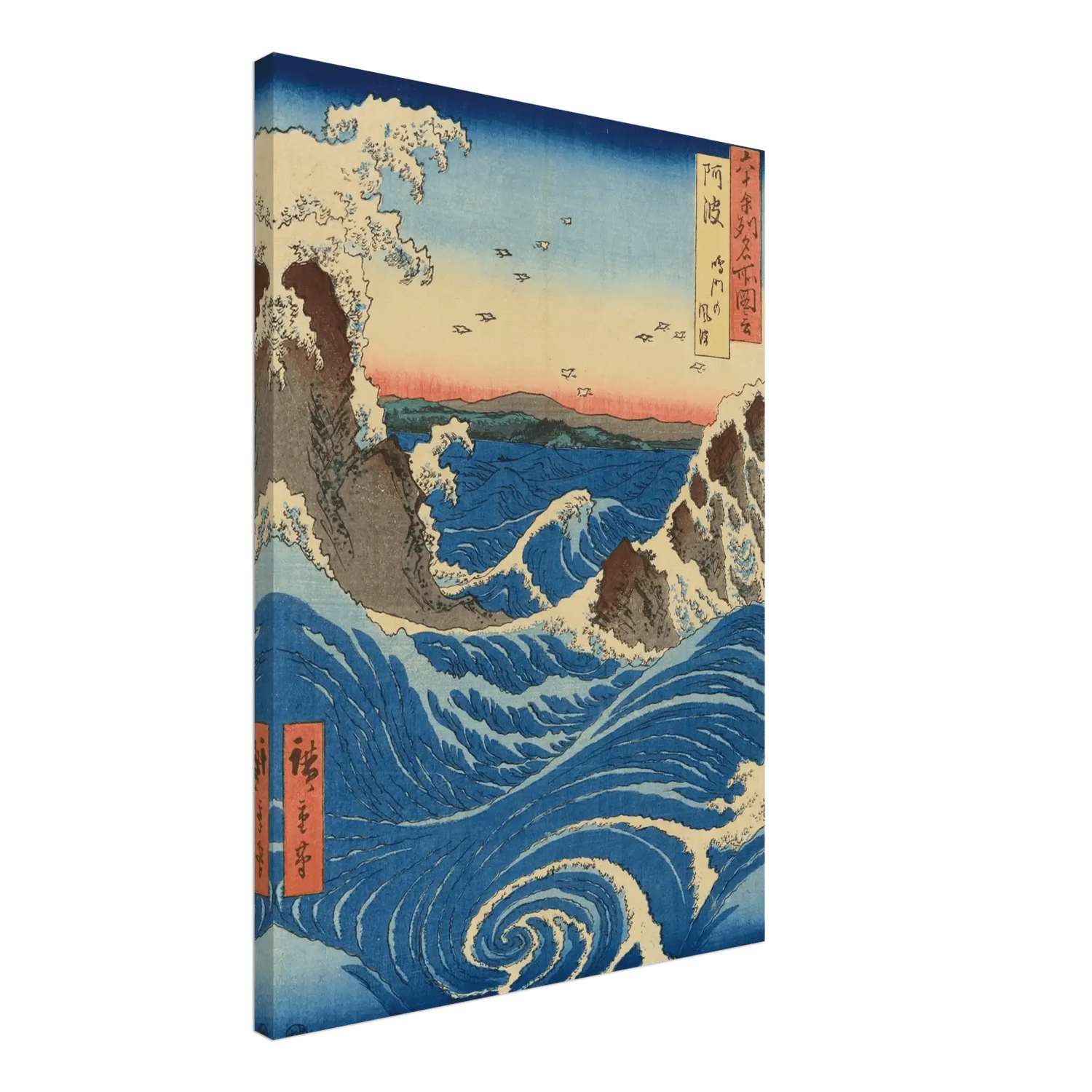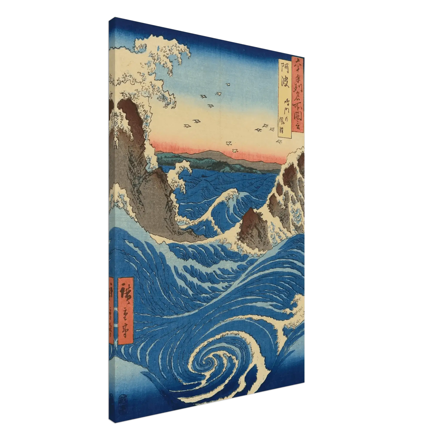 Dieses Werk stammt von Utagawa Hiroshige (1797–1858) und zeigt die berühmten Meeresstrudel von Naruto, einer Meerenge in der Provinz Awa (heute Tokushima). In meisterhafter Farbführung vereint Hiroshige die Dynamik der Natur mit einem Gefühl stiller Erhabenheit – das endlose Spiel zwischen Kraft und Gleichgewicht.