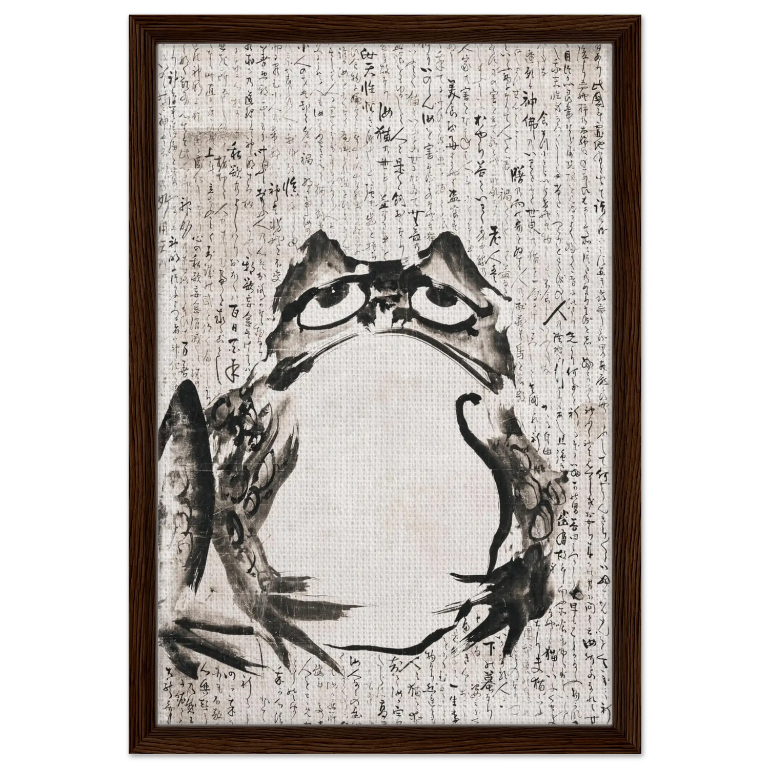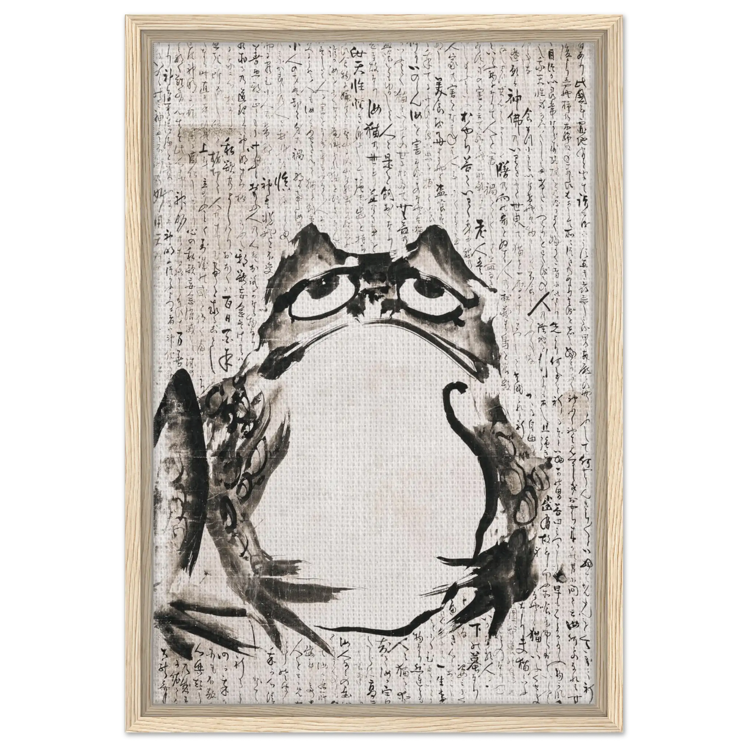 Ein Frosch, mit wenigen kraftvollen Pinselstrichen gezeichnet, sitzt im Zentrum einer Fläche aus dichter japanischer Kalligrafie. Sein Ausdruck ist zugleich ruhig und lebendig, als würde er aus dem Meer der Worte heraustreten. Die Kombination aus Tusche, Leerraum und Schrift erschafft eine einzigartige Balance zwischen Bewegung und Stille.