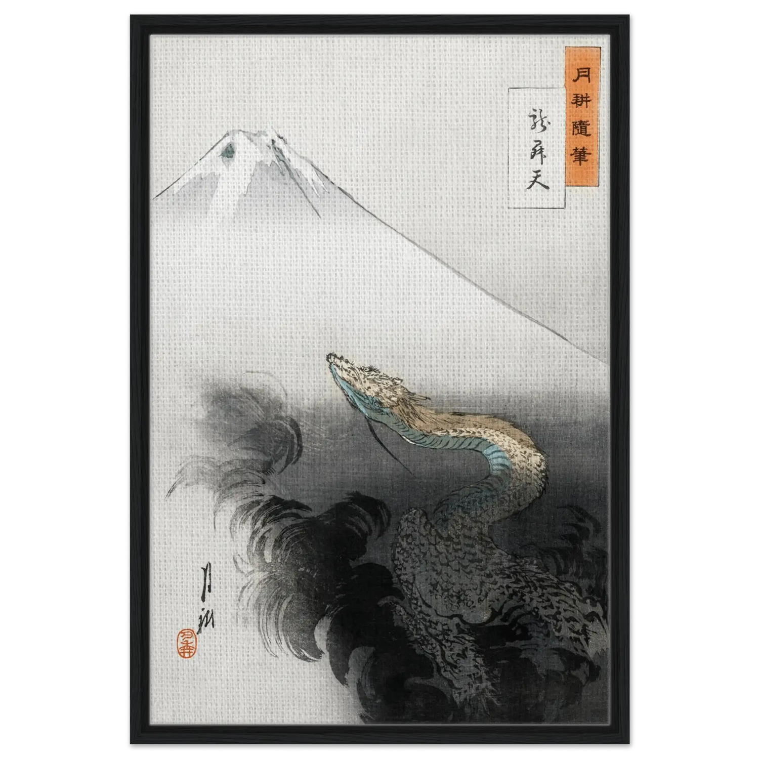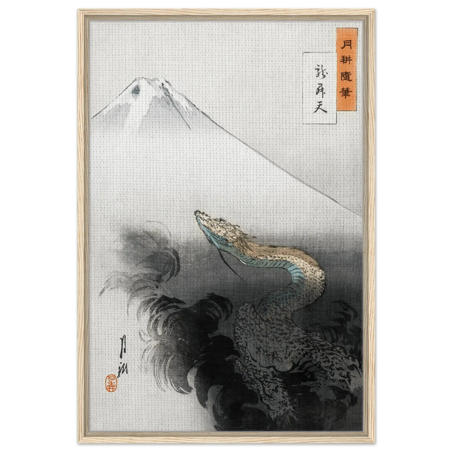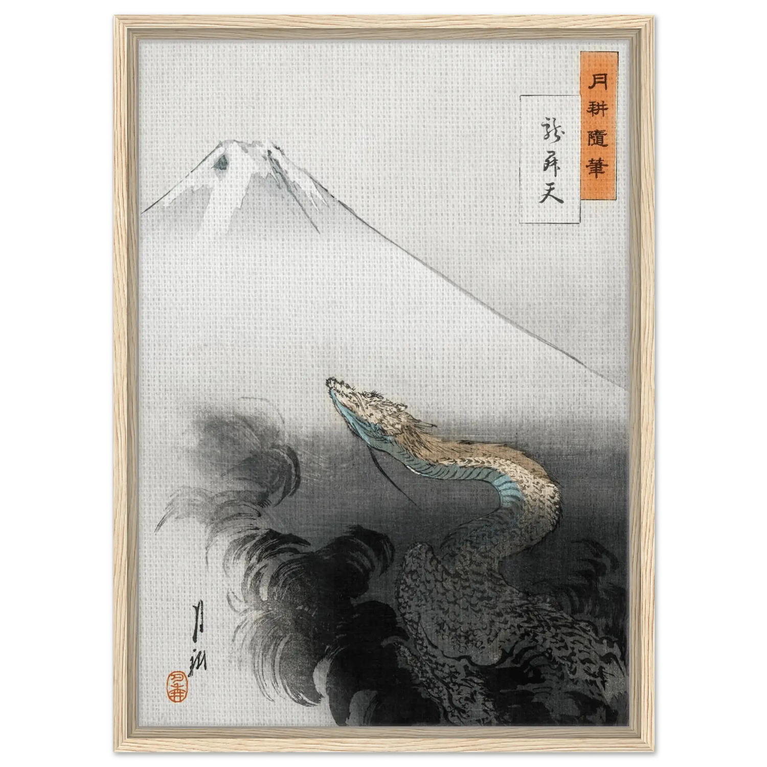 Ein mächtiger Drache erhebt sich aus dunklen Wolken und richtet seinen Blick empor zum heiligen Berg Fuji, der in kühlem Weiß über der Szene schwebt. Zwischen Licht und Schatten entsteht ein Moment von Bewegung und Stille – der Drache, Sinnbild göttlicher Kraft, steigt aus der Erde zum Himmel auf.