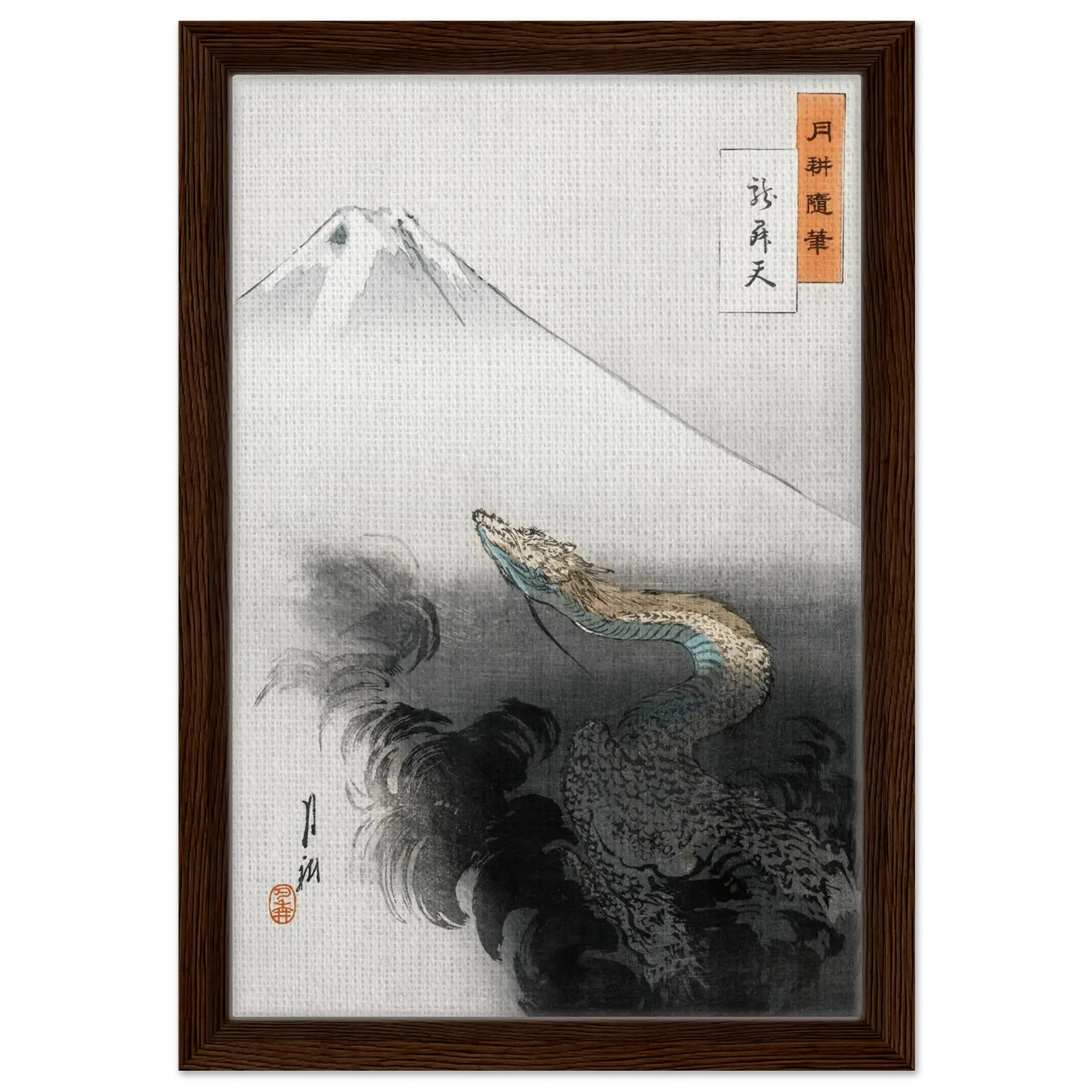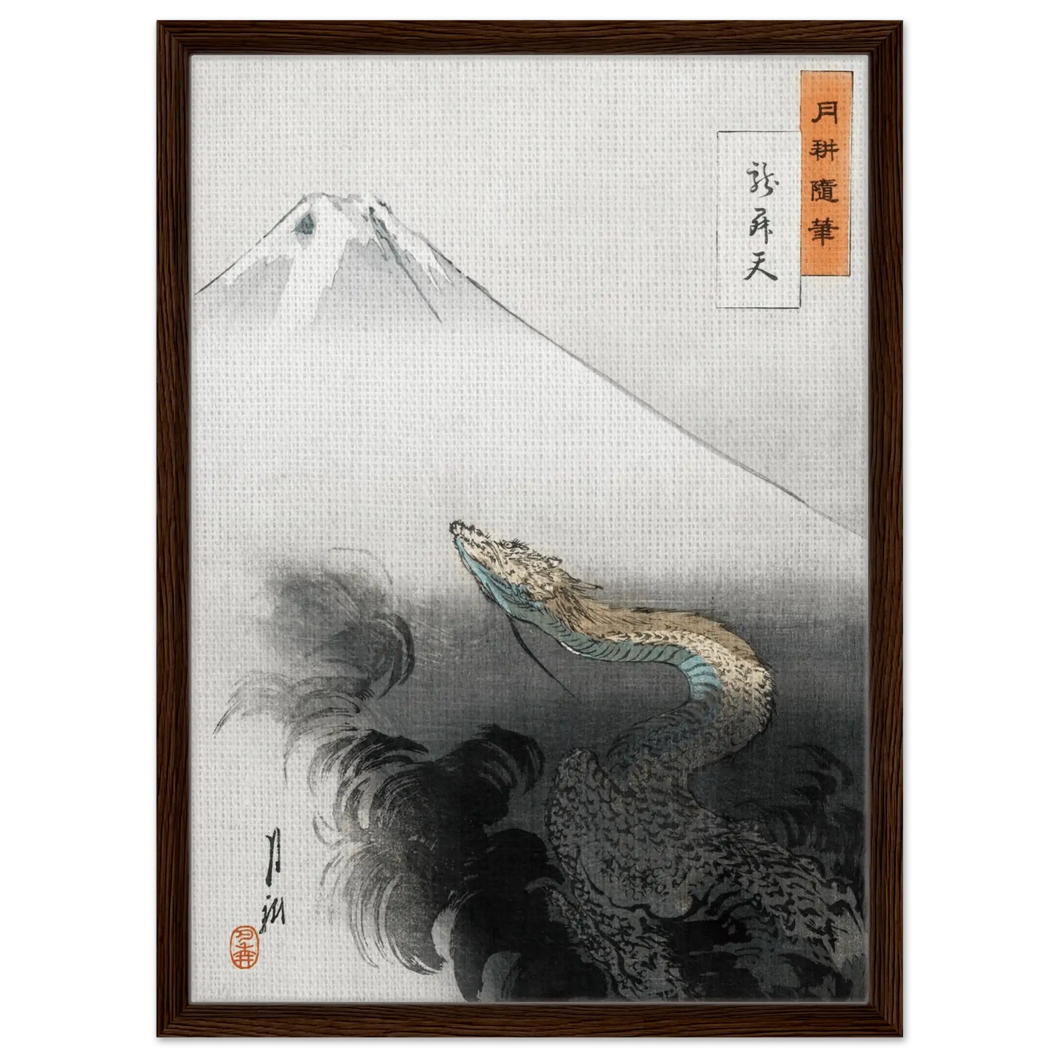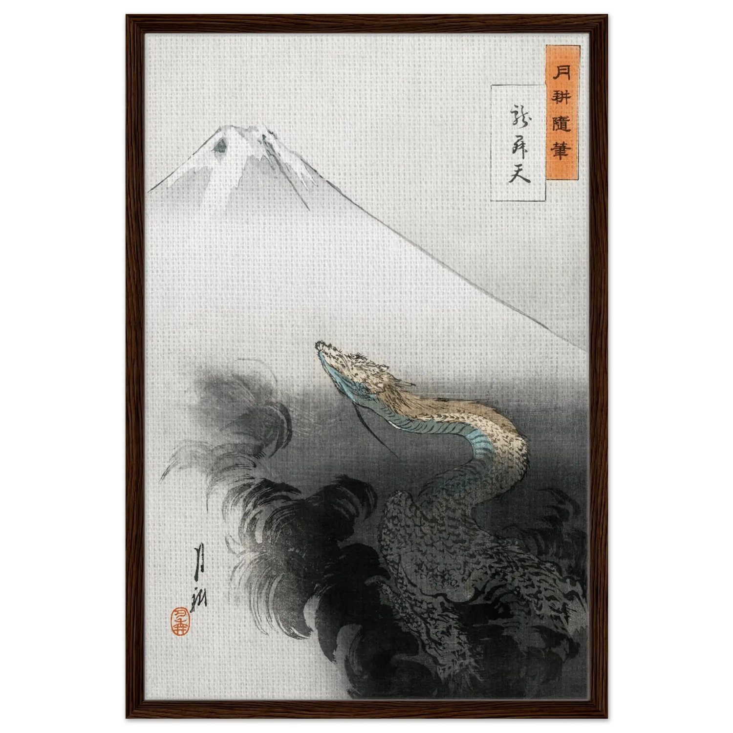 Ein mächtiger Drache erhebt sich aus dunklen Wolken und richtet seinen Blick empor zum heiligen Berg Fuji, der in kühlem Weiß über der Szene schwebt. Zwischen Licht und Schatten entsteht ein Moment von Bewegung und Stille – der Drache, Sinnbild göttlicher Kraft, steigt aus der Erde zum Himmel auf.