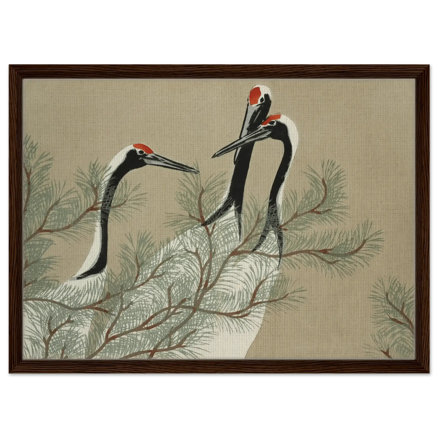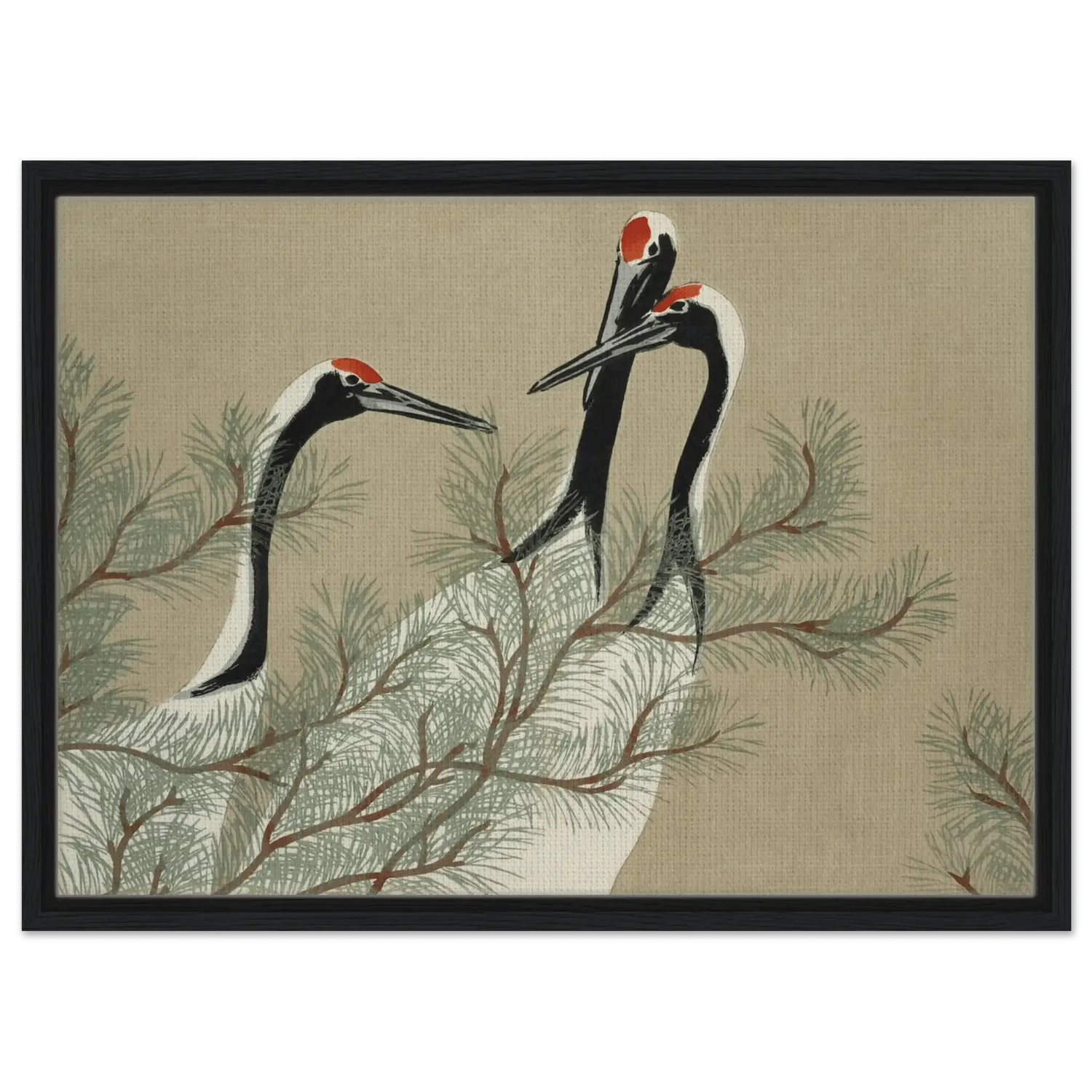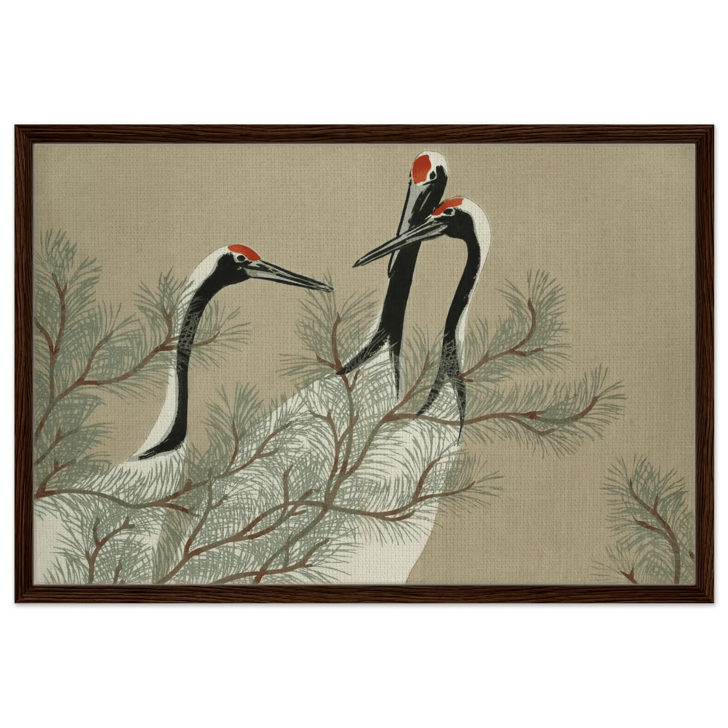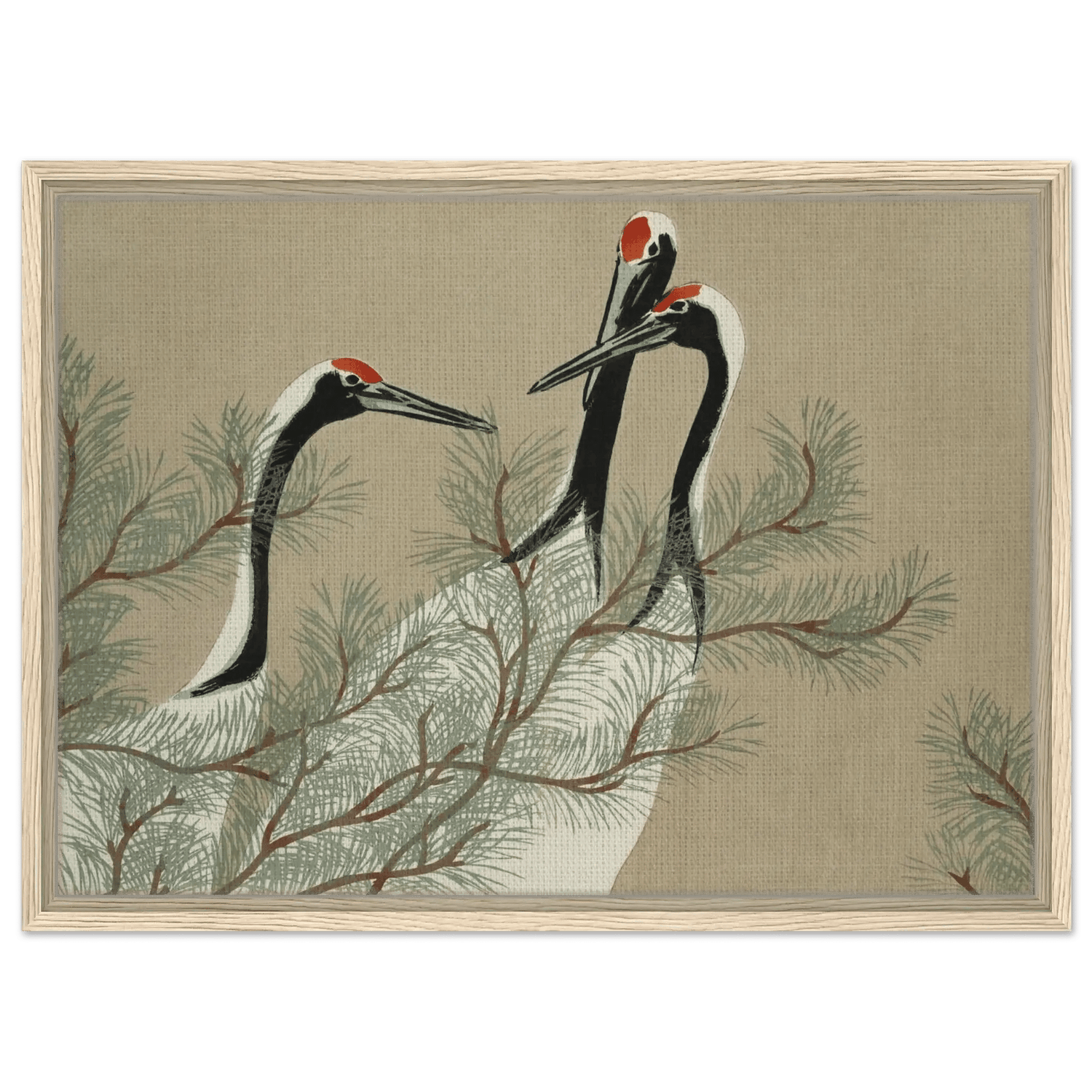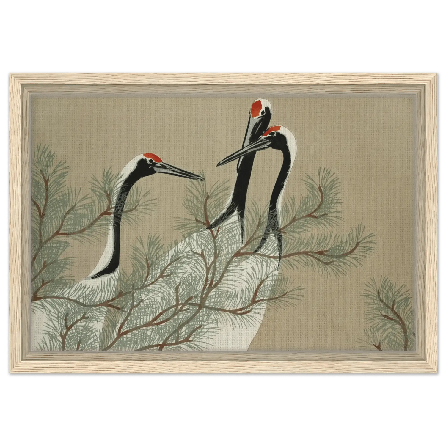 Drei Kraniche erheben ihre schlanken Hälse zwischen den weichen Nadeln einer Kiefer. Ihre Körper sind in zarten Weiß- und Schwarztönen gehalten, während leuchtendes Rot auf ihren Köpfen wie ein stilles Symbol der Lebenskraft schimmert.