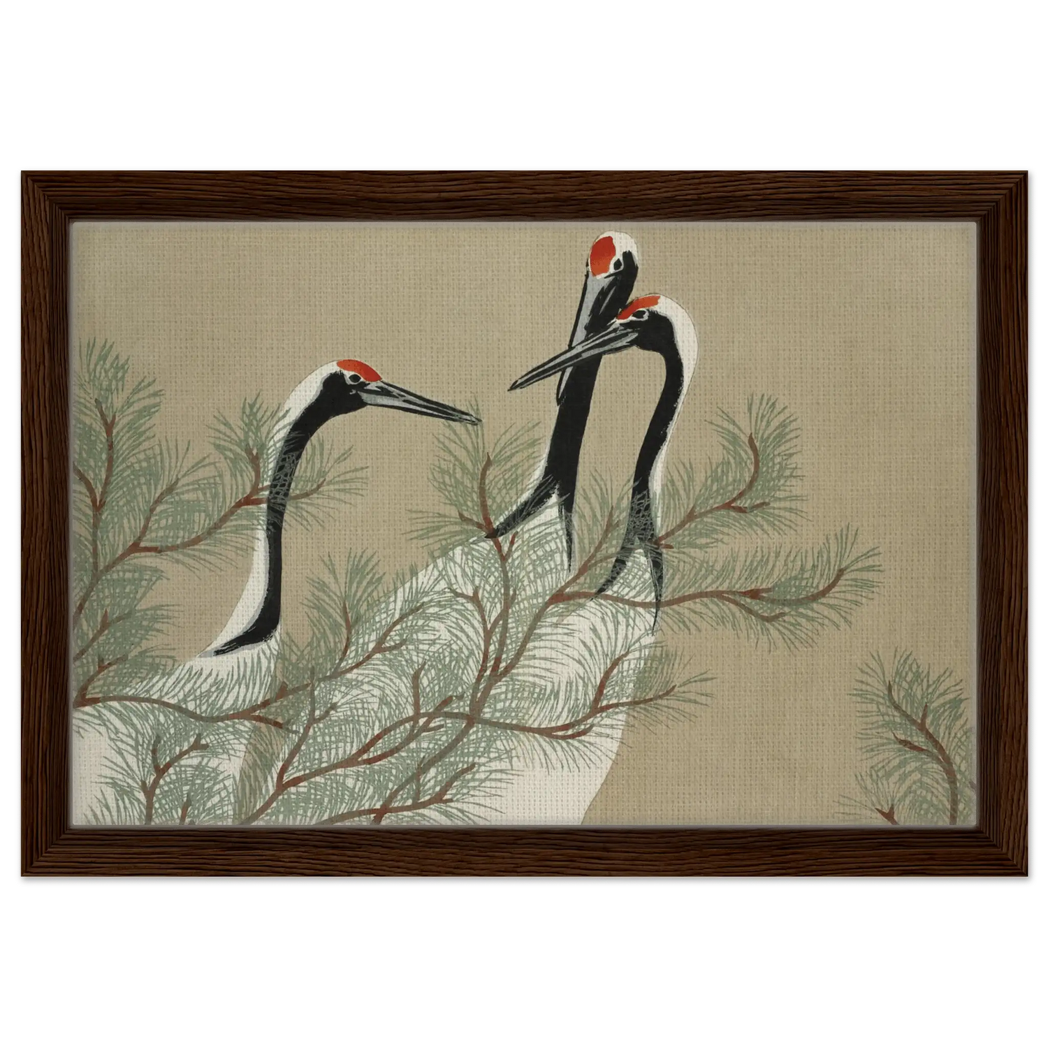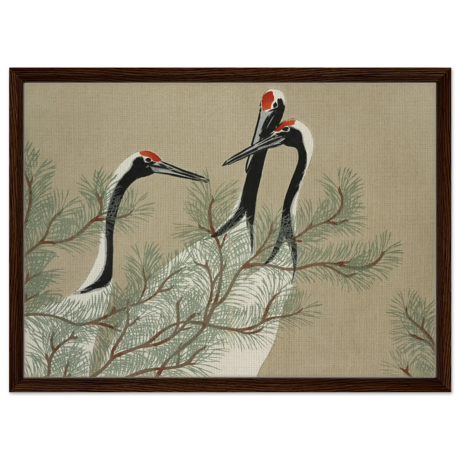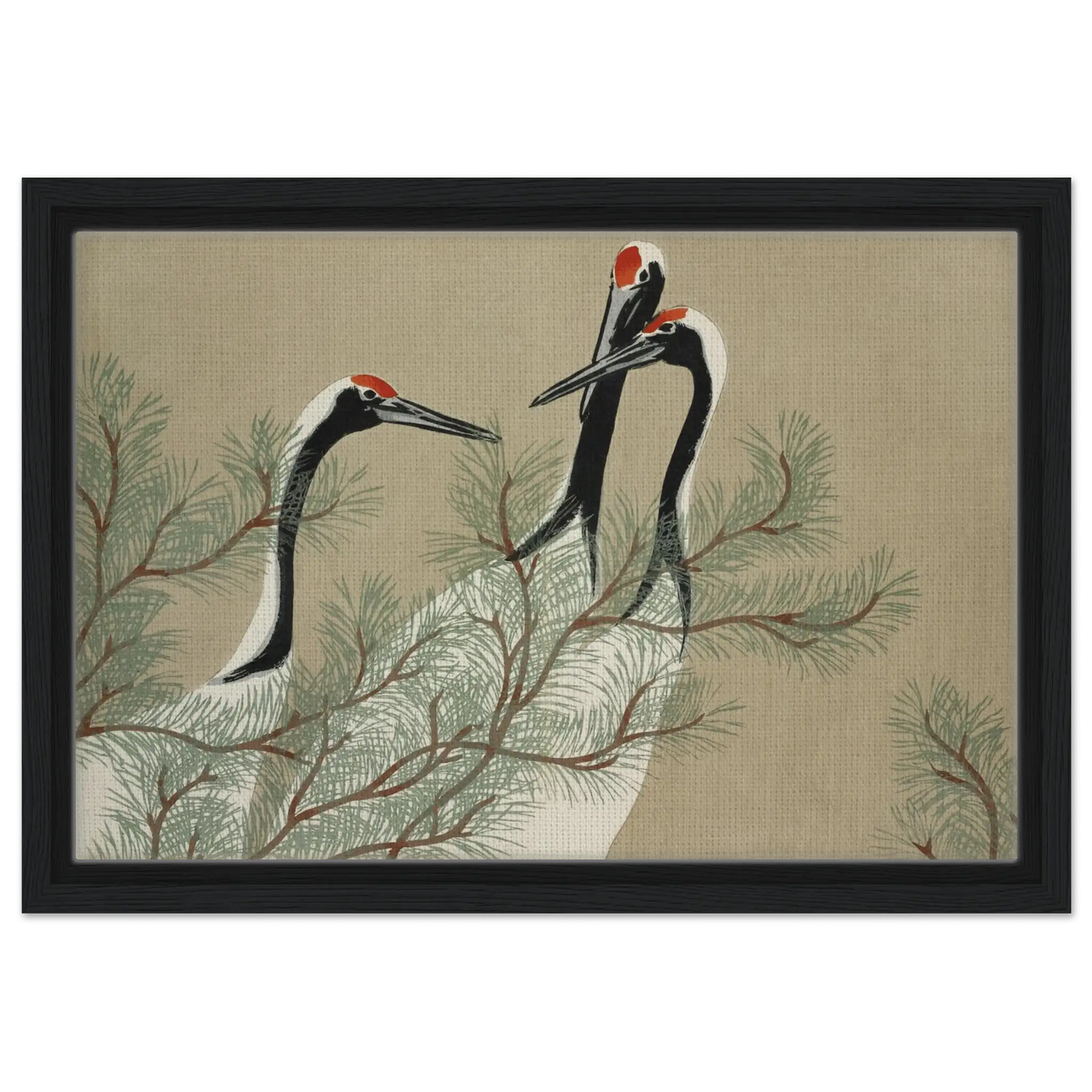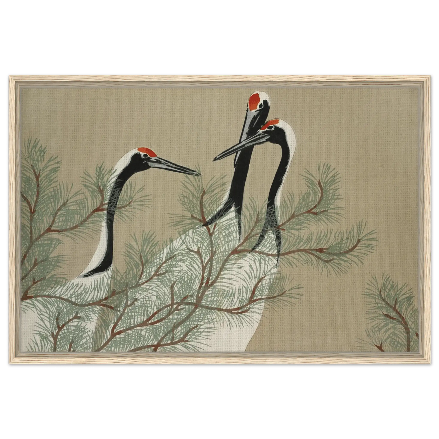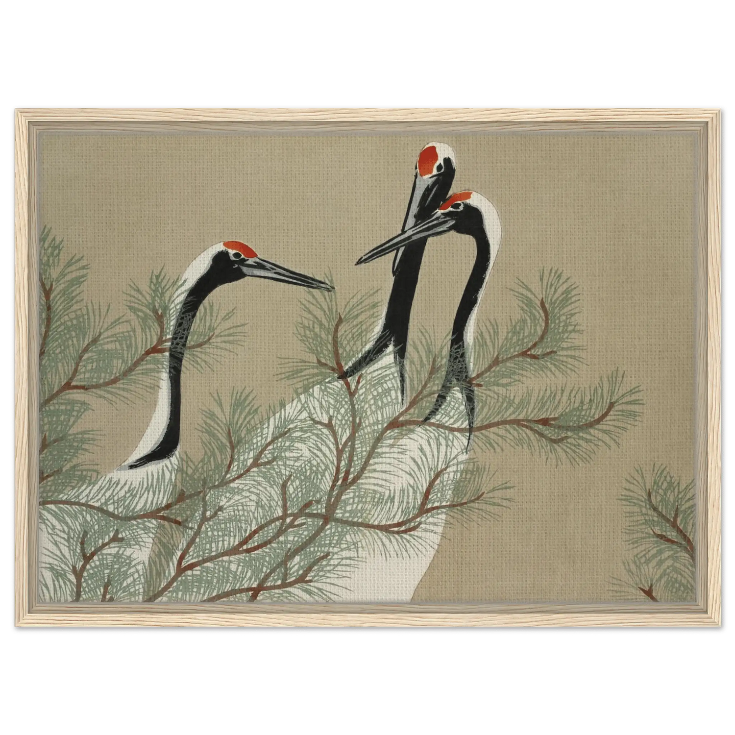 Drei Kraniche erheben ihre schlanken Hälse zwischen den weichen Nadeln einer Kiefer. Ihre Körper sind in zarten Weiß- und Schwarztönen gehalten, während leuchtendes Rot auf ihren Köpfen wie ein stilles Symbol der Lebenskraft schimmert.