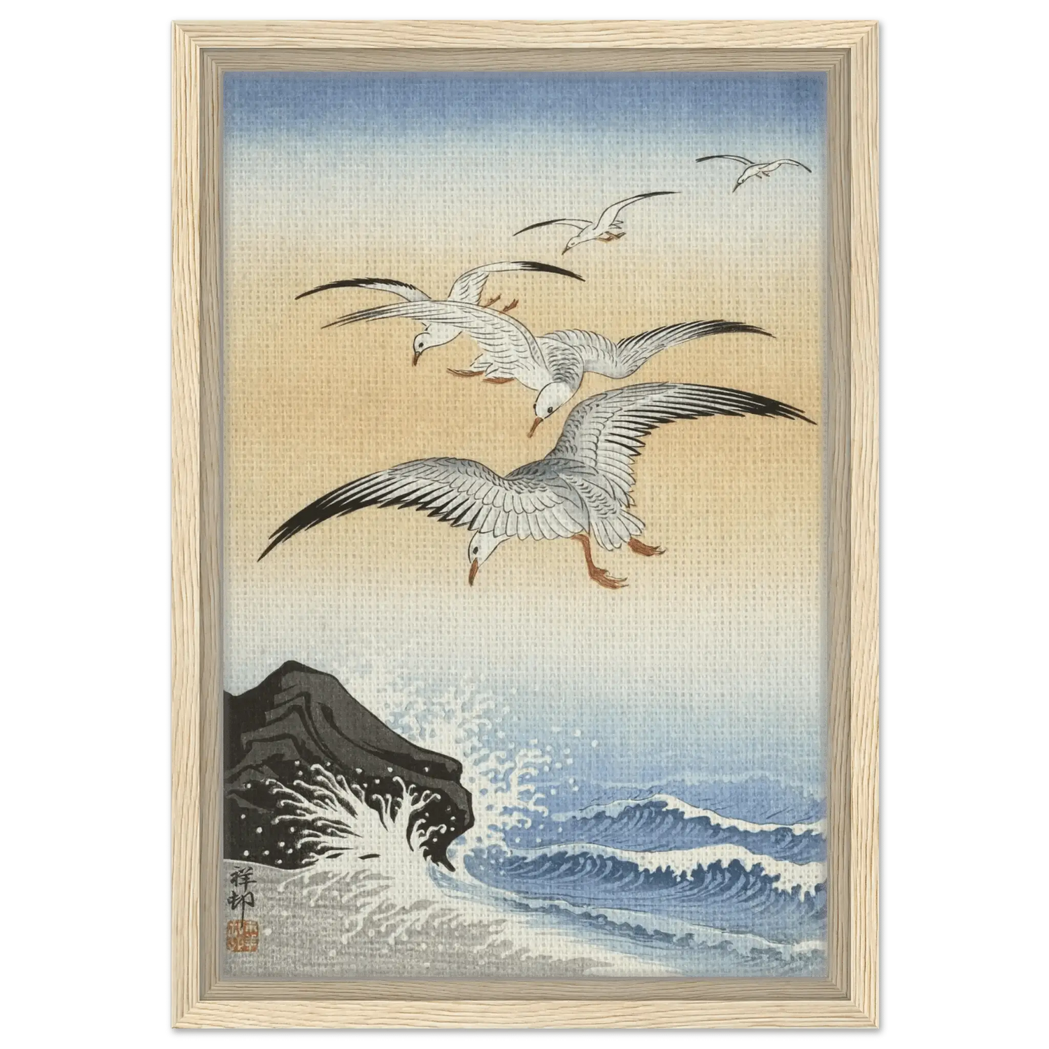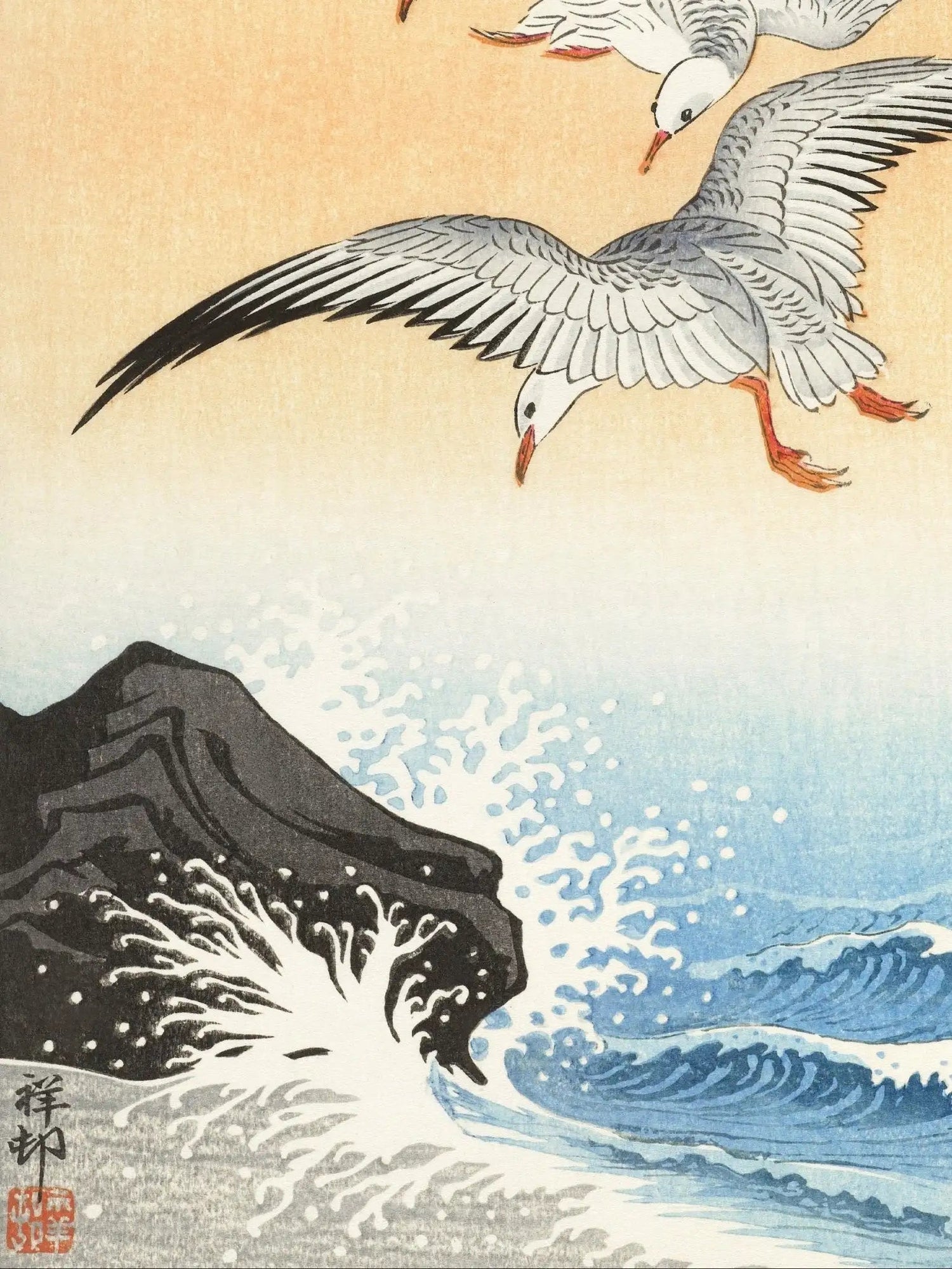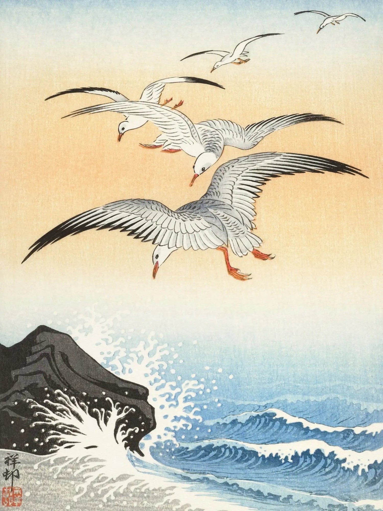 Dieses Werk stammt von Ohara Koson (1877–1945), dem Meister der Shin Hanga-Bewegung. In „Möwen über stürmischem Meer“ verbindet Koson die Kraft des Ozeans mit der Leichtigkeit des Fliegens.