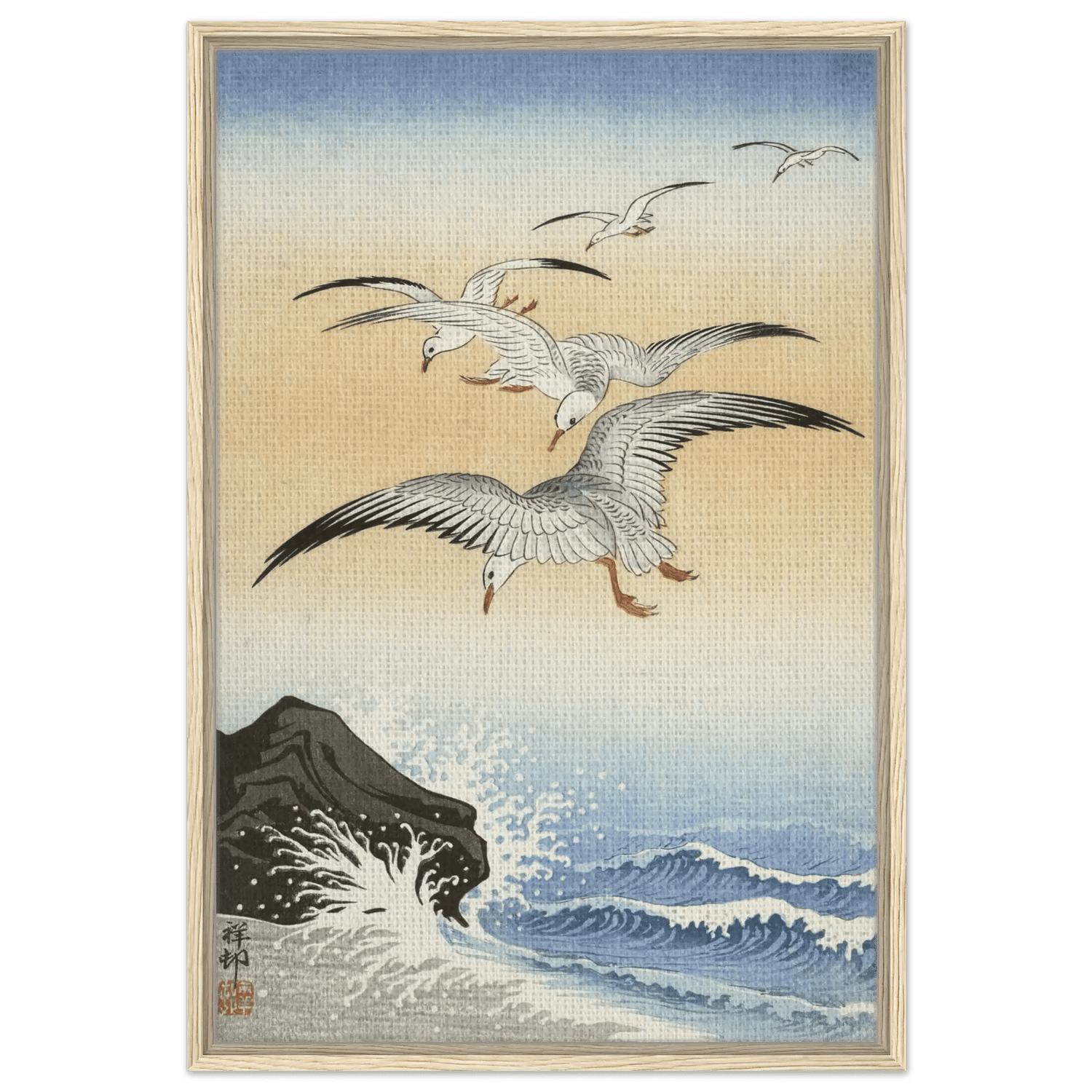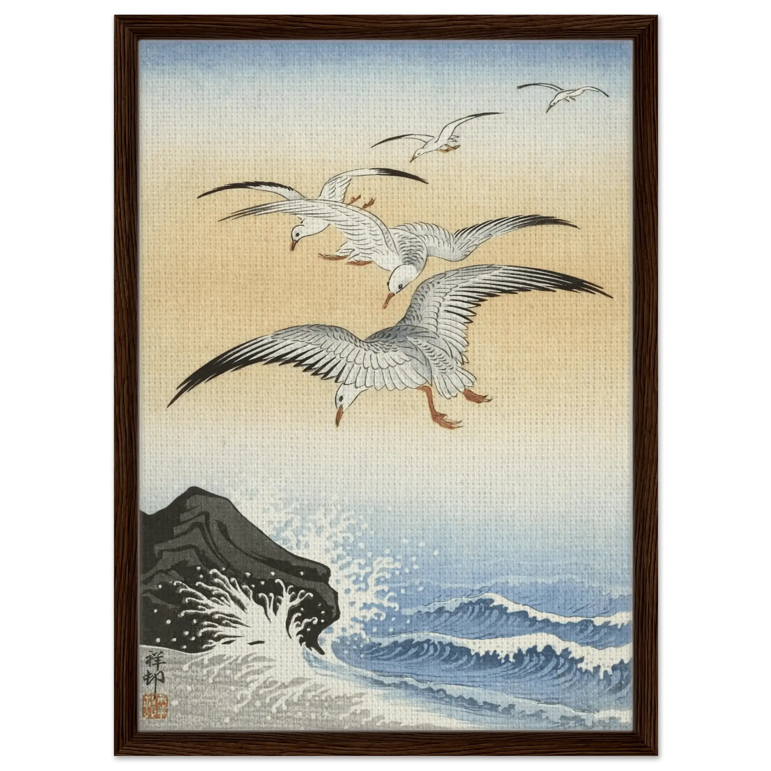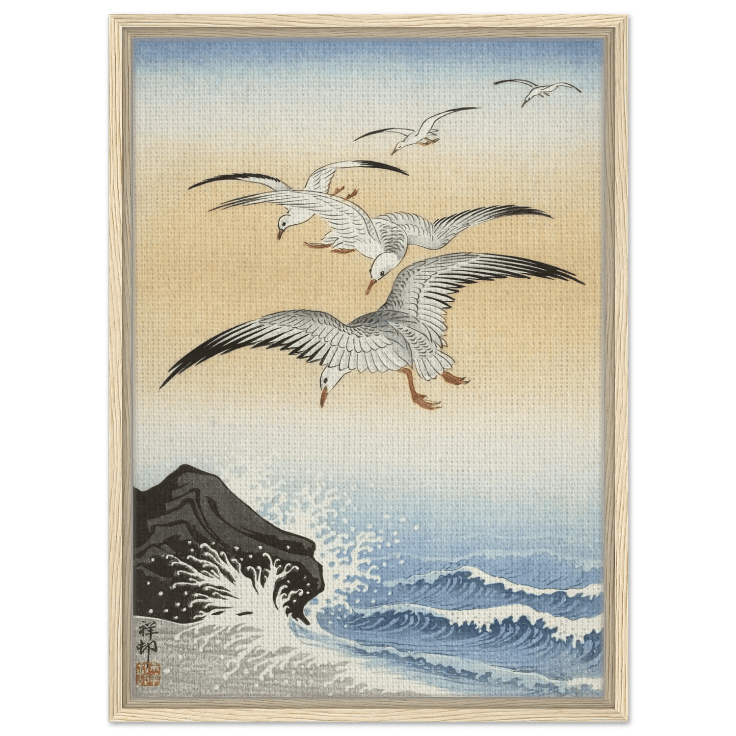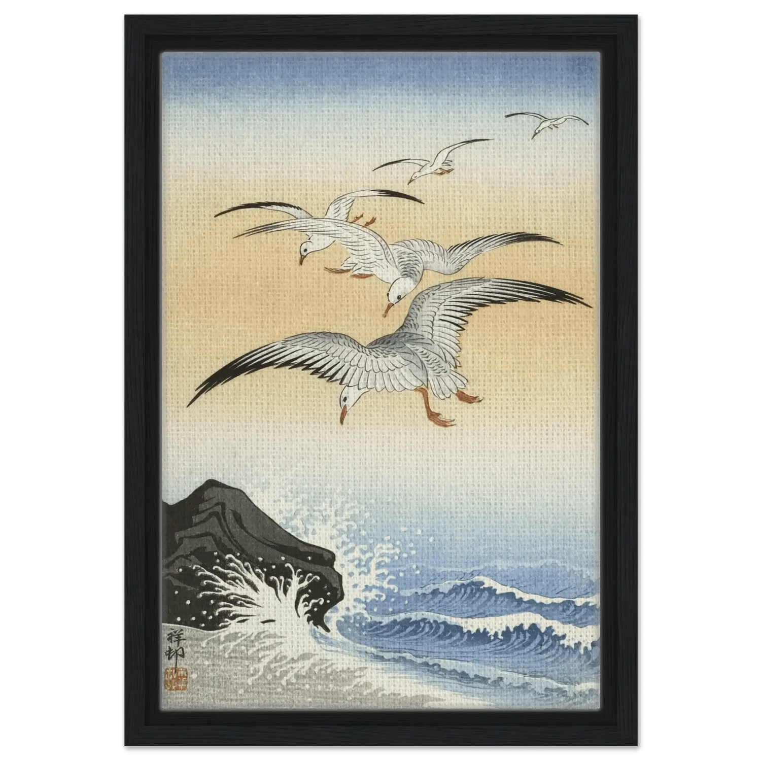 Dieses Werk stammt von Ohara Koson (1877–1945), dem Meister der Shin Hanga-Bewegung. In „Möwen über stürmischem Meer“ verbindet Koson die Kraft des Ozeans mit der Leichtigkeit des Fliegens.