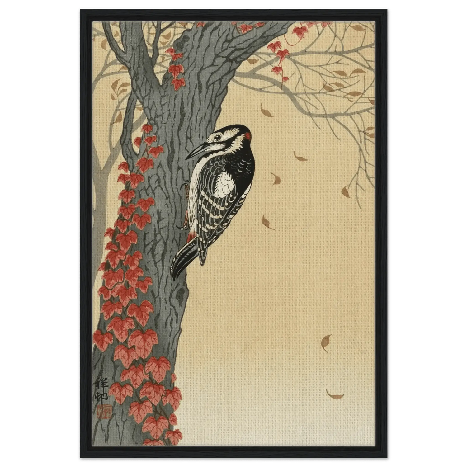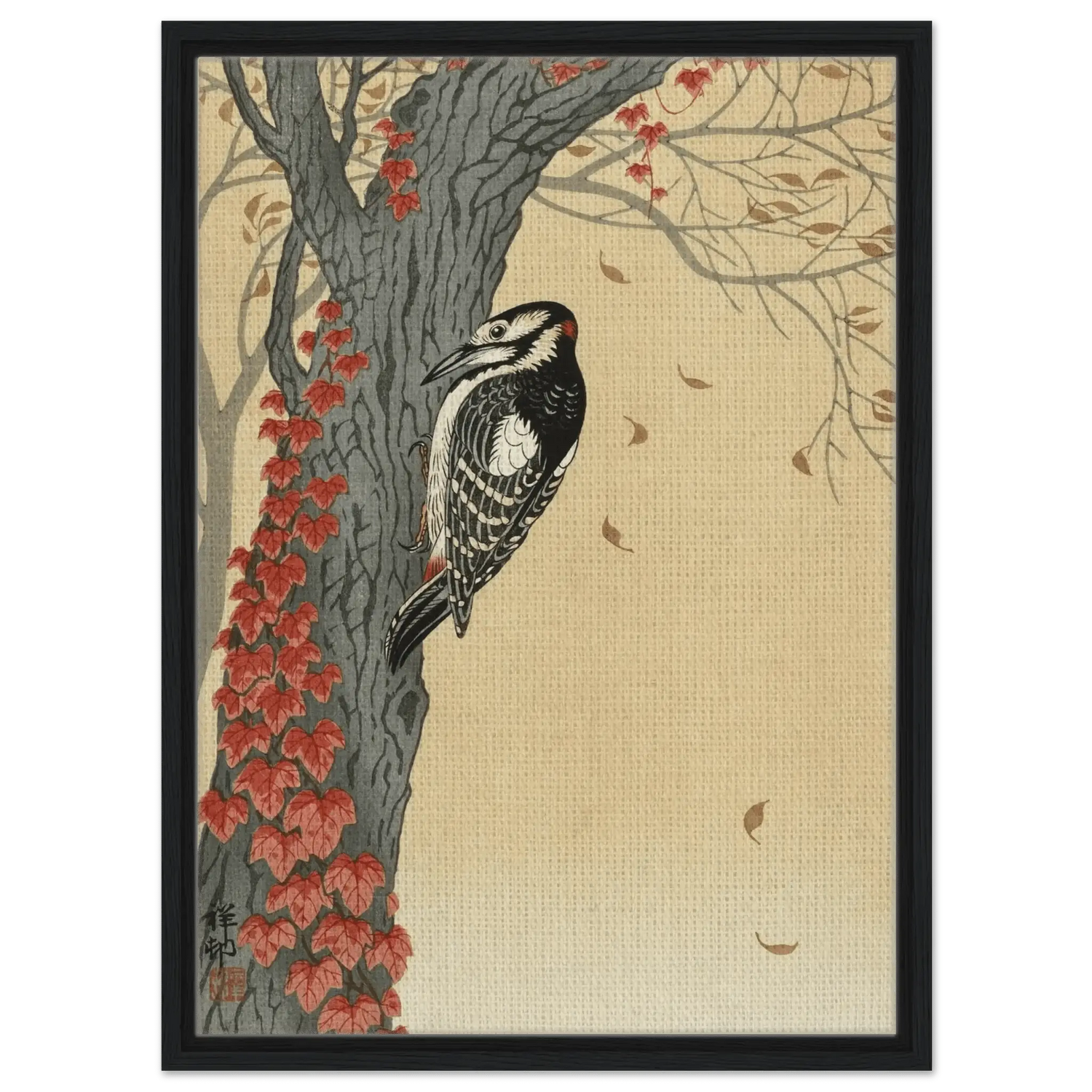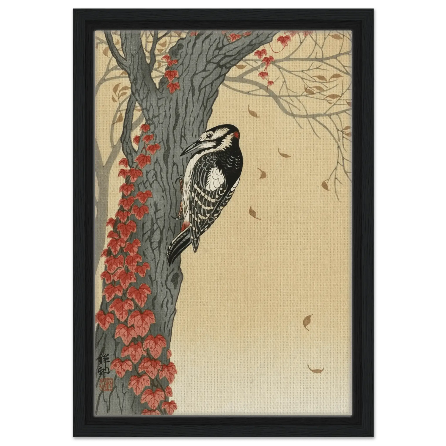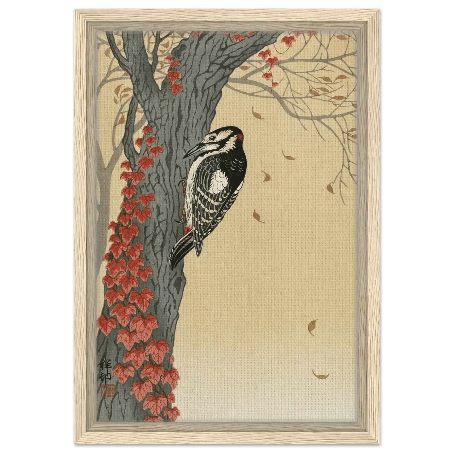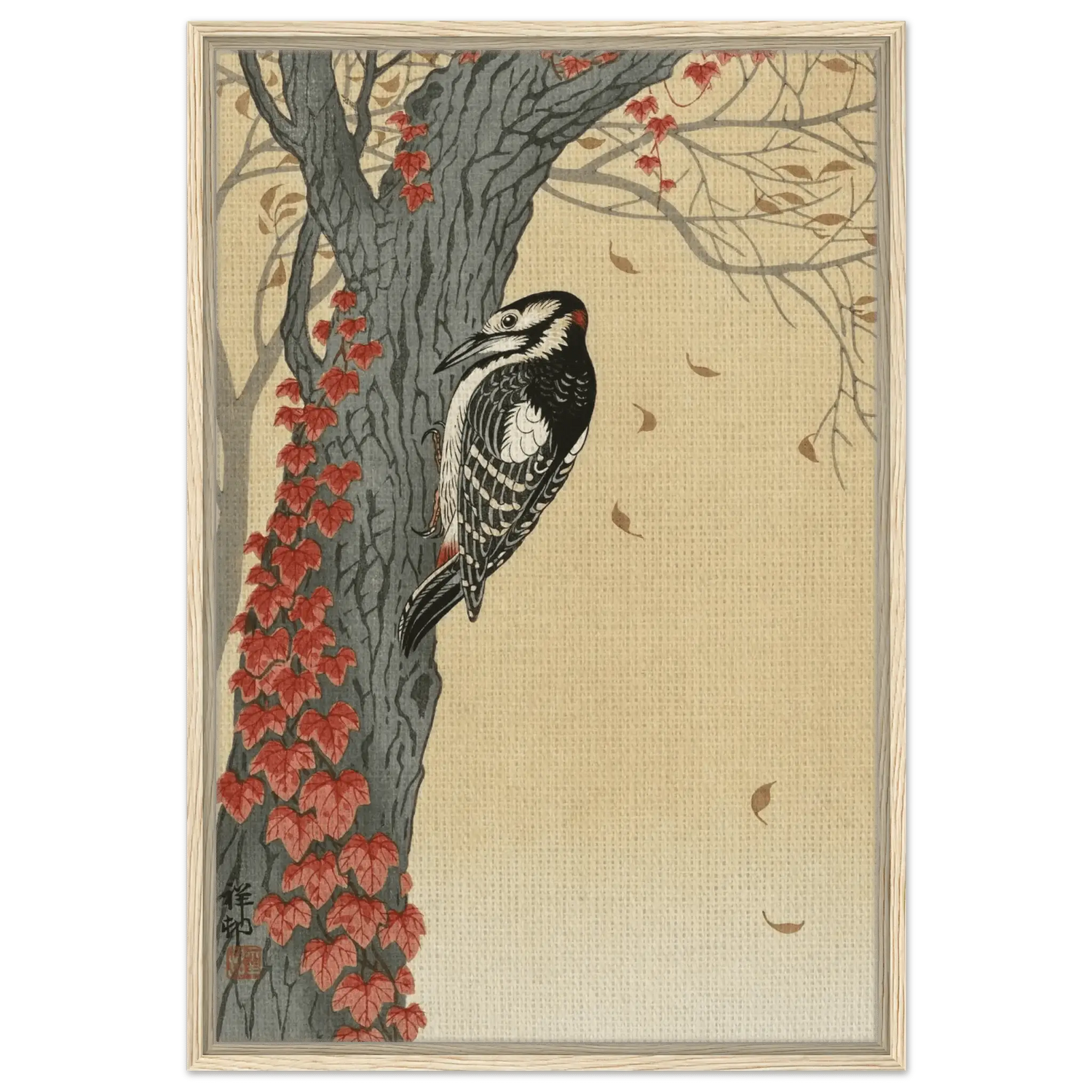In „Buntspecht im Herbstlaub“ zeigt Koson die Essenz des Herbstes: Schönheit im Vergehen, Bewegung in der Stille.