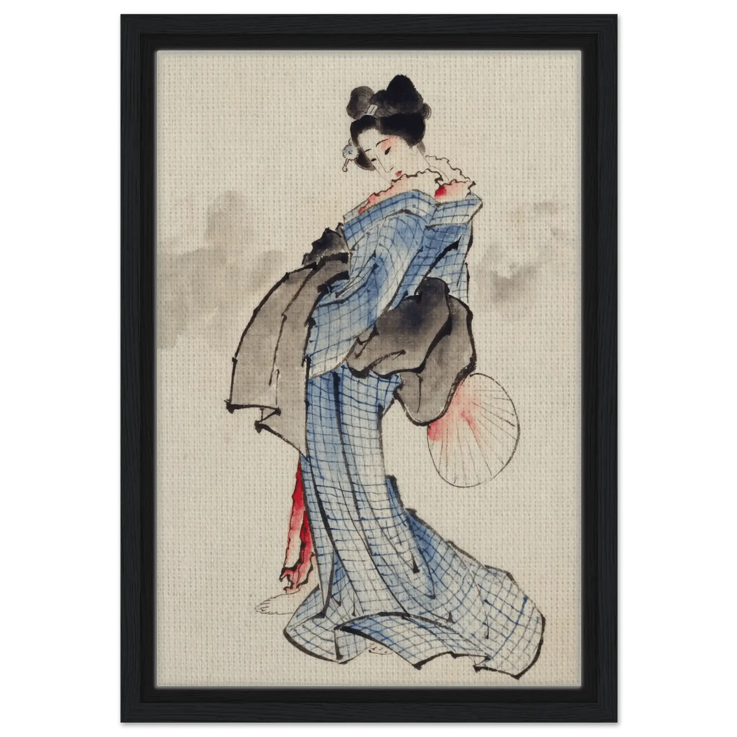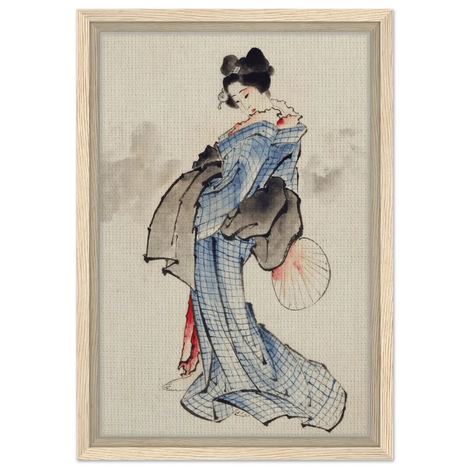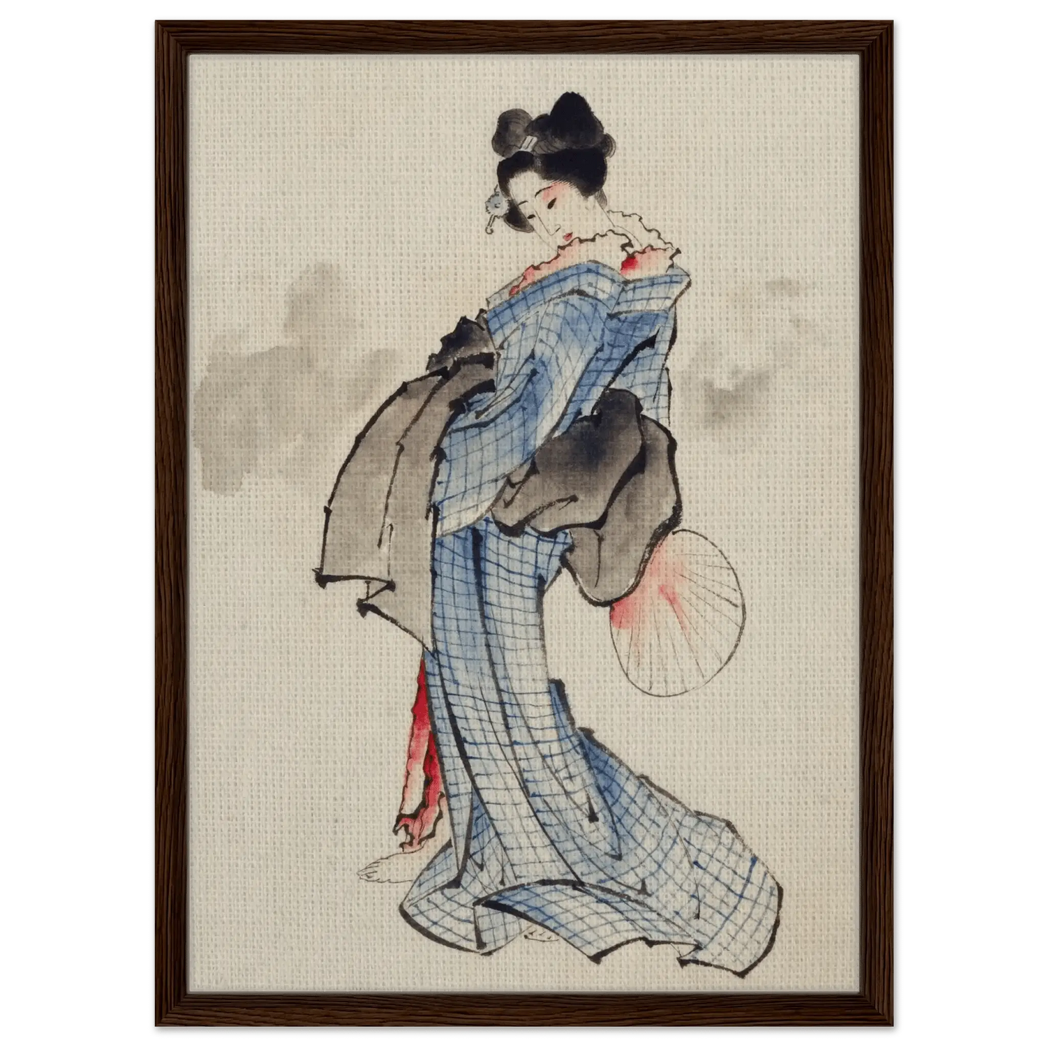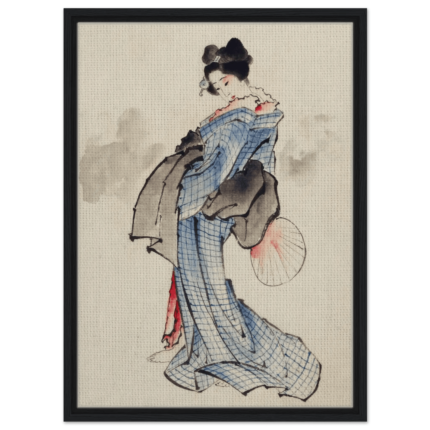 Mit sanft gesenktem Blick und einem feinen Lächeln steht eine Frau in einem blau karierten Kimono, den Fächer leicht in der Hand.