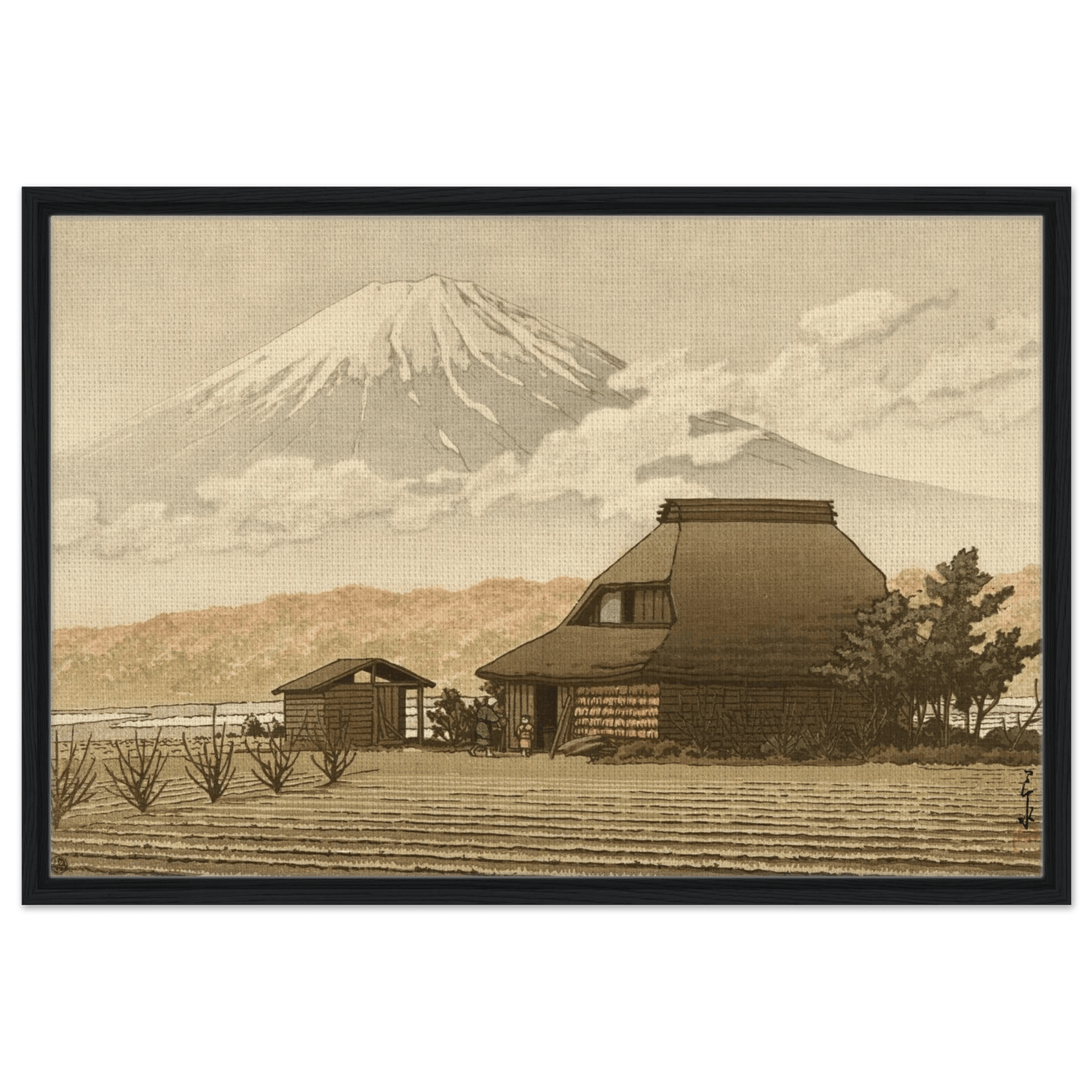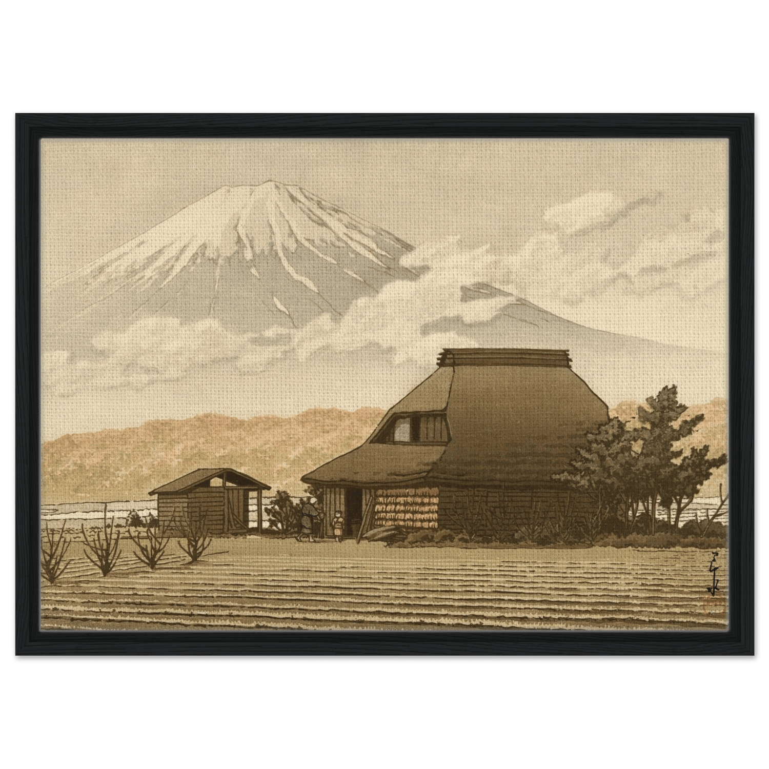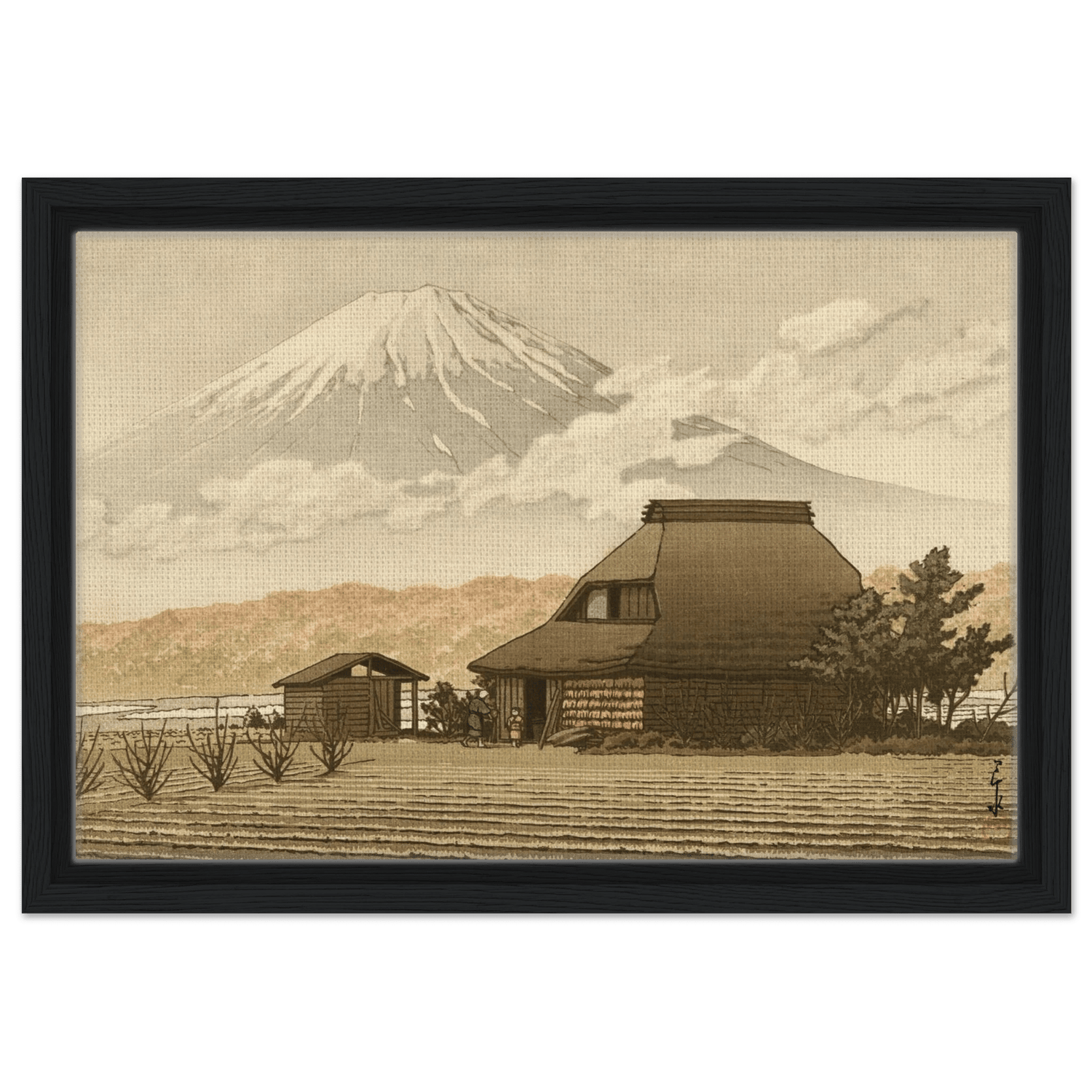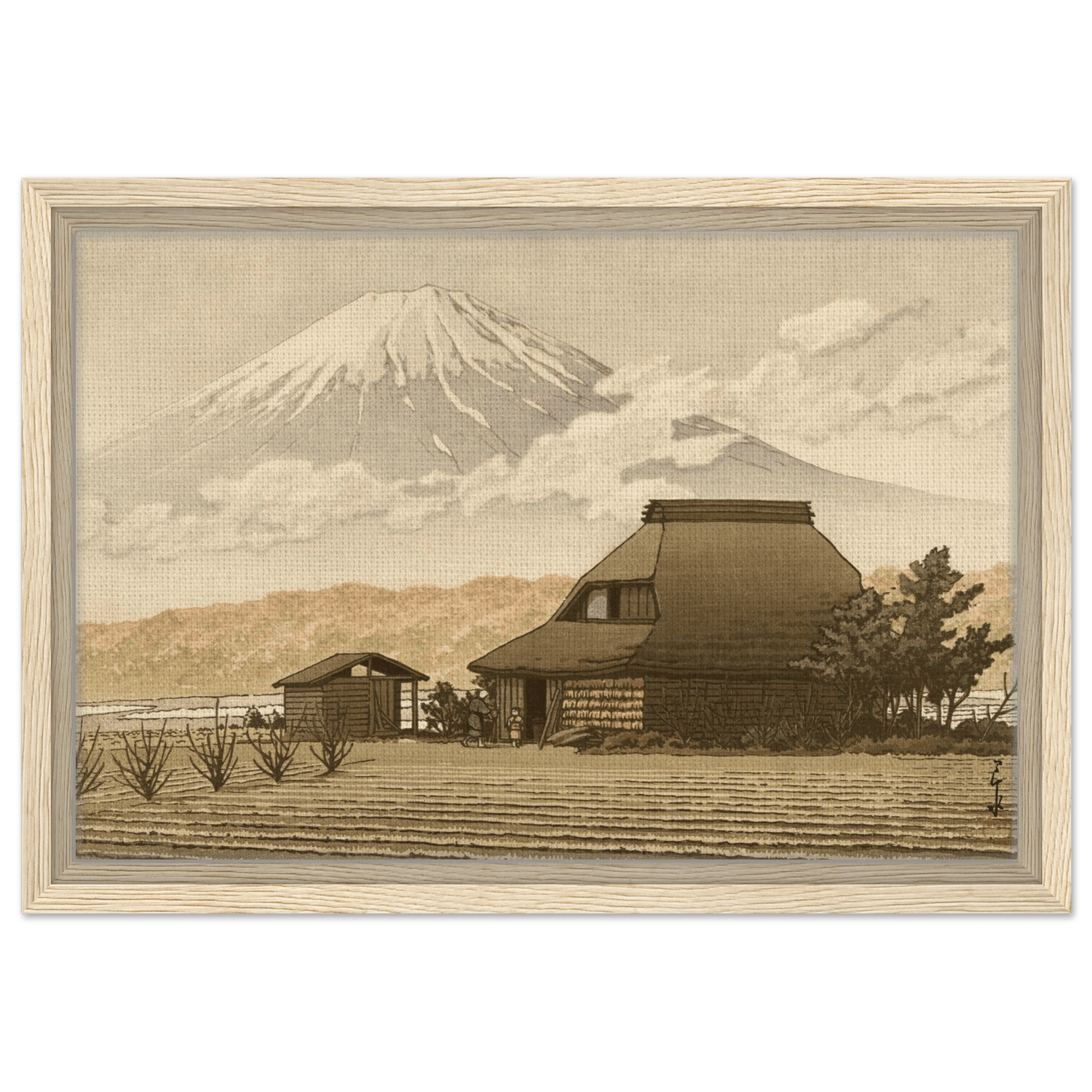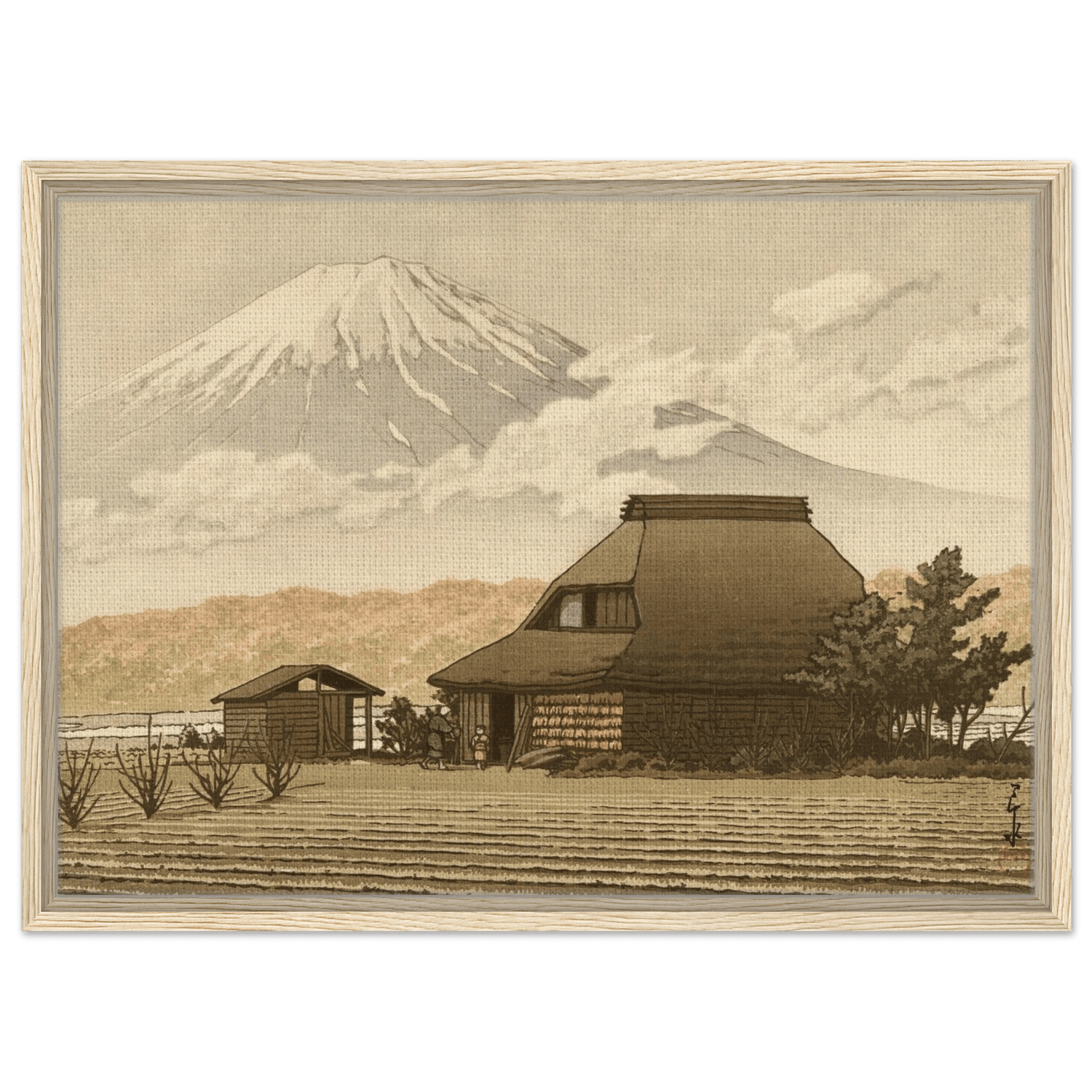 Ein stiller Morgen am Fuße des Fuji: Eine einfache Strohhütte, sanfte Felder, ein Hauch von Nebel.