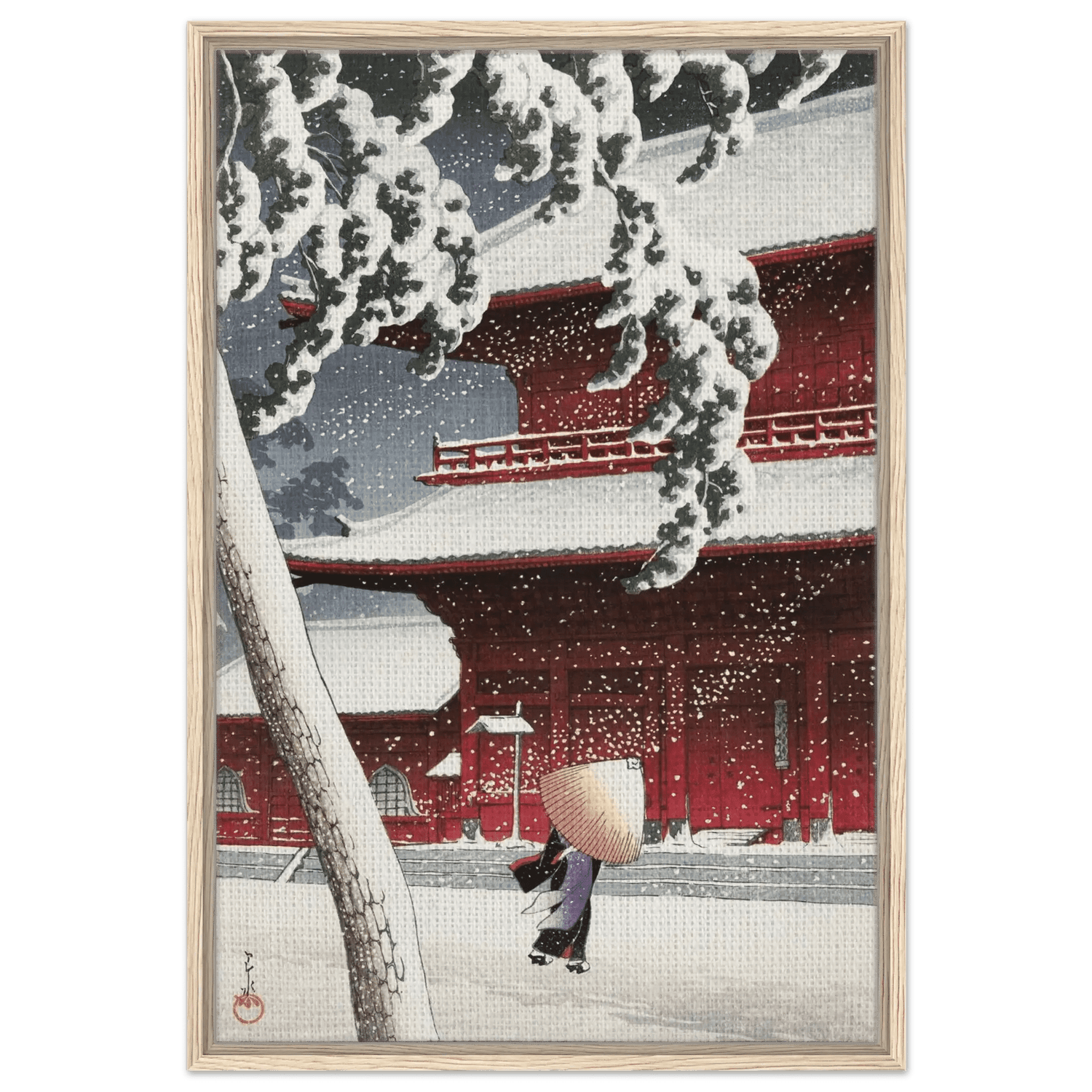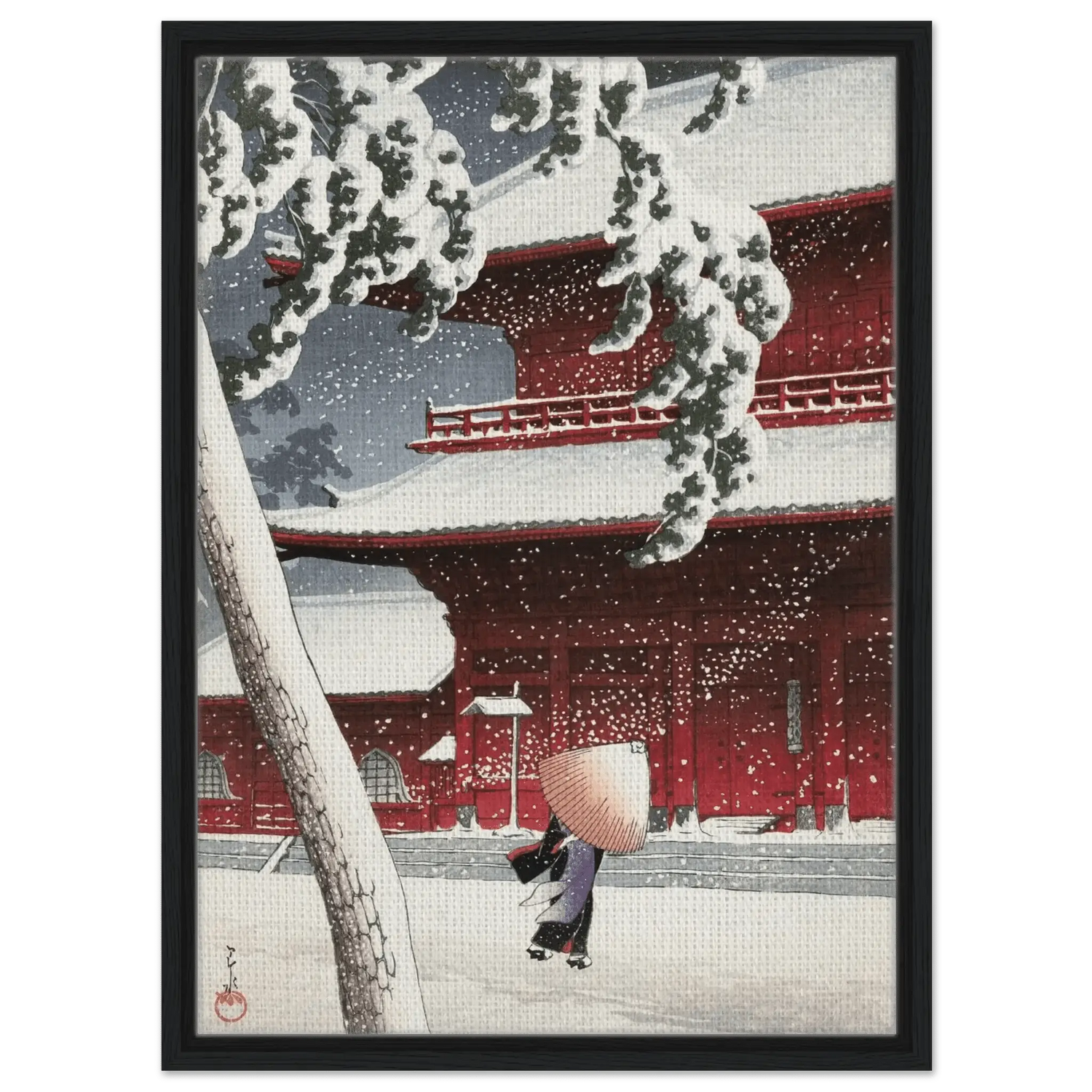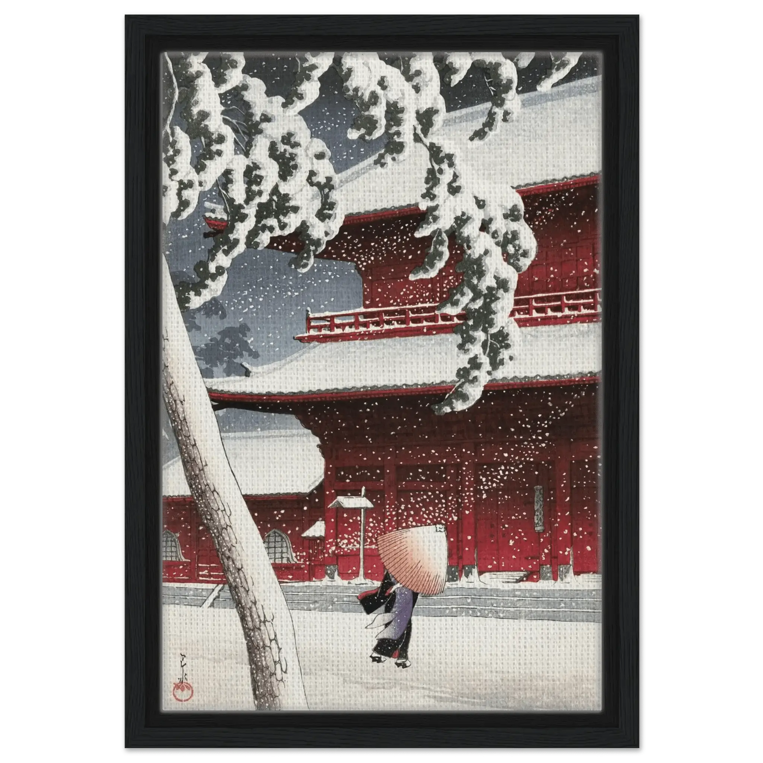Leise fällt der Schnee auf die roten Tempelwände des Zojoji-Schreins in Tokio. Eine einsame Gestalt mit Strohhut schreitet über den stillen Hof, während dichte Flocken den Himmel füllen. Künstler: Kawase Hasui (川瀬 巴水, 1883–1957) — veröffentlicht von Watanabe Shōzaburō. Hasui zeigt meisterhaft das Zusammenspiel von Licht, Farbe und Stille; das kräftige Rot des Tempels kontrastiert mit dem reinen Weiß des Schnees und verdichtet den Moment zu poetischer Ruhe.