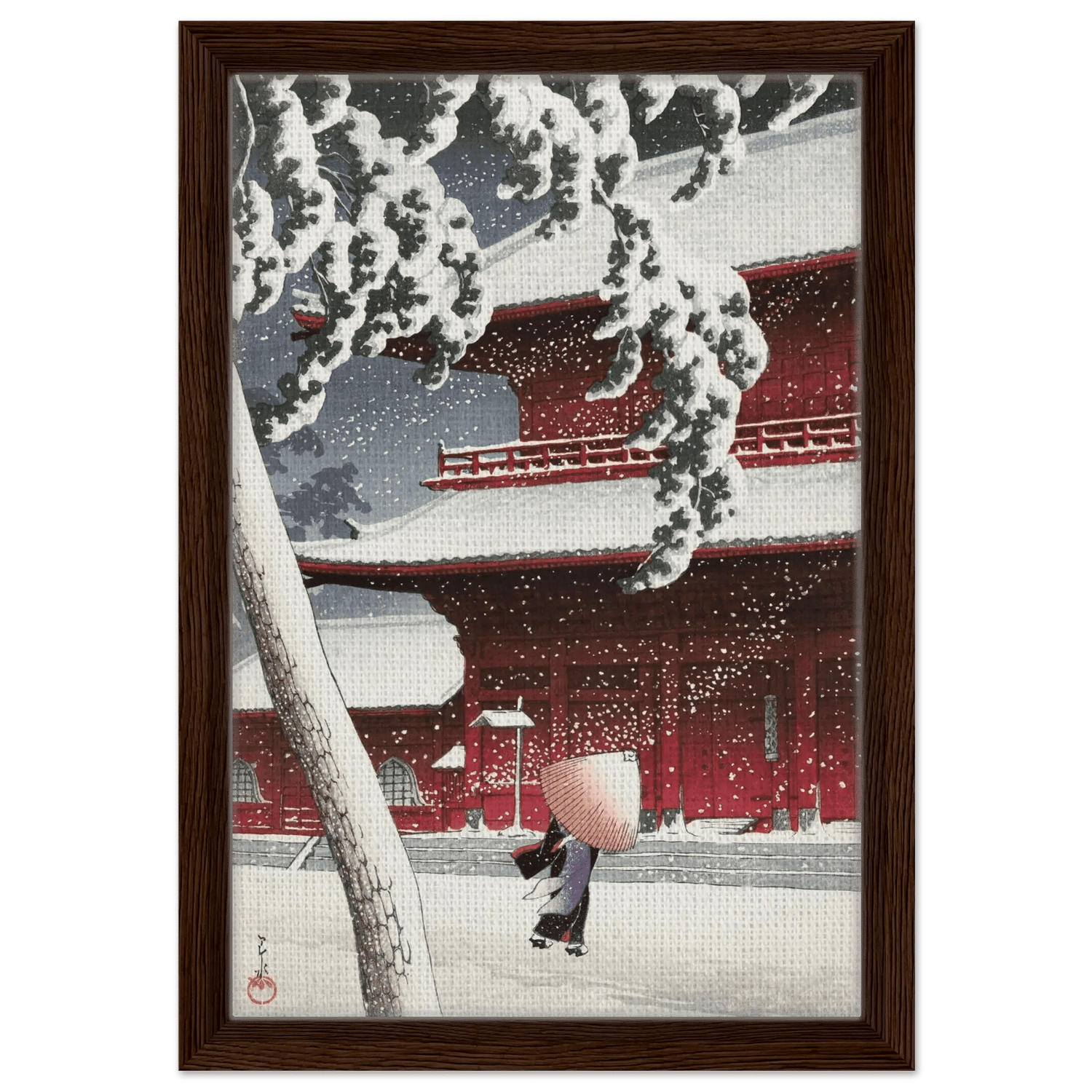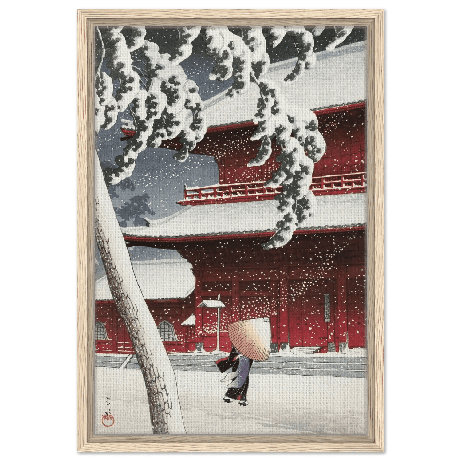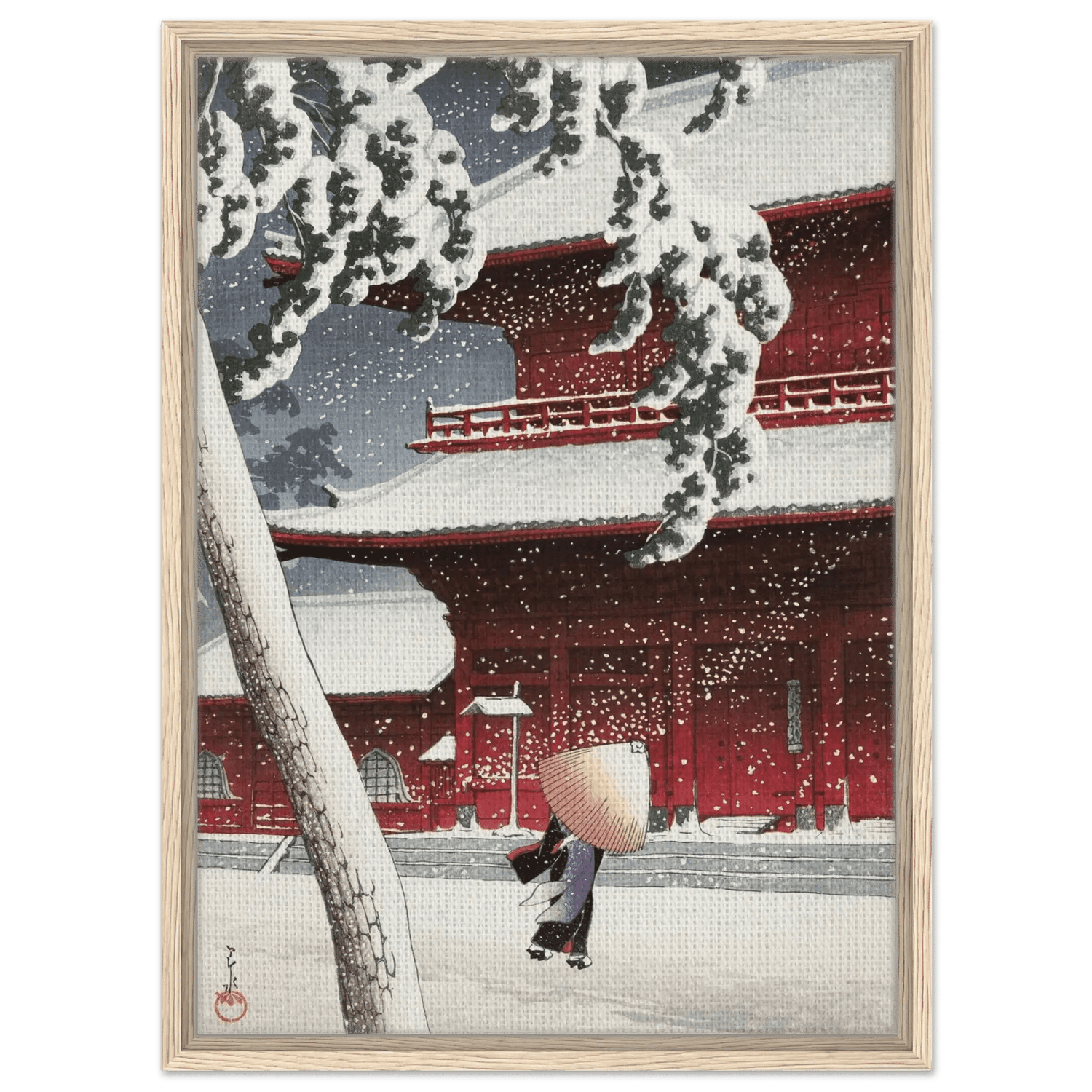 Leise fällt der Schnee auf die roten Tempelwände des Zojoji-Schreins in Tokio. Eine einsame Gestalt mit Strohhut schreitet über den stillen Hof, während dichte Flocken den Himmel füllen. Künstler: Kawase Hasui (川瀬 巴水, 1883–1957) — veröffentlicht von Watanabe Shōzaburō. Hasui zeigt meisterhaft das Zusammenspiel von Licht, Farbe und Stille; das kräftige Rot des Tempels kontrastiert mit dem reinen Weiß des Schnees und verdichtet den Moment zu poetischer Ruhe.