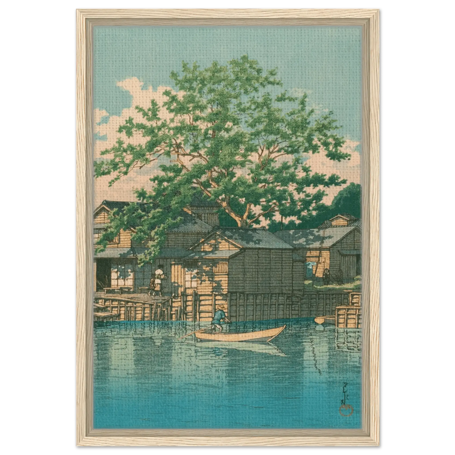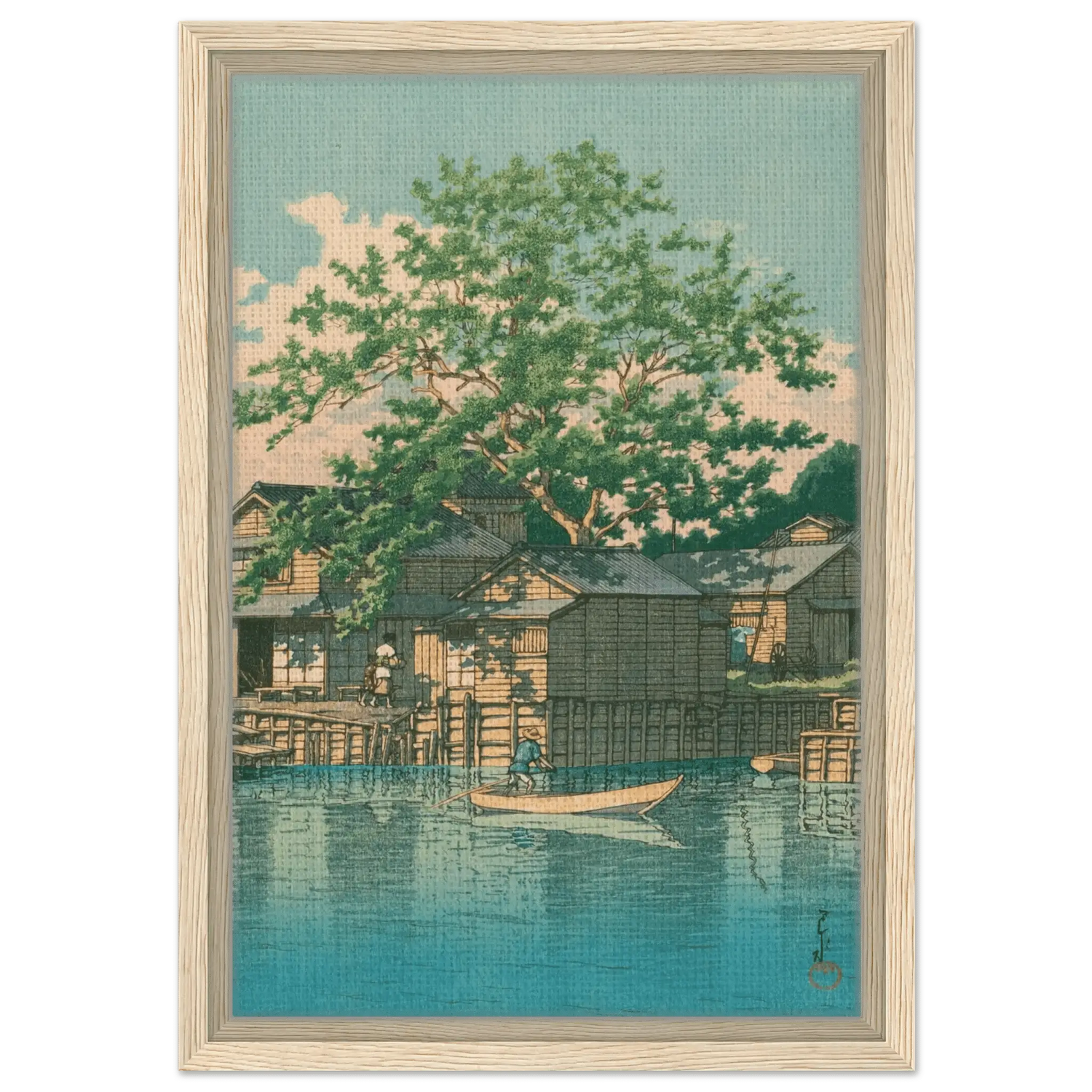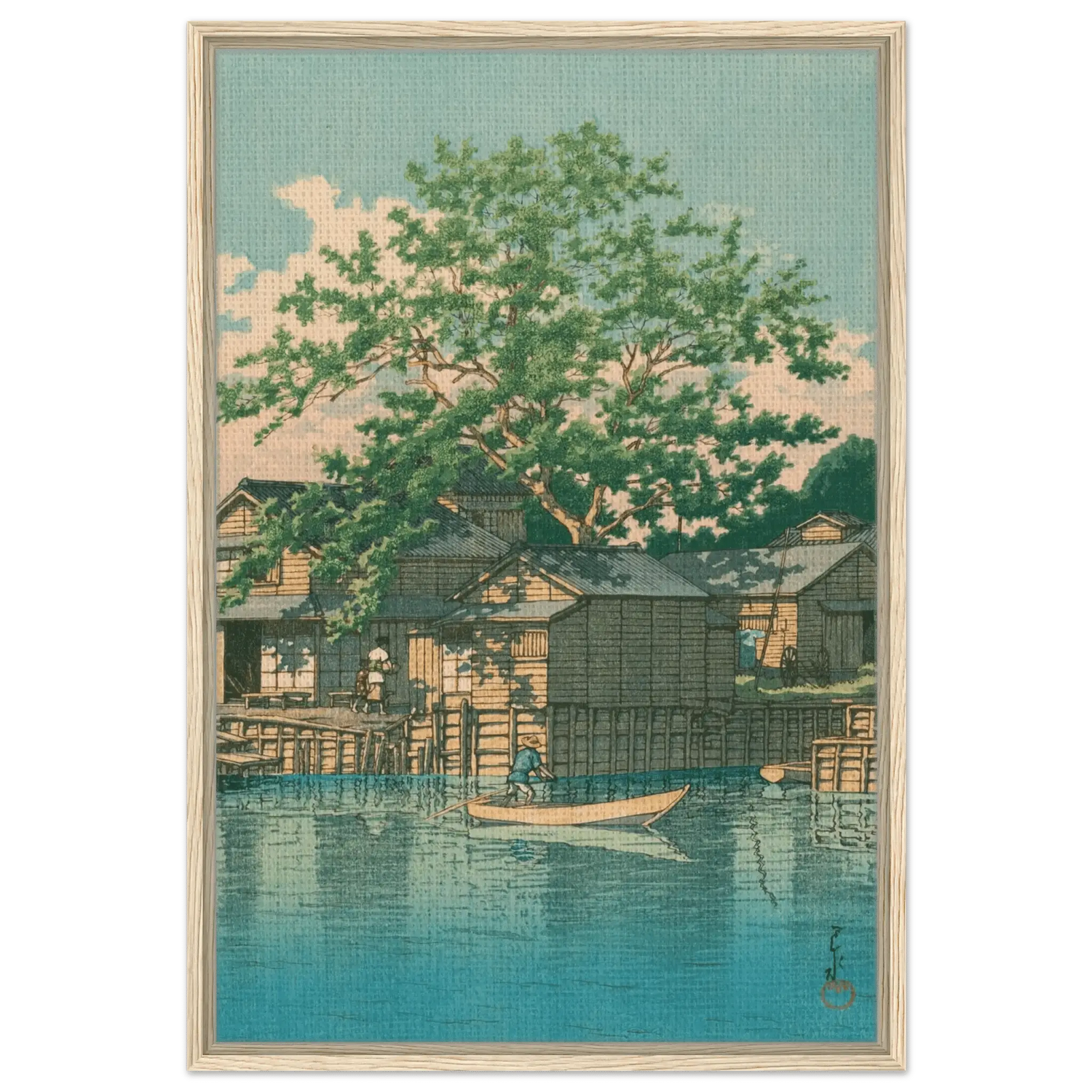 Ein stiller Sommernachmittag liegt über den Holzhäusern am Wasser, wo das Licht in goldenen Reflexen über die Fassaden tanzt. Eine Frau mit Kind überquert den Steg, während ein Mann in einem kleinen Boot langsam über das ruhige Wasser gleitet. Kawase Hasui fängt hier den Zauber des Alltäglichen ein – die friedvolle Einfachheit eines Augenblicks, in dem Zeit und Bewegung stillzustehen scheinen.