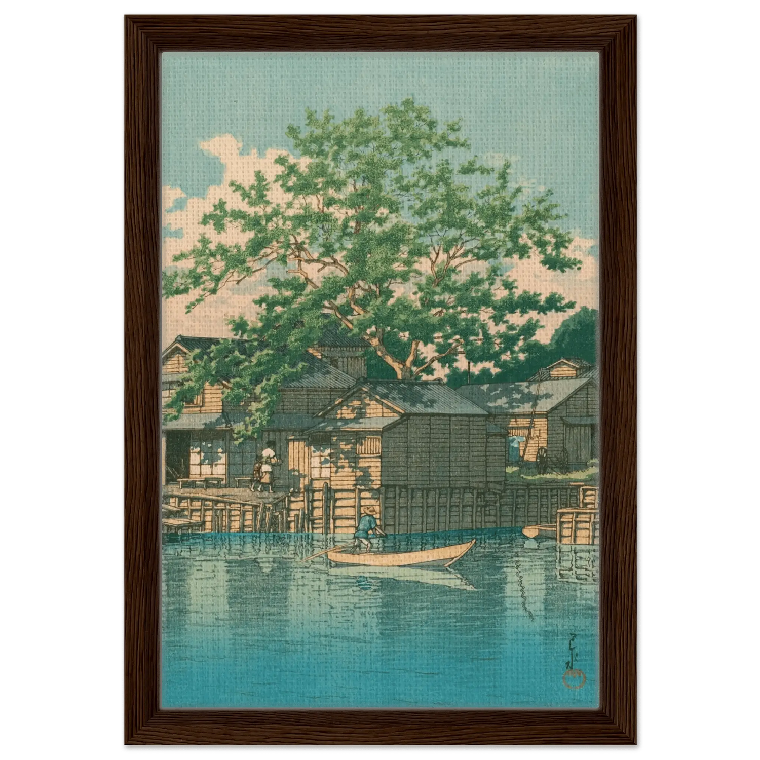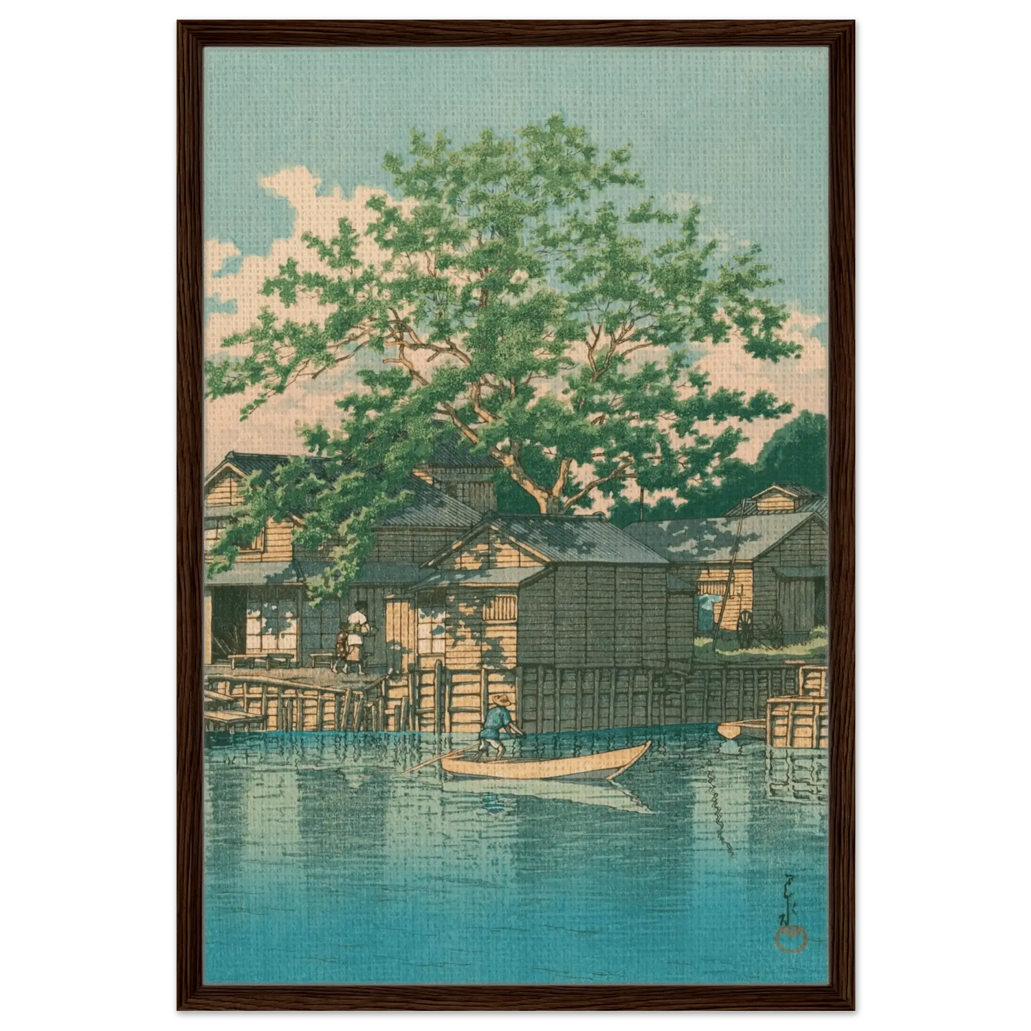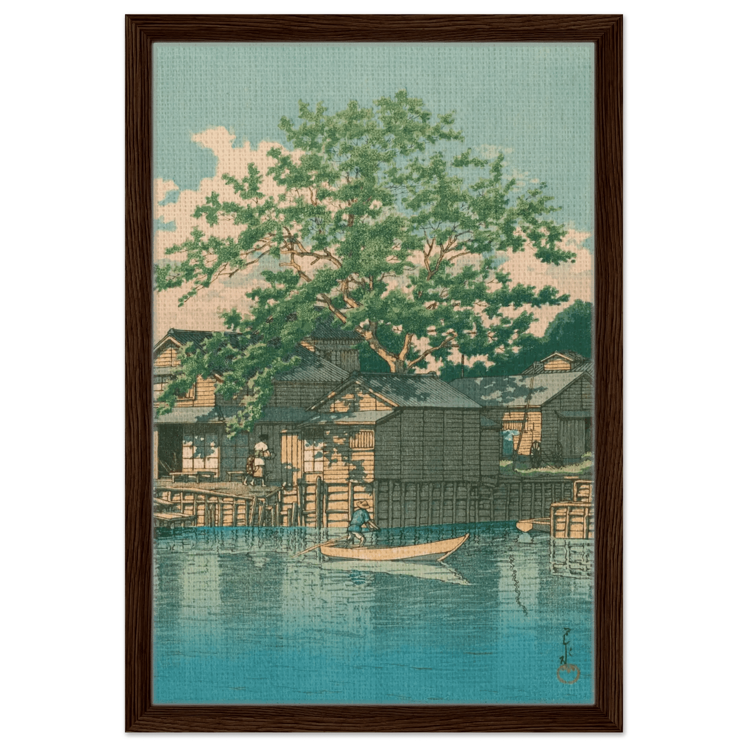 Ein stiller Sommernachmittag liegt über den Holzhäusern am Wasser, wo das Licht in goldenen Reflexen über die Fassaden tanzt. Eine Frau mit Kind überquert den Steg, während ein Mann in einem kleinen Boot langsam über das ruhige Wasser gleitet. Kawase Hasui fängt hier den Zauber des Alltäglichen ein – die friedvolle Einfachheit eines Augenblicks, in dem Zeit und Bewegung stillzustehen scheinen.