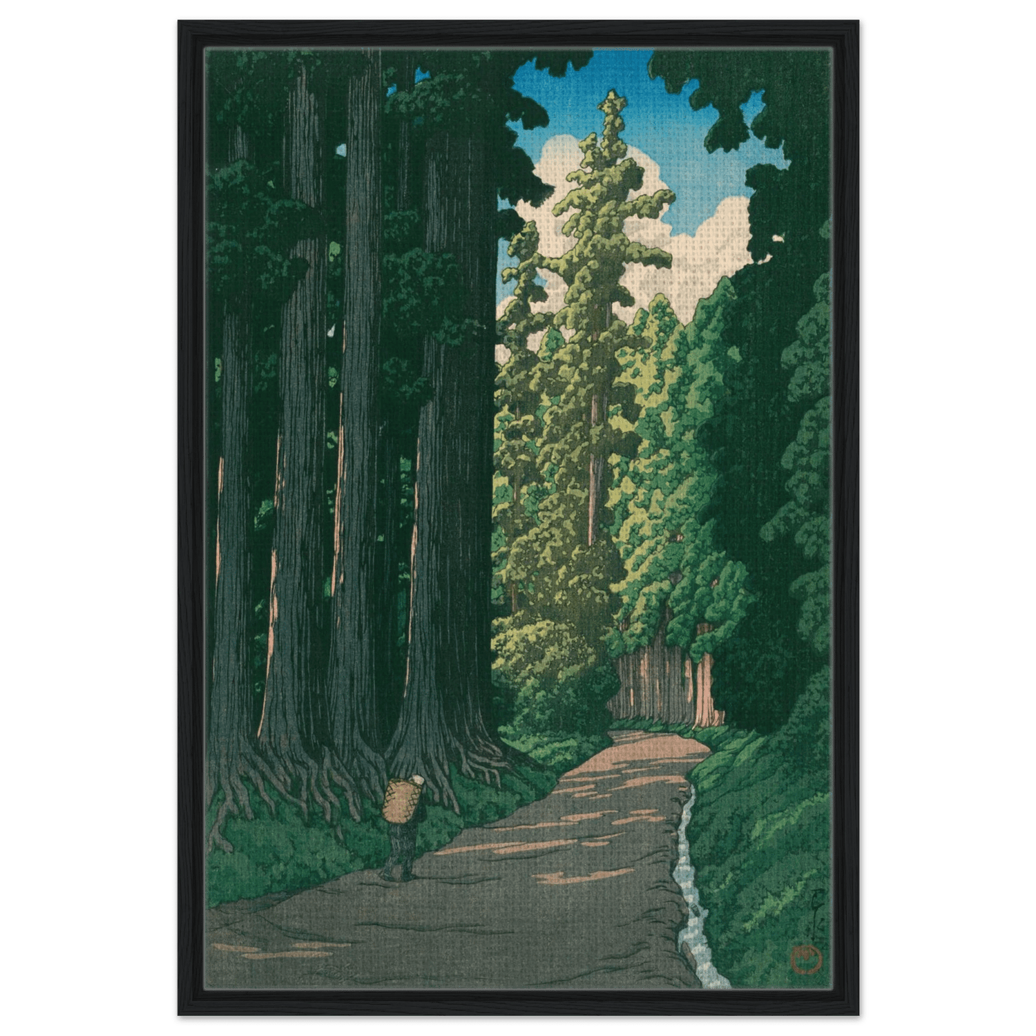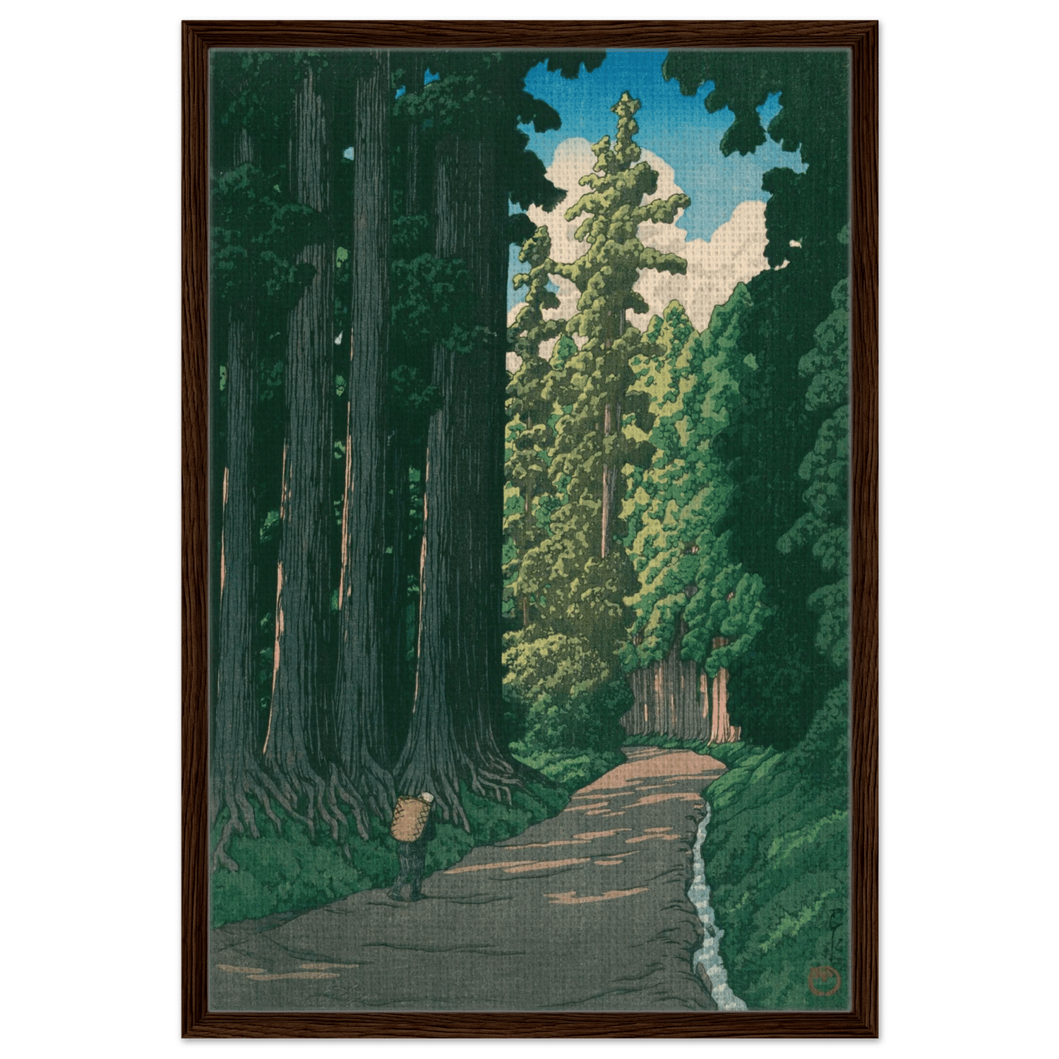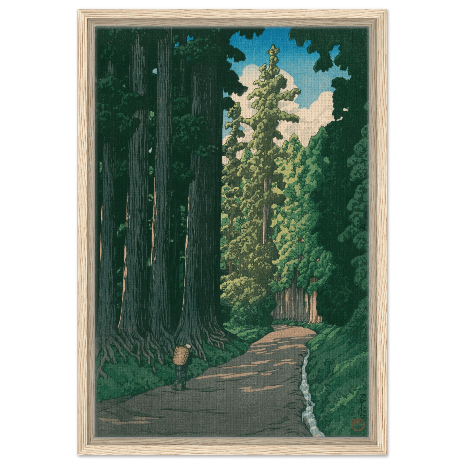 Ein einsamer Wanderer bewegt sich auf einem alten Pfad, der von mächtigen Zedern gesäumt ist. Das Licht des Sommers fällt in schmalen Streifen durch das dichte Blätterdach und beleuchtet die ferne Wegbiegung. Kawase Hasui fängt die feierliche Ruhe dieser uralten Straße ein – ein Ort, an dem Geschichte, Natur und Stille miteinander verschmelzen.