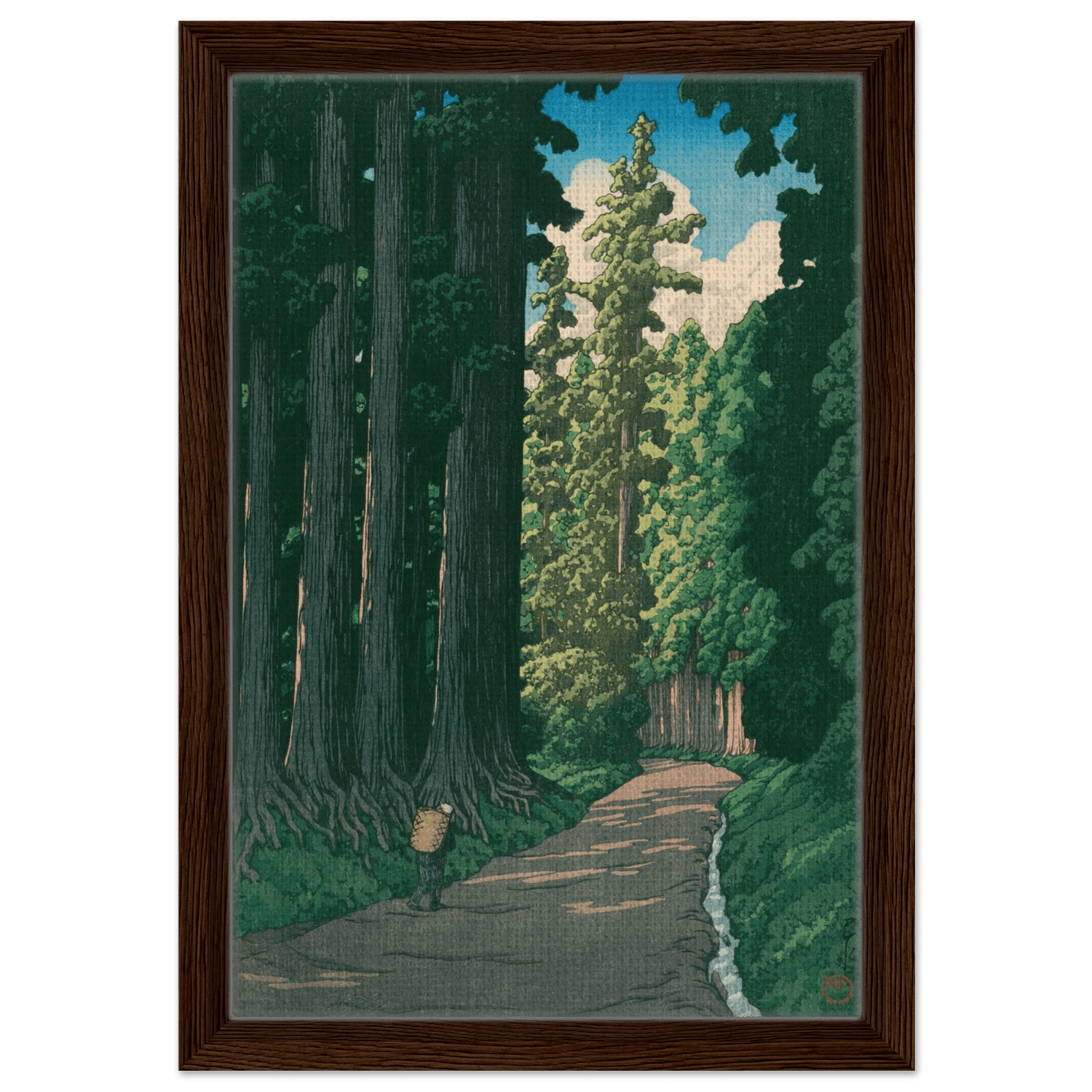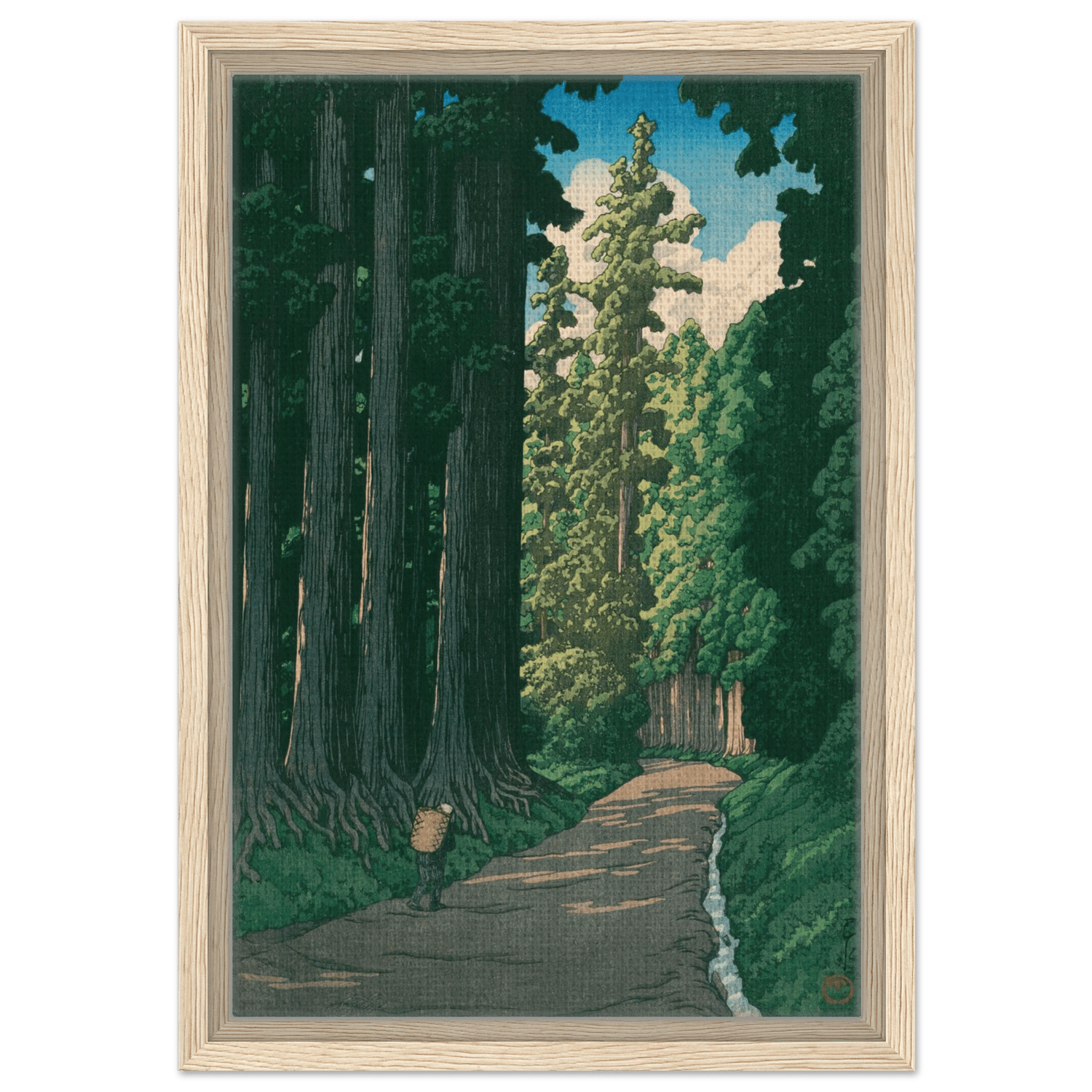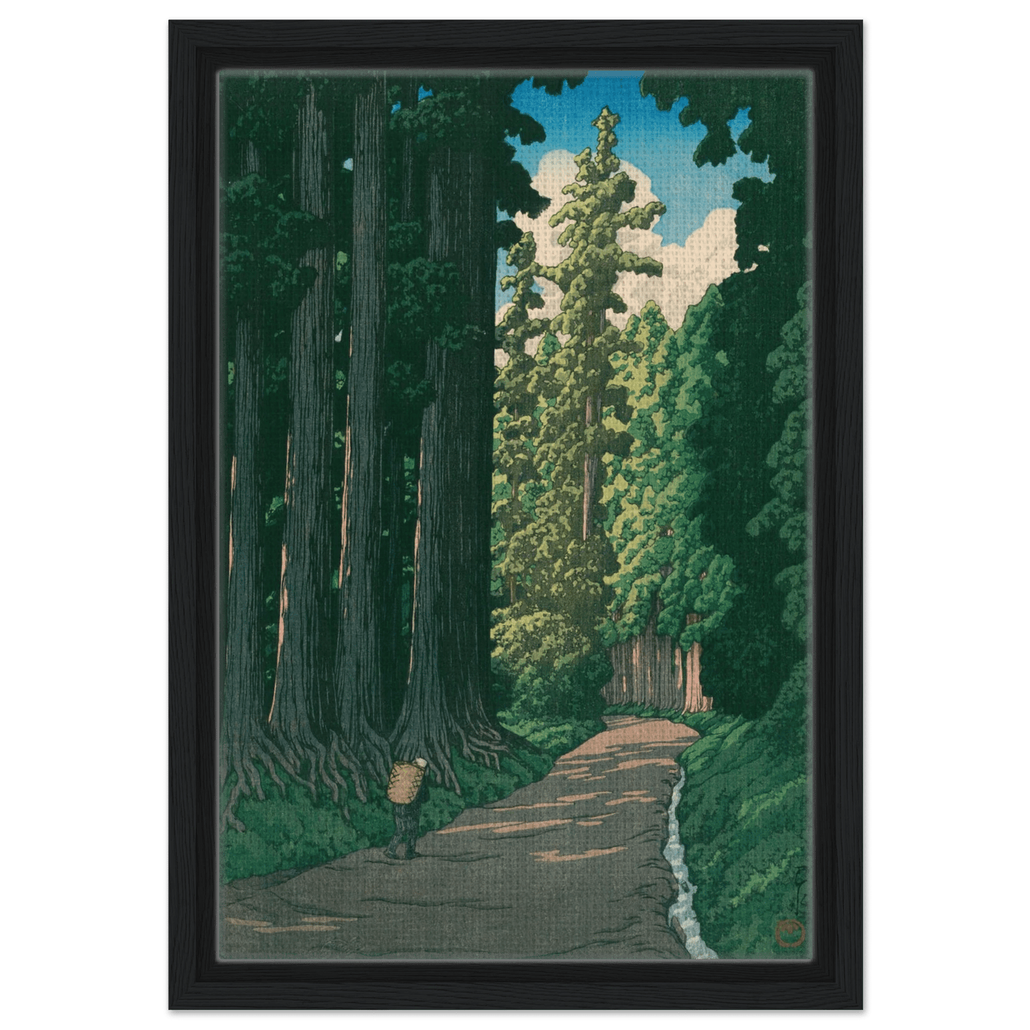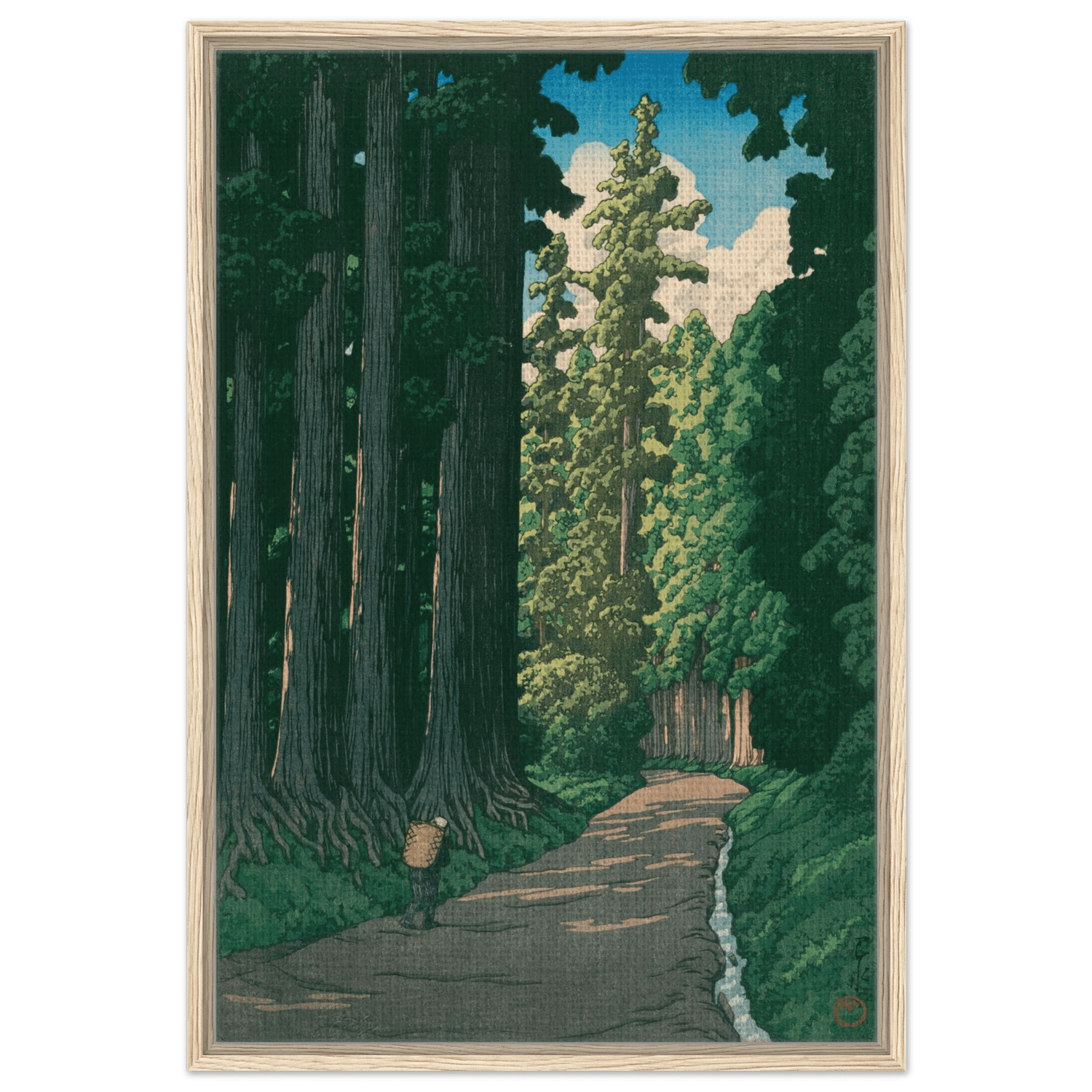 Ein einsamer Wanderer bewegt sich auf einem alten Pfad, der von mächtigen Zedern gesäumt ist. Das Licht des Sommers fällt in schmalen Streifen durch das dichte Blätterdach und beleuchtet die ferne Wegbiegung. Kawase Hasui fängt die feierliche Ruhe dieser uralten Straße ein – ein Ort, an dem Geschichte, Natur und Stille miteinander verschmelzen.
