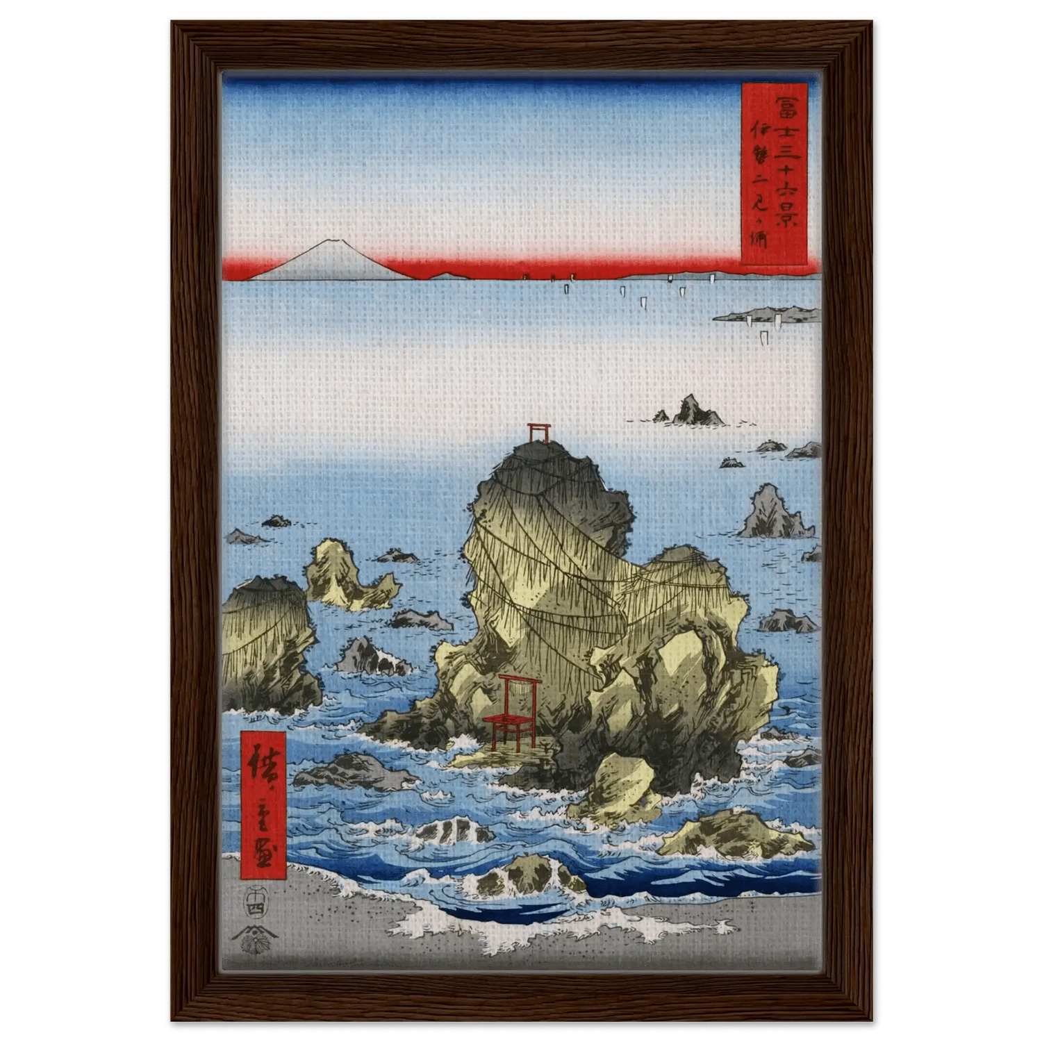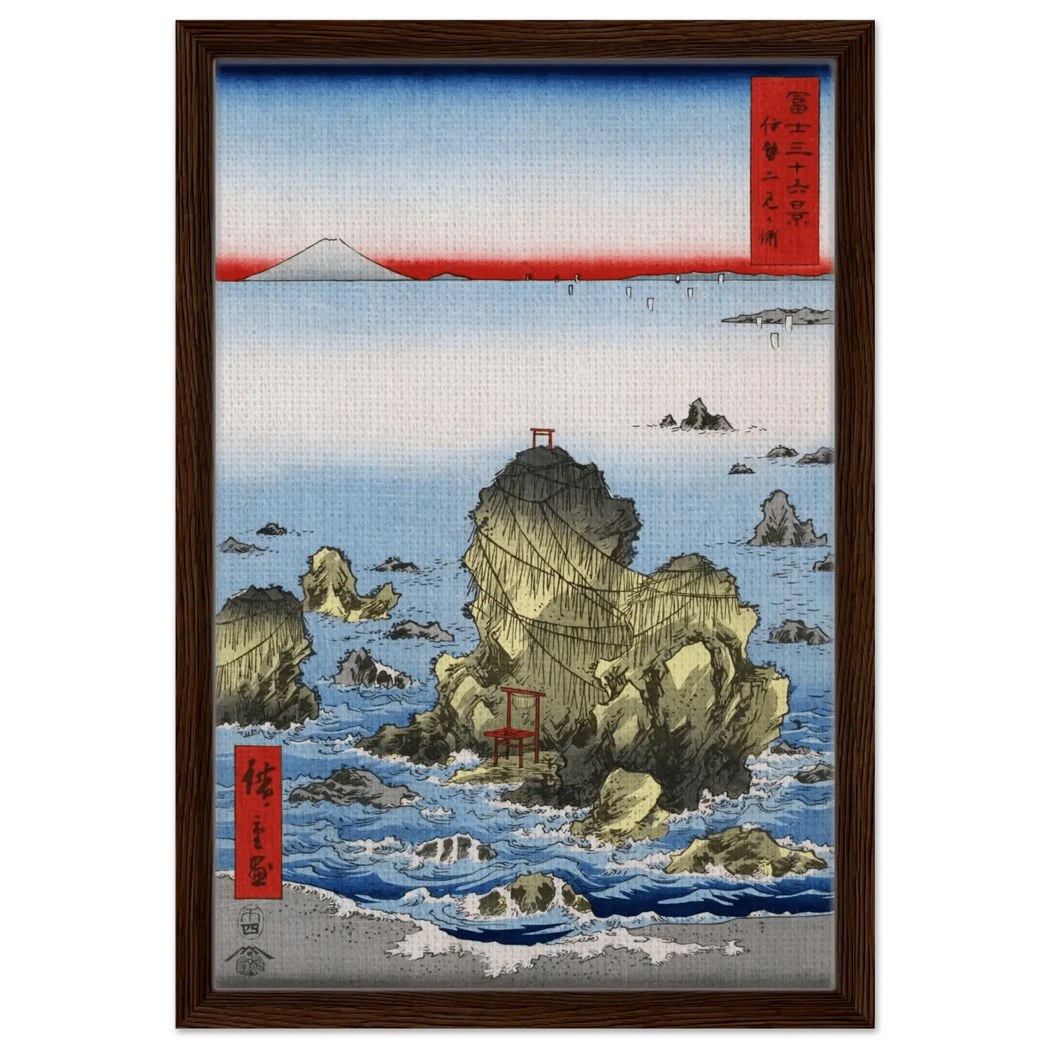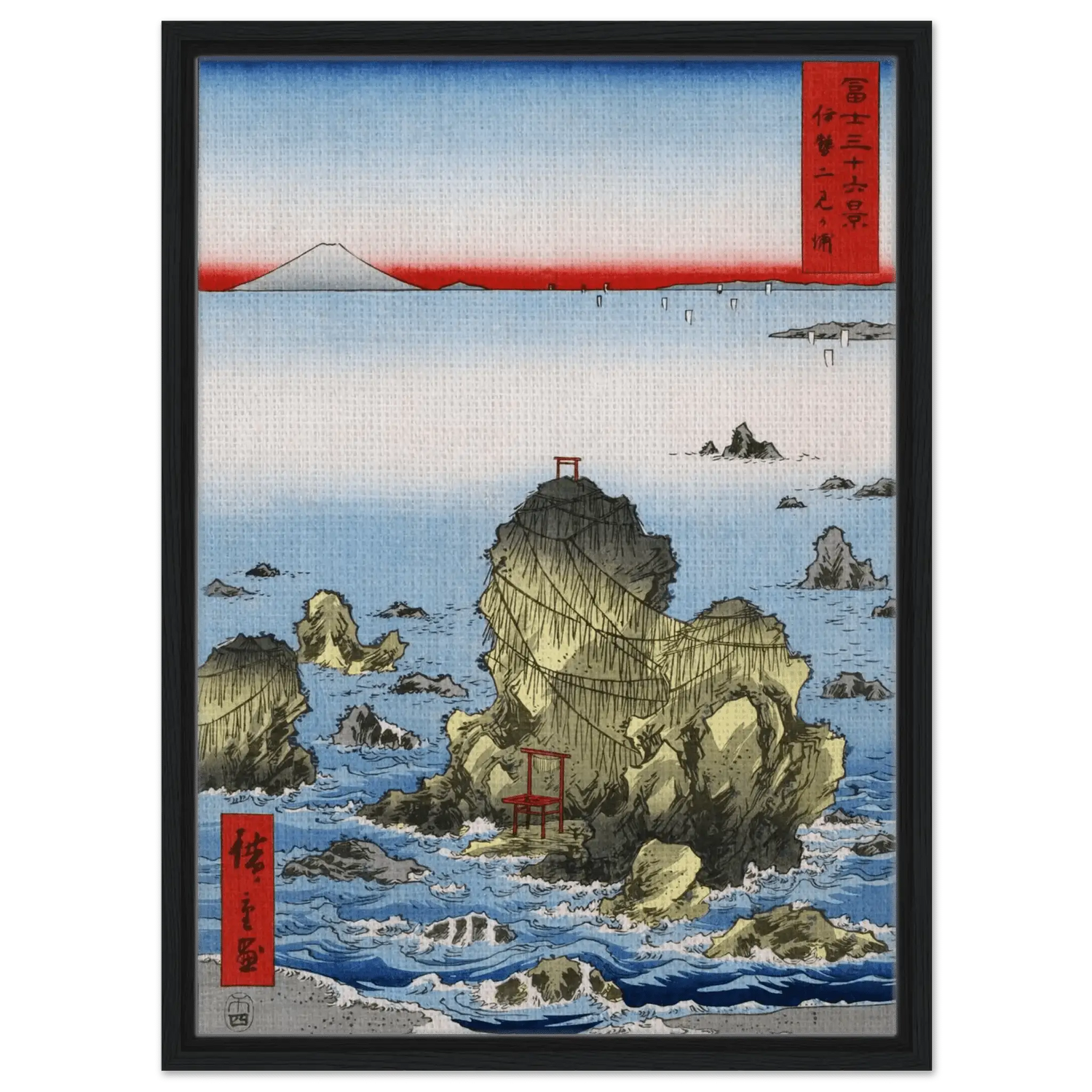 Motiv: Meoto-Iwa-Felsen, Torii, Meer und Fuji-Berg