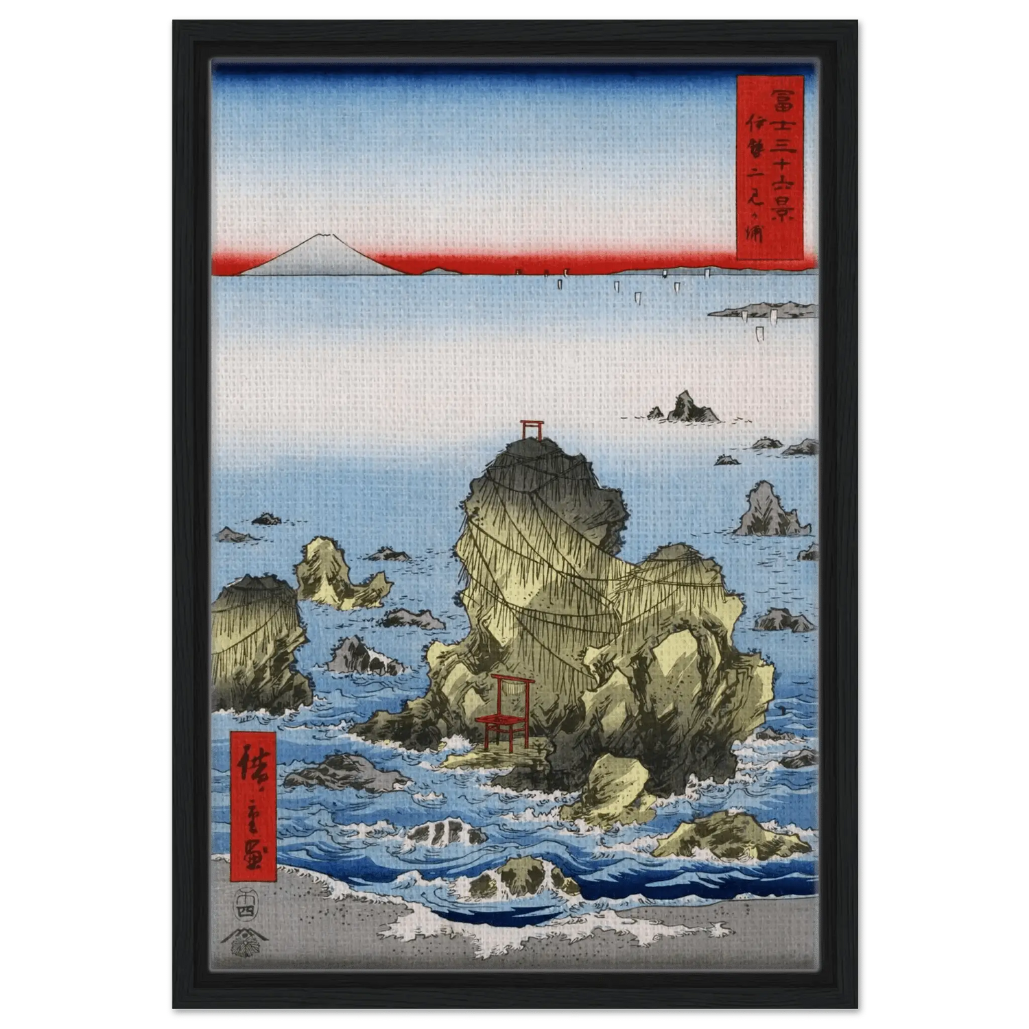 Dieses Werk stammt von Utagawa Hiroshige II (1826–1869) und wurde 1858 als Teil der Serie „Sechsunddreißig Ansichten des Fuji“ veröffentlicht. In dieser Komposition vereinen sich Natur, Spiritualität und Symbolik zu einem Ausdruck tiefen Gleichgewichts.