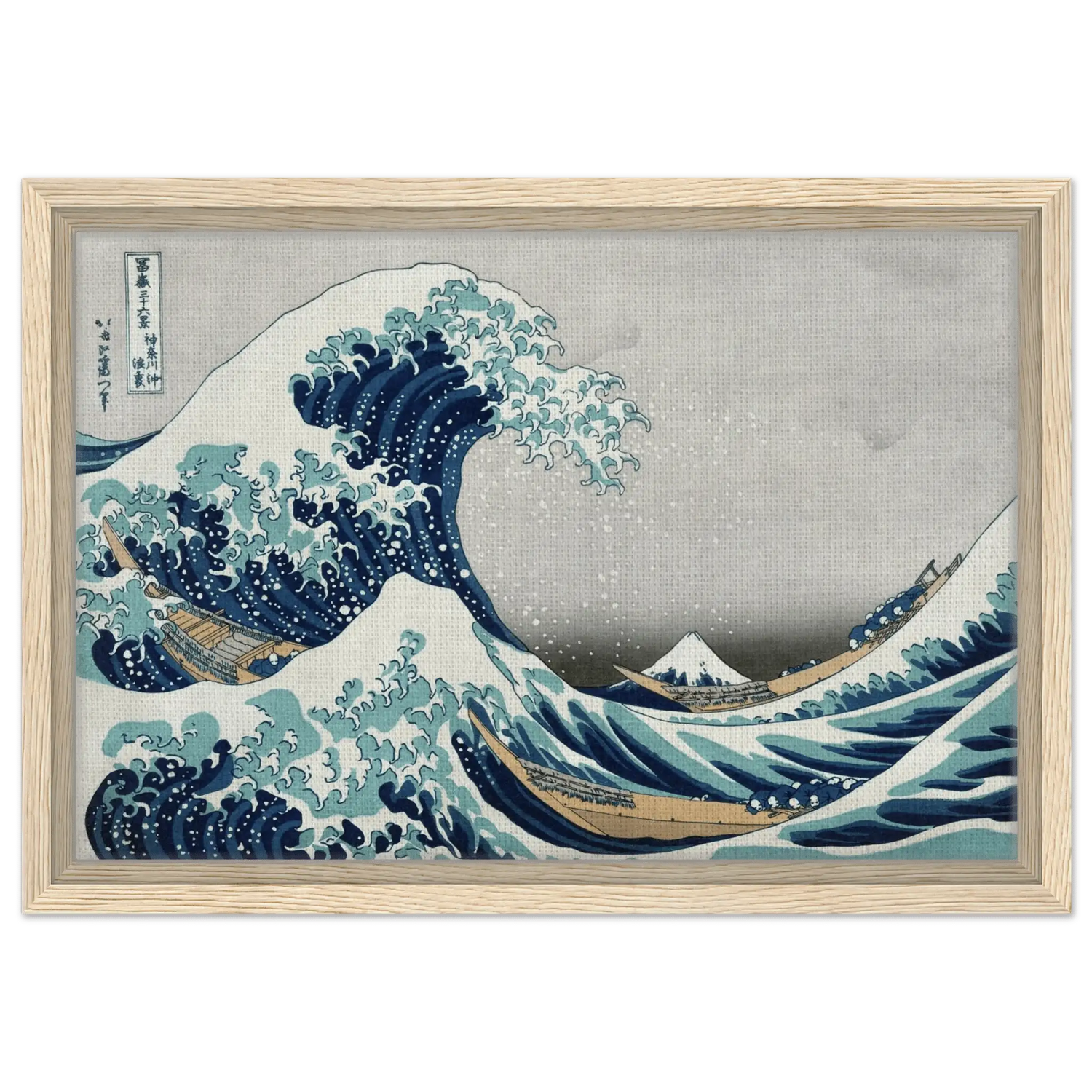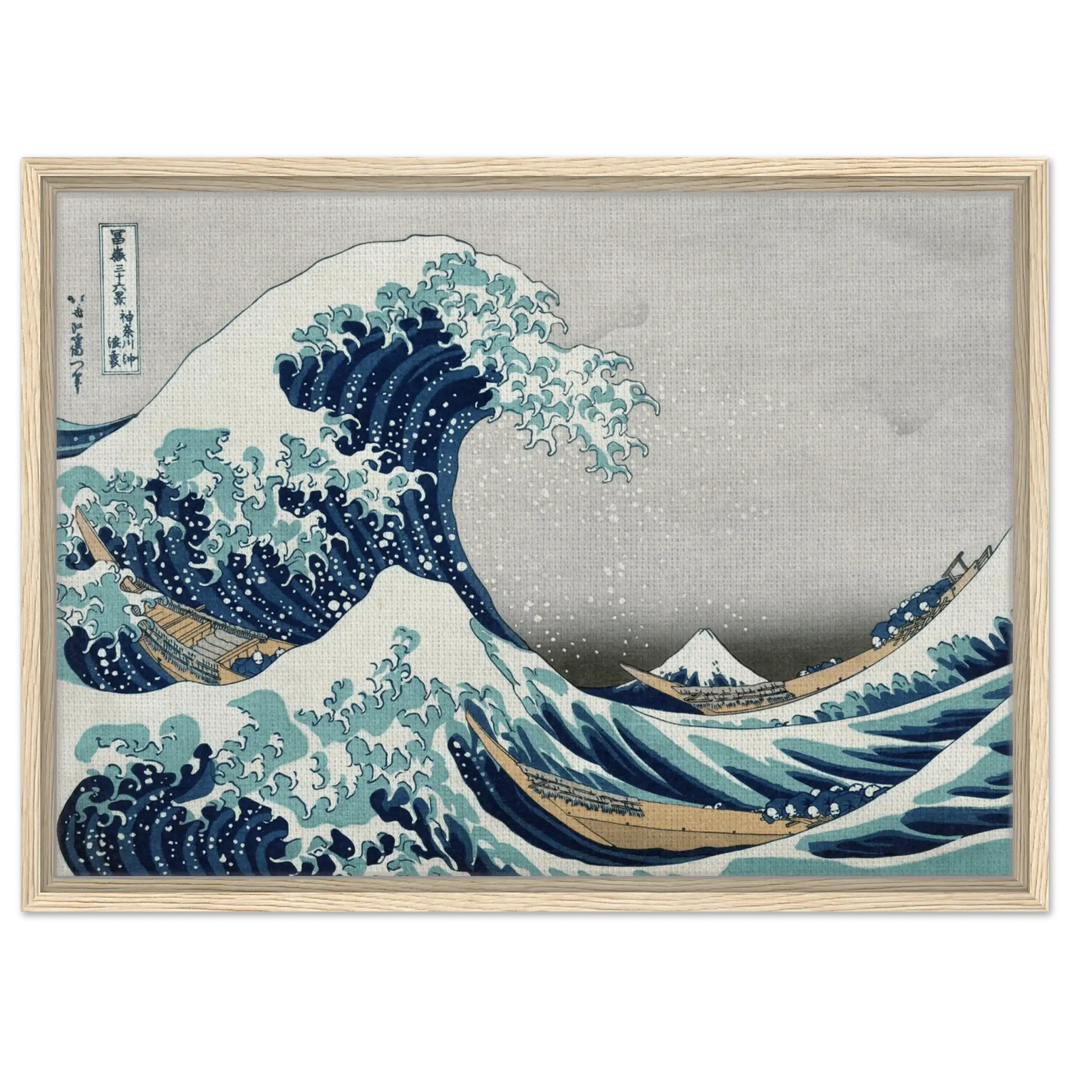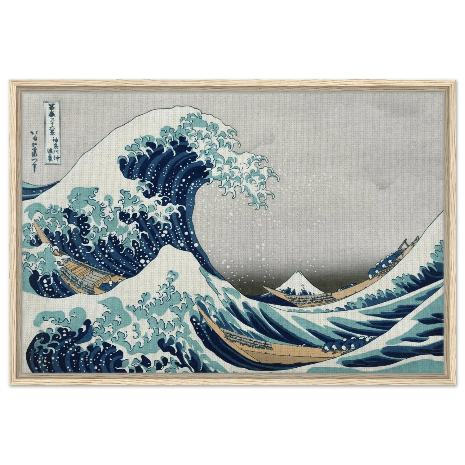 Eine gewaltige Welle erhebt sich drohend über kleine Fischerboote, ihre weißen Schaumkronen krümmen sich wie Krallen über dem Meer. Im Hintergrund, ruhig und unerschütterlich, steht der heilige Berg Fuji – Symbol der Beständigkeit inmitten des Chaos.