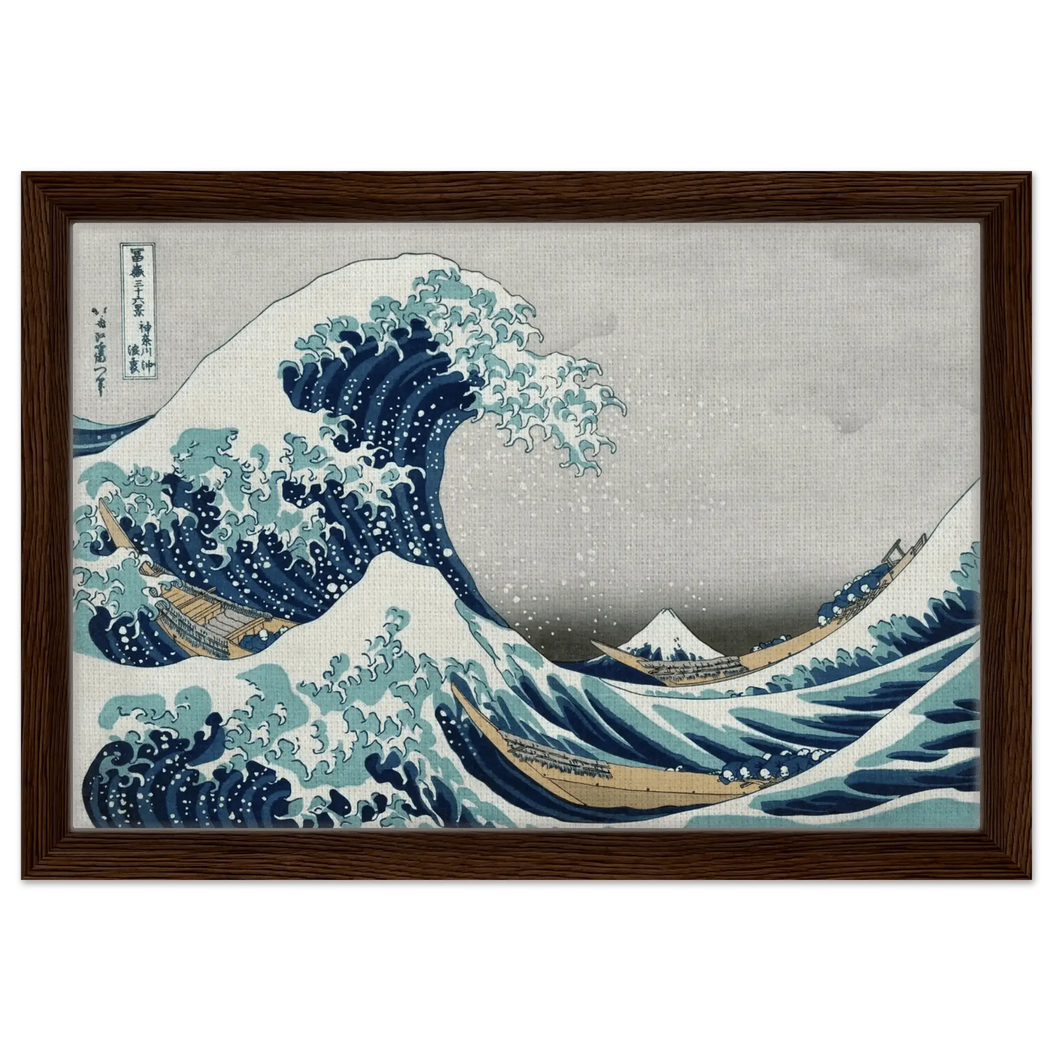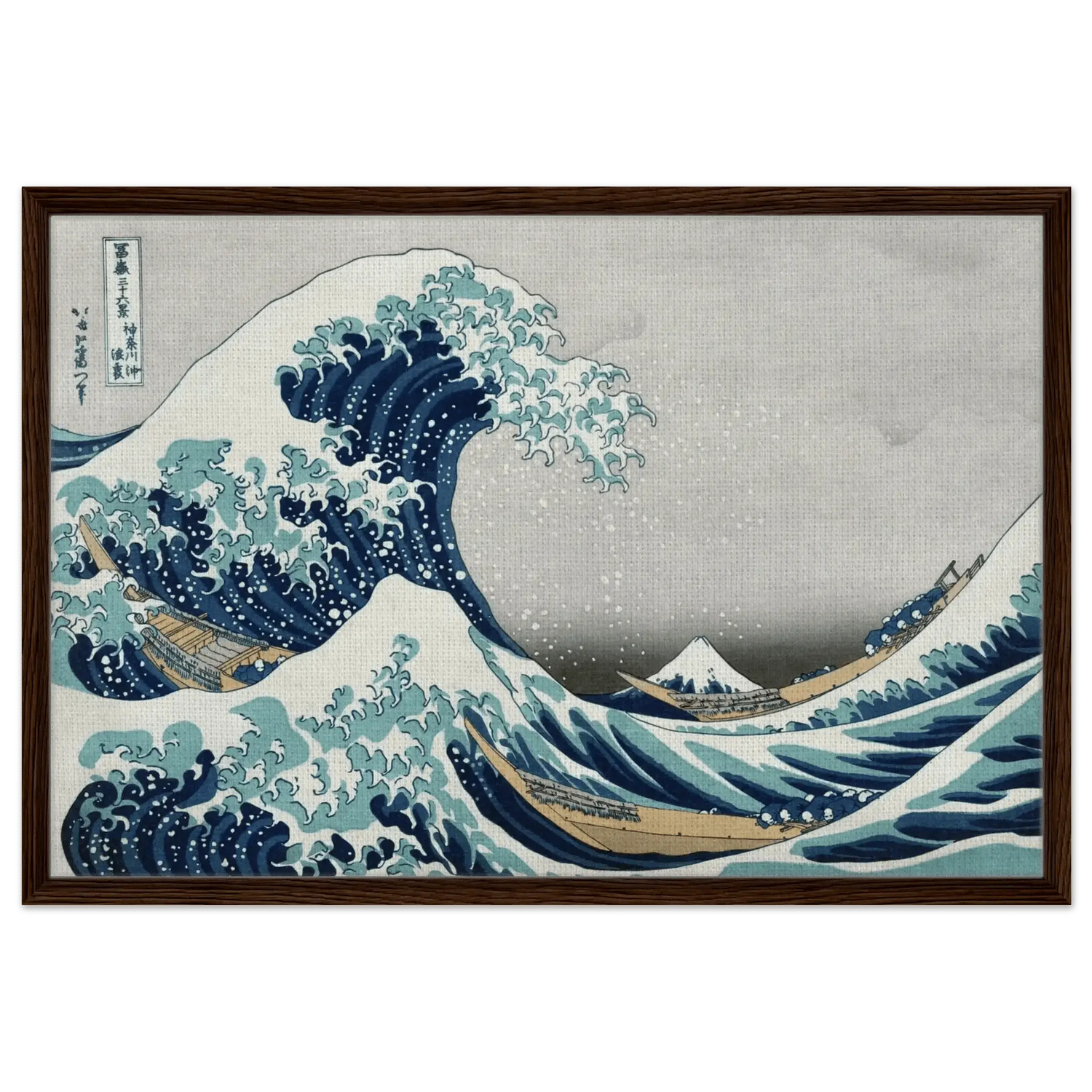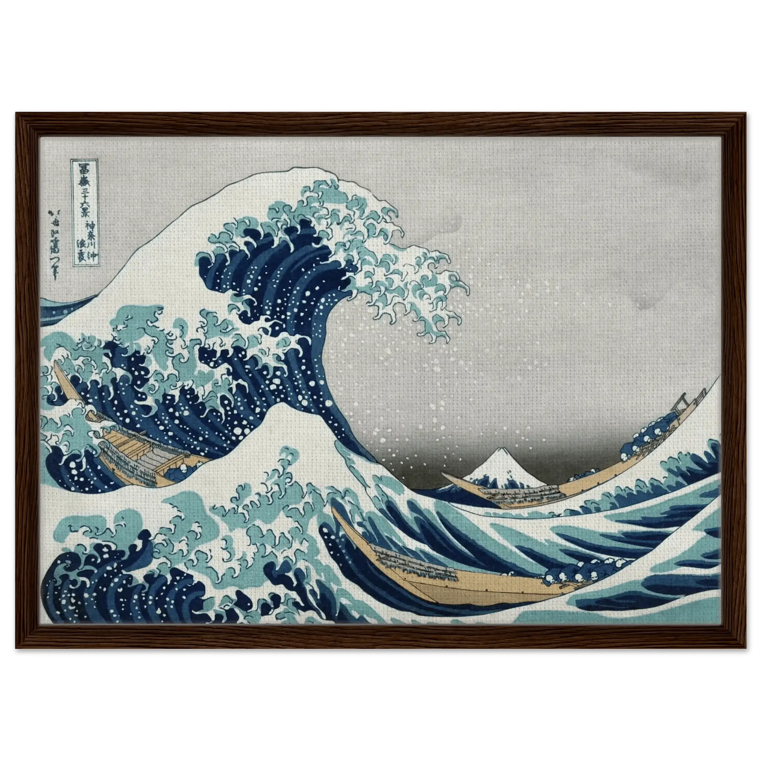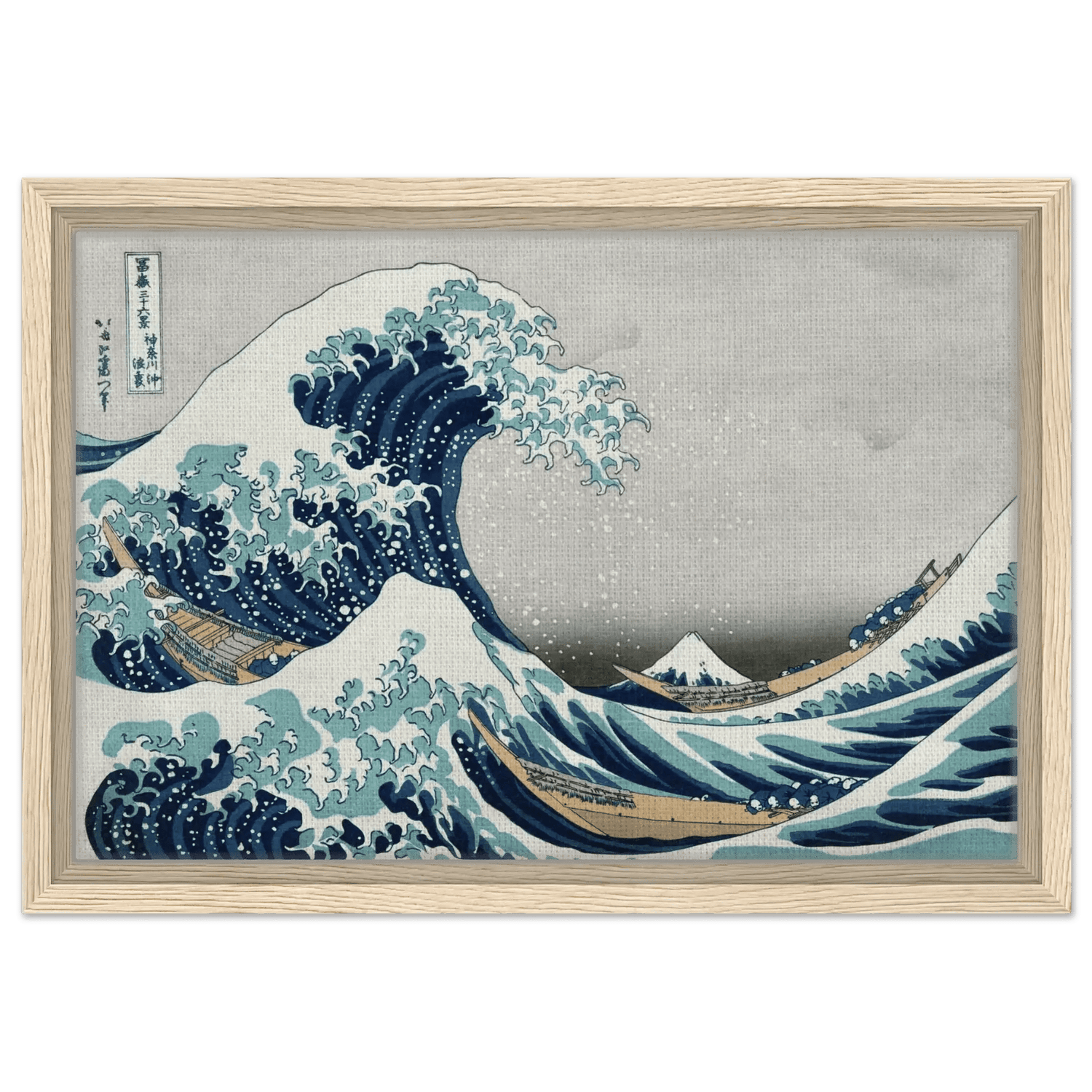 Eine gewaltige Welle erhebt sich drohend über kleine Fischerboote, ihre weißen Schaumkronen krümmen sich wie Krallen über dem Meer. Im Hintergrund, ruhig und unerschütterlich, steht der heilige Berg Fuji – Symbol der Beständigkeit inmitten des Chaos.