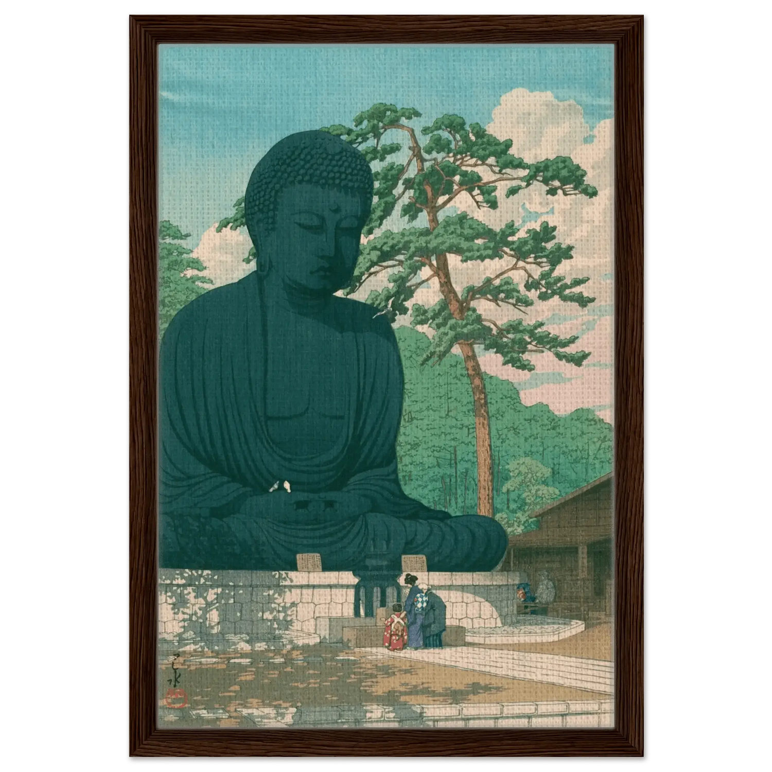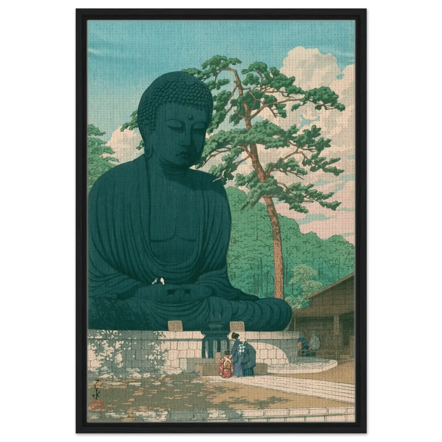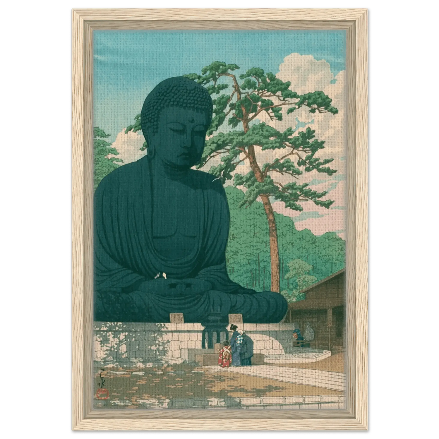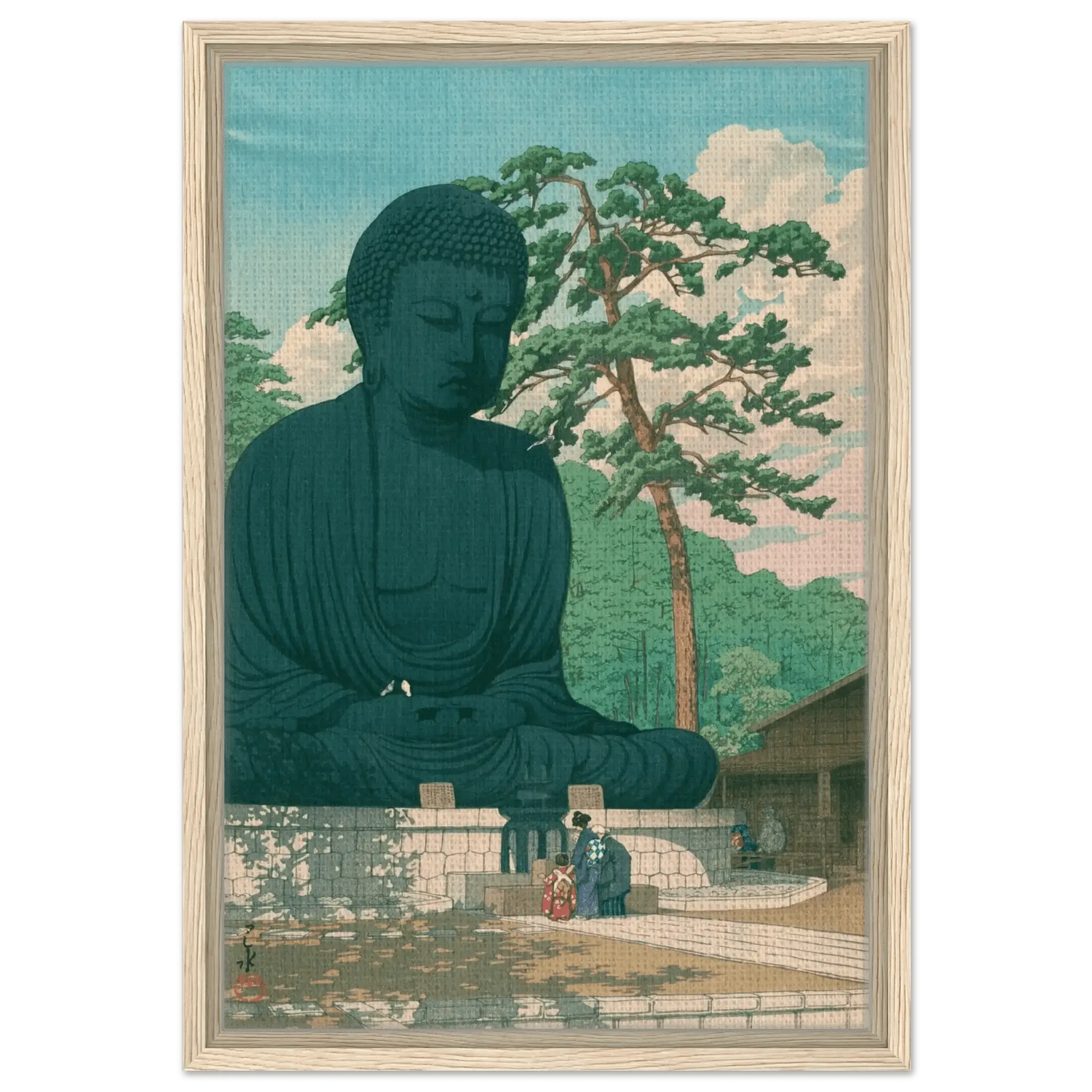 Vor dem gewaltigen Antlitz des Großen Buddha verweilen Menschen in stiller Andacht. Das Sonnenlicht fällt weich auf Bronze und Kiefer, während Vögel durch die klare Luft ziehen – ein Moment des Friedens zwischen Mensch und Natur. Kawase Hasui verleiht dieser Szene von Kamakura eine zeitlose Würde, in der spirituelle Erhabenheit und irdische Stille eins werden.