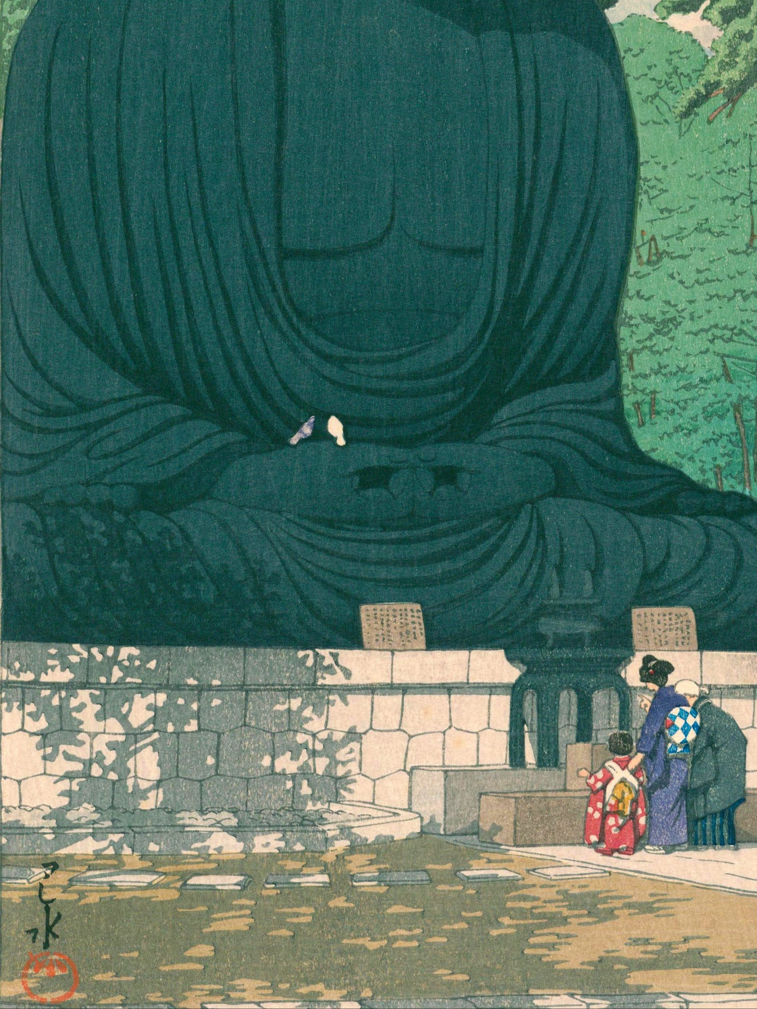 Vor dem gewaltigen Antlitz des Großen Buddha verweilen Menschen in stiller Andacht. Das Sonnenlicht fällt weich auf Bronze und Kiefer, während Vögel durch die klare Luft ziehen – ein Moment des Friedens zwischen Mensch und Natur. Kawase Hasui verleiht dieser Szene von Kamakura eine zeitlose Würde, in der spirituelle Erhabenheit und irdische Stille eins werden.