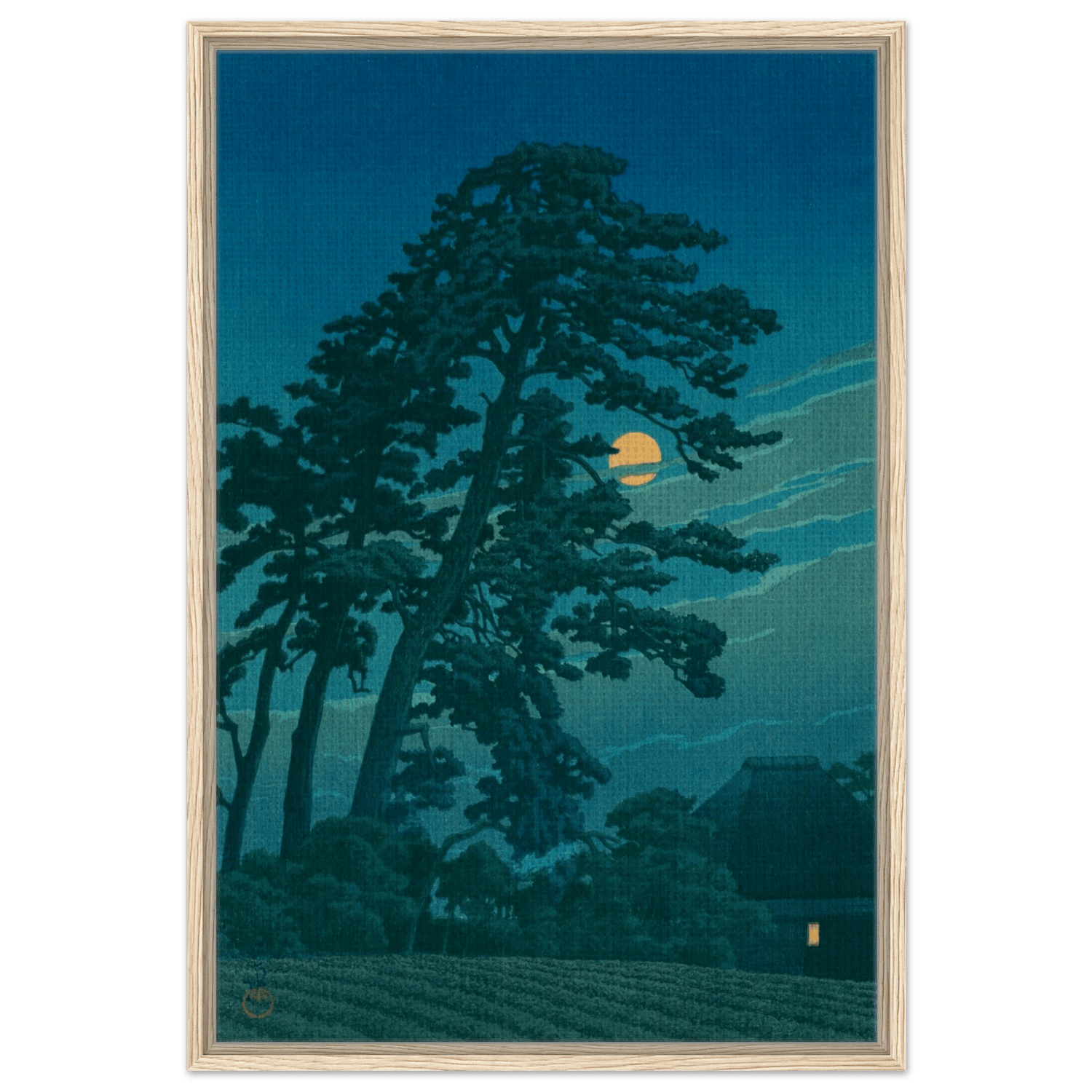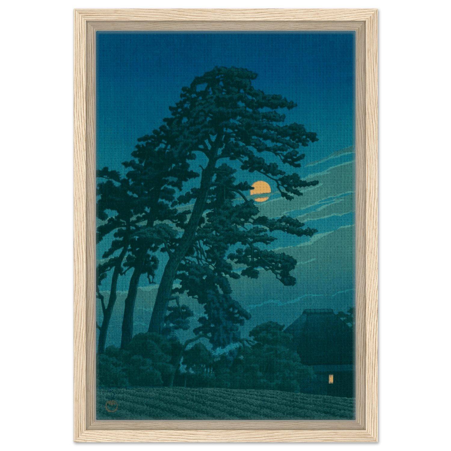 Ein goldener Mond steigt hinter hohen Kiefern empor, deren Schatten sich über die Felder legen. Nur ein fernes Licht in einer Strohhütte zeugt von menschlicher Gegenwart in dieser stillen, nächtlichen Welt. Kawase Hasui fängt die poetische Ruhe des Mondlichts ein – eine Meditation über Einsamkeit, Natur und die leise Schönheit der Nacht.