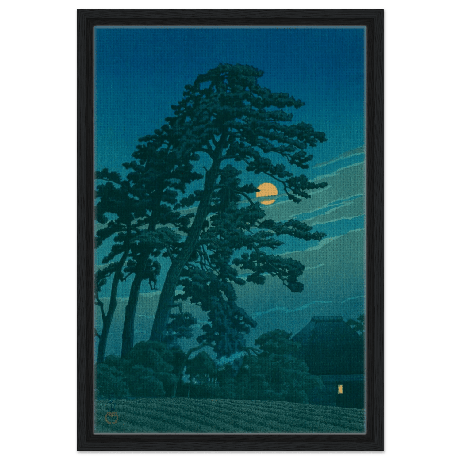 Dieses Werk gehört zu Hasuis eindrucksvollsten Nachtlandschaften – eine lyrische Komposition, in der Licht, Stille und Natur zu einer einzigen, kontemplativen Empfindung verschmelzen.