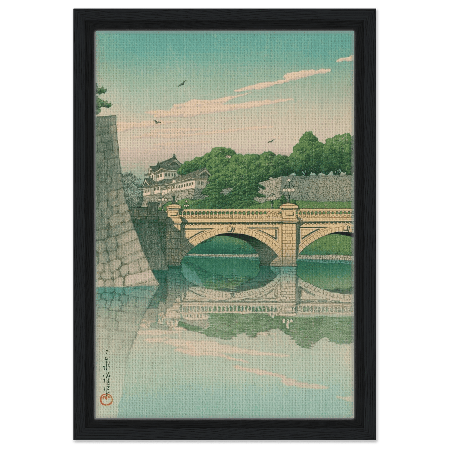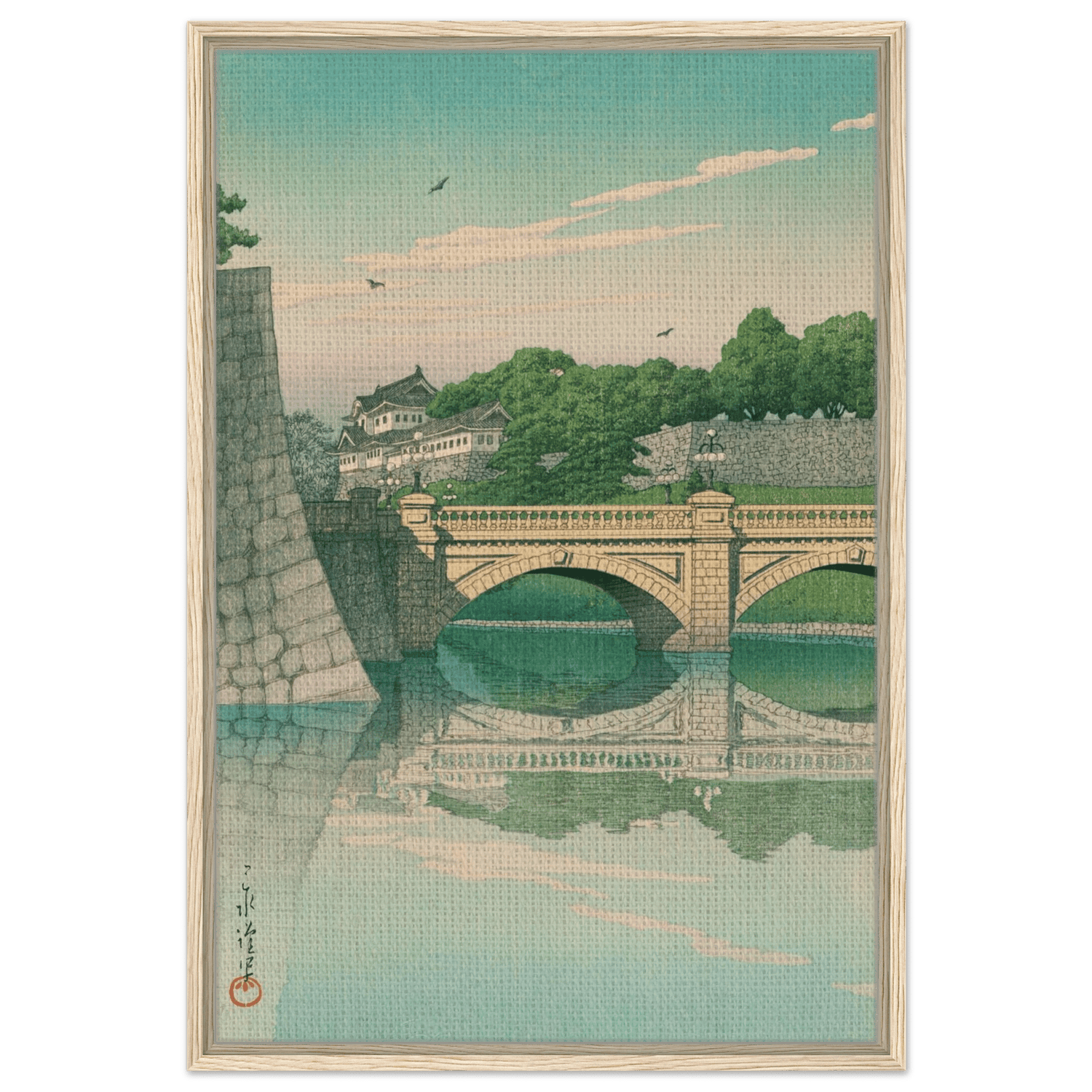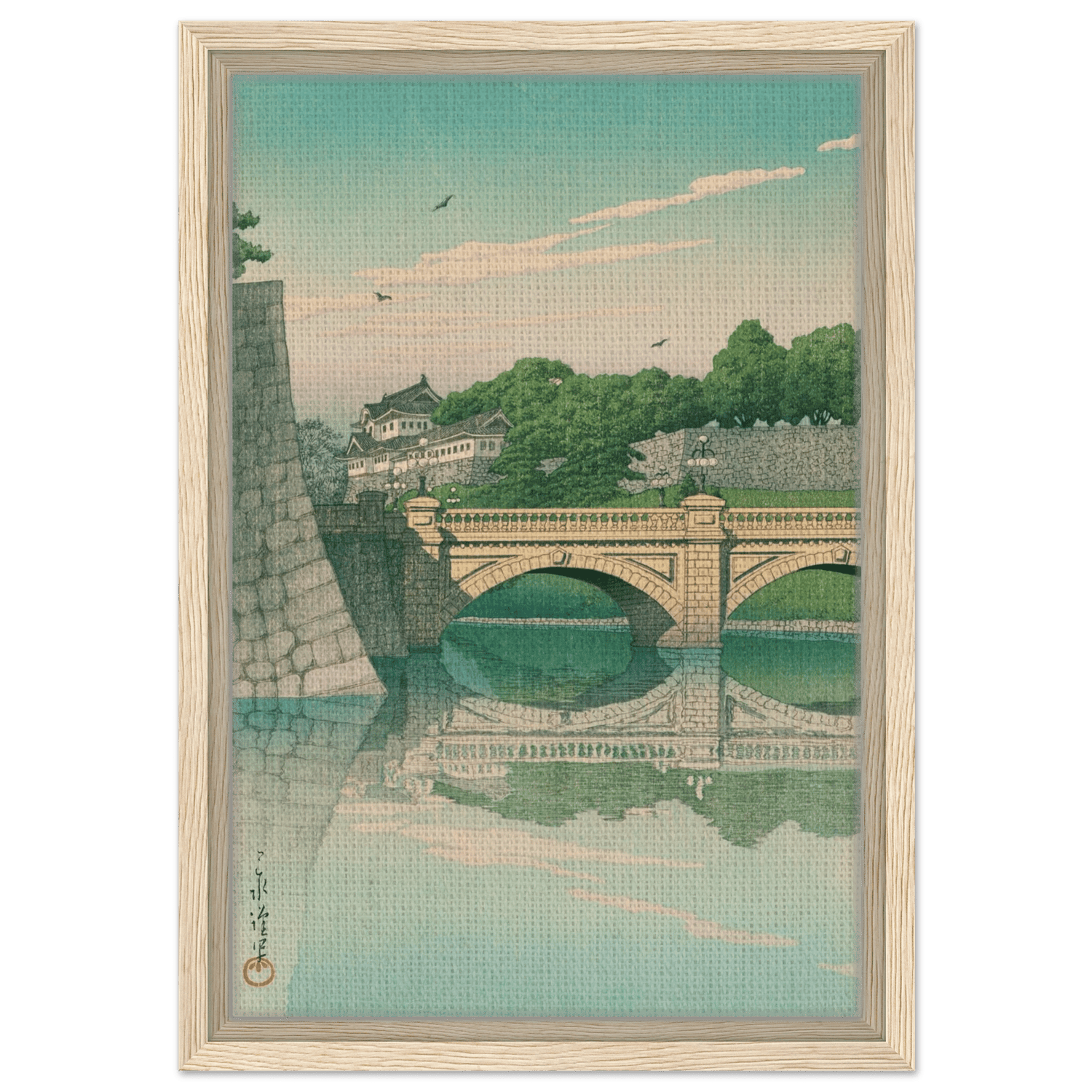 Das Morgenlicht fällt weich auf die steinerne Brücke von Nijūbashi, deren Spiegelbild sich ruhig im klaren Wasser des Grabens verliert. Über den alten Mauern erhebt sich das Schloss von Tokio in stiller Würde, während Vögel über den hellen Himmel ziehen. Kawase Hasui vereint in dieser Komposition Geschichte und Harmonie – ein Moment von Frieden und zeitloser Anmut im Herzen der Hauptstadt.