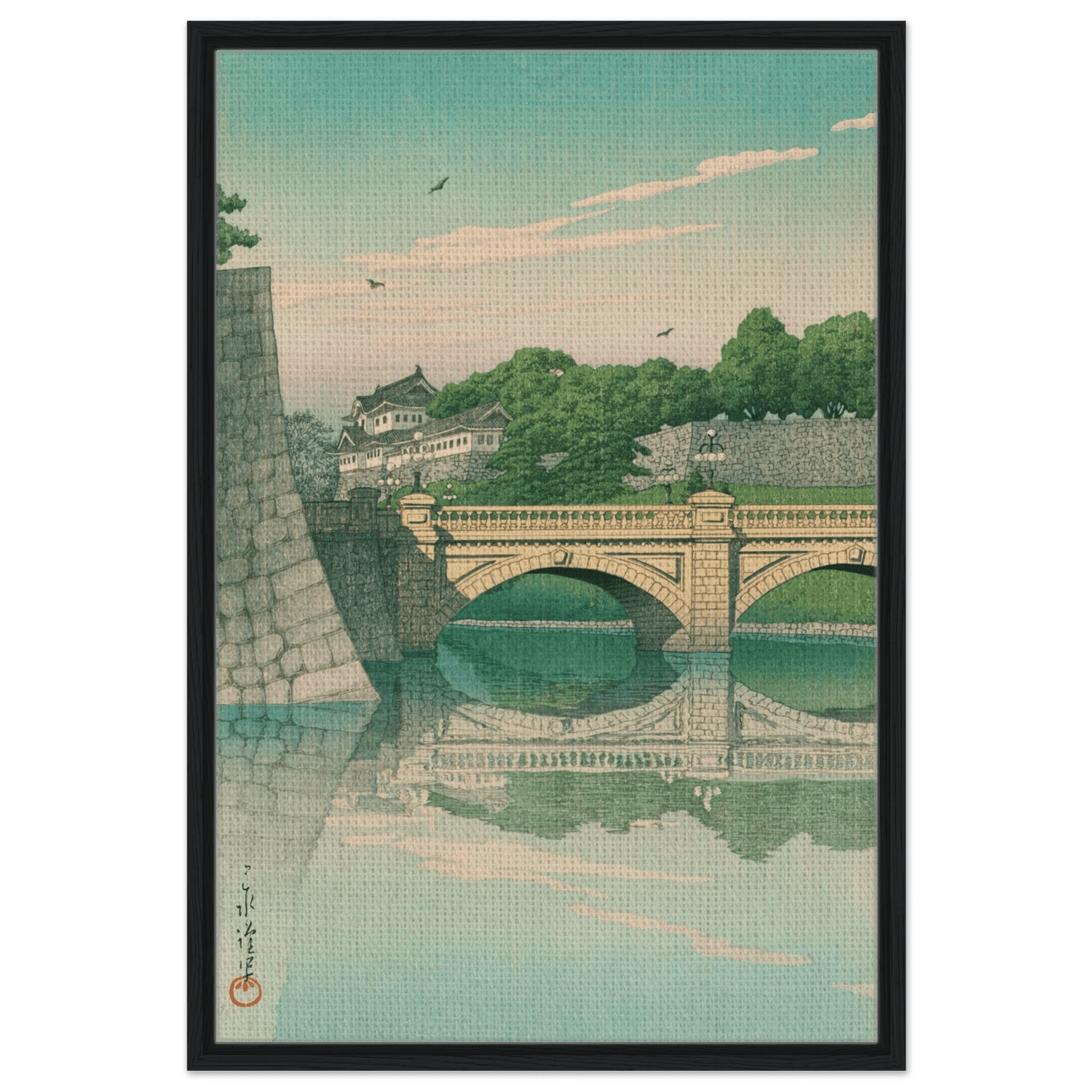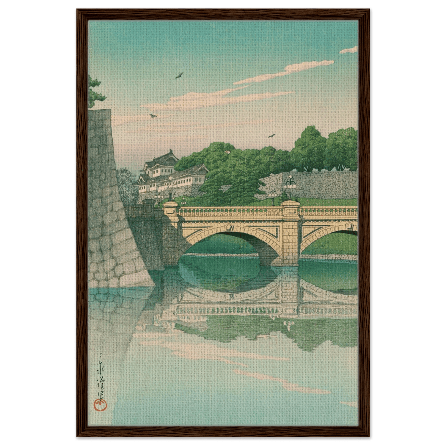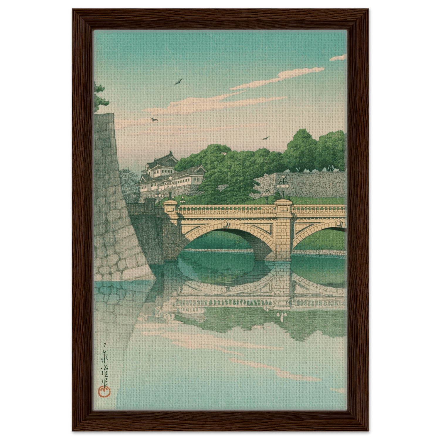 Das Morgenlicht fällt weich auf die steinerne Brücke von Nijūbashi, deren Spiegelbild sich ruhig im klaren Wasser des Grabens verliert. Über den alten Mauern erhebt sich das Schloss von Tokio in stiller Würde, während Vögel über den hellen Himmel ziehen. Kawase Hasui vereint in dieser Komposition Geschichte und Harmonie – ein Moment von Frieden und zeitloser Anmut im Herzen der Hauptstadt.