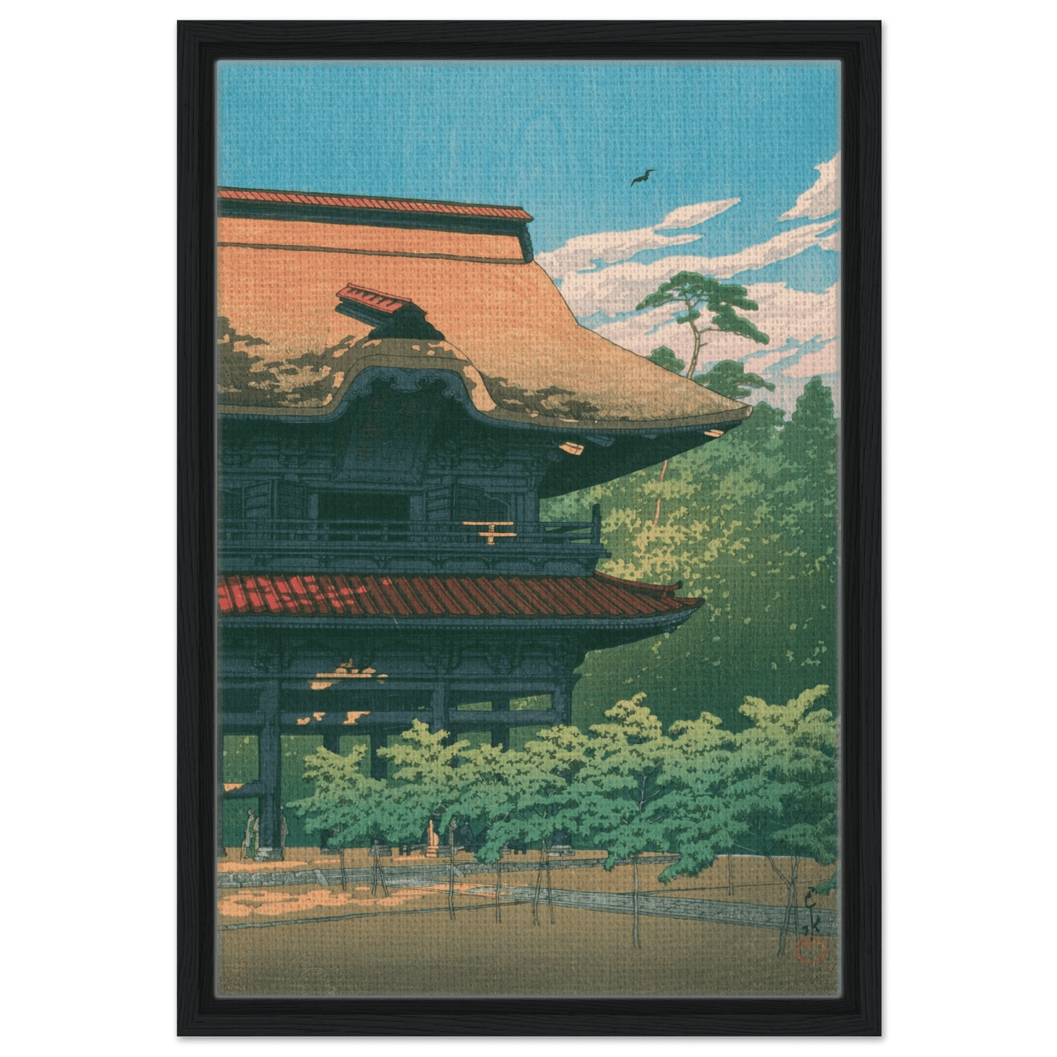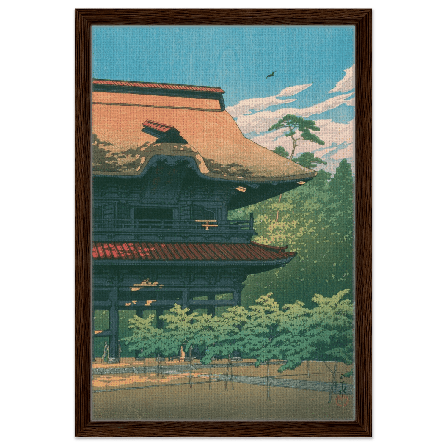 Das warme Licht des Nachmittags streift das Dach des Kenchō-ji-Tempels, dessen mächtige Holzstruktur still im Grün der Zedern ruht. Über den Bäumen zieht ein Vogel seine Bahn, als würde er die Zeit selbst begleiten. Kawase Hasui fängt hier den friedvollen Atem der Sommerluft ein – eine stille Hommage an die spiritische Gelassenheit der Zen-Tempel von Kamakura.