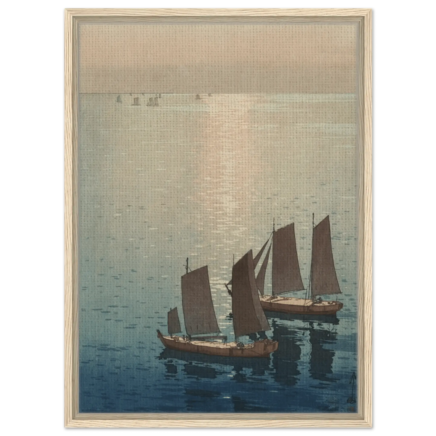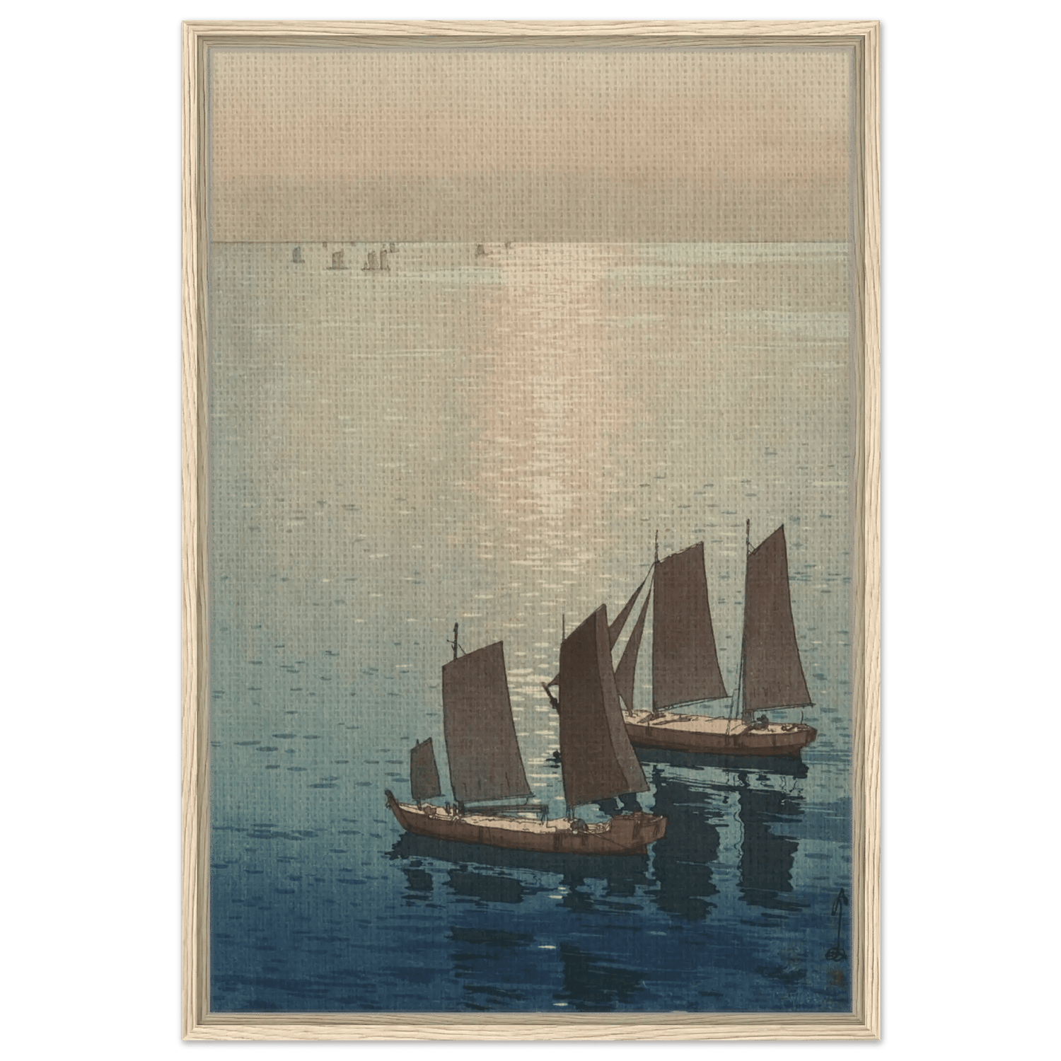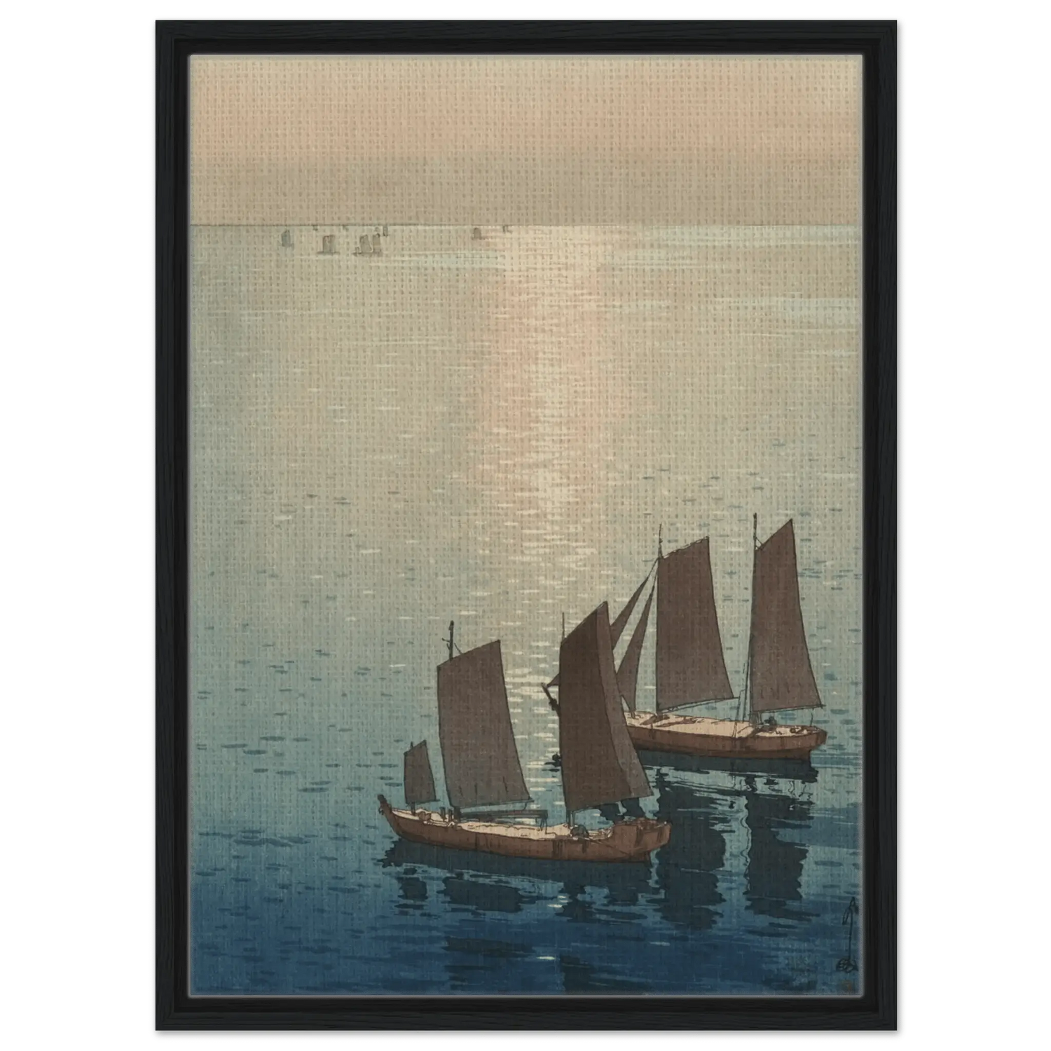 Ein sanftes Licht breitet sich über die ruhige Wasserfläche aus, wo die letzten Sonnenstrahlen das Meer in schimmerndes Gold tauchen. Die Segelboote gleiten still über das spiegelnde Wasser, als wären sie Teil eines endlosen Traums zwischen Himmel und Meer. In dieser Komposition fängt Hiroshi Yoshida den Moment ein, in dem Bewegung und Stille ineinander übergehen – eine Meditation über Licht, Zeit und Vergänglichkeit.