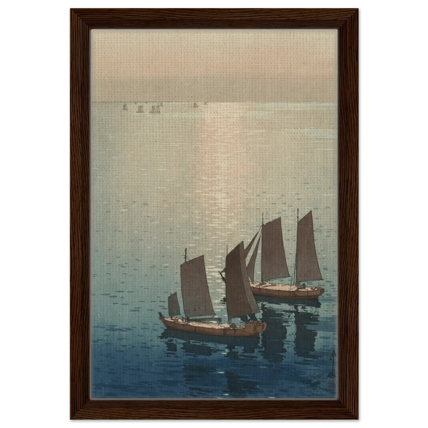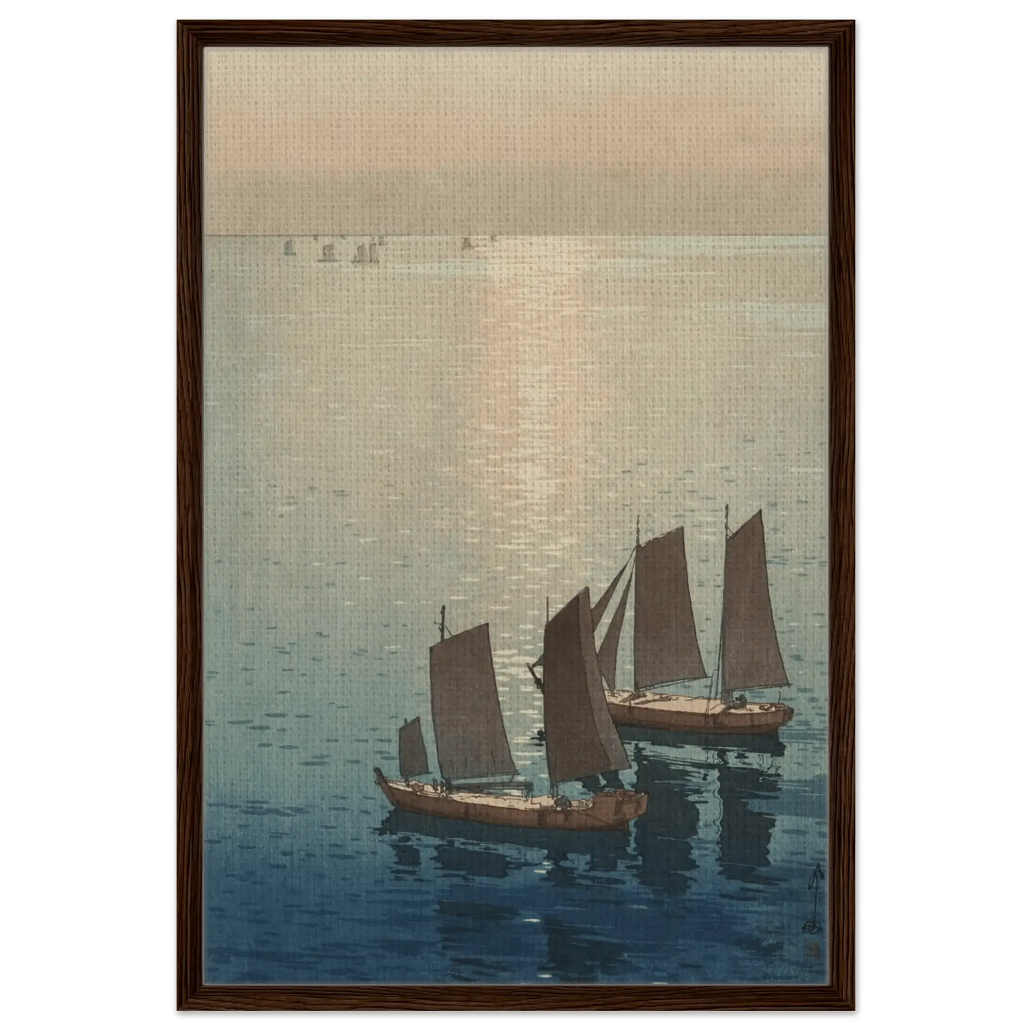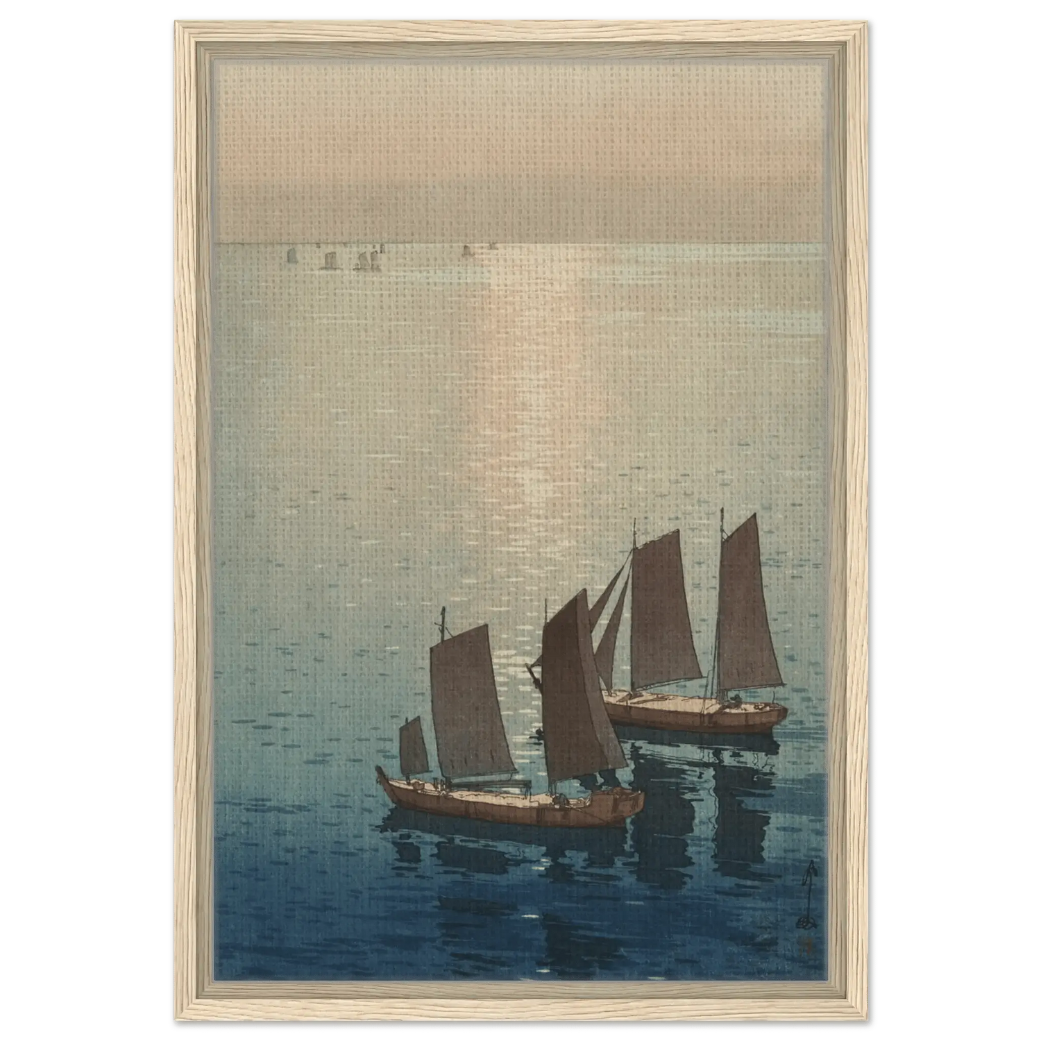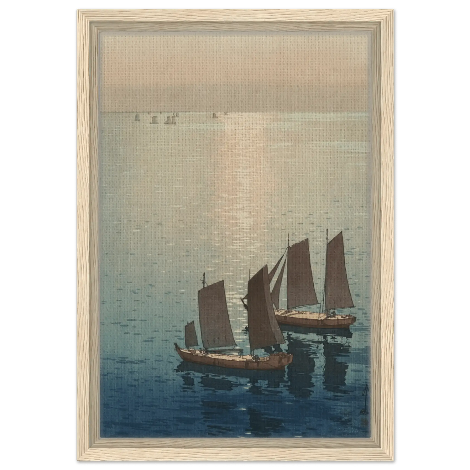 Ein sanftes Licht breitet sich über die ruhige Wasserfläche aus, wo die letzten Sonnenstrahlen das Meer in schimmerndes Gold tauchen. Die Segelboote gleiten still über das spiegelnde Wasser, als wären sie Teil eines endlosen Traums zwischen Himmel und Meer. In dieser Komposition fängt Hiroshi Yoshida den Moment ein, in dem Bewegung und Stille ineinander übergehen – eine Meditation über Licht, Zeit und Vergänglichkeit.