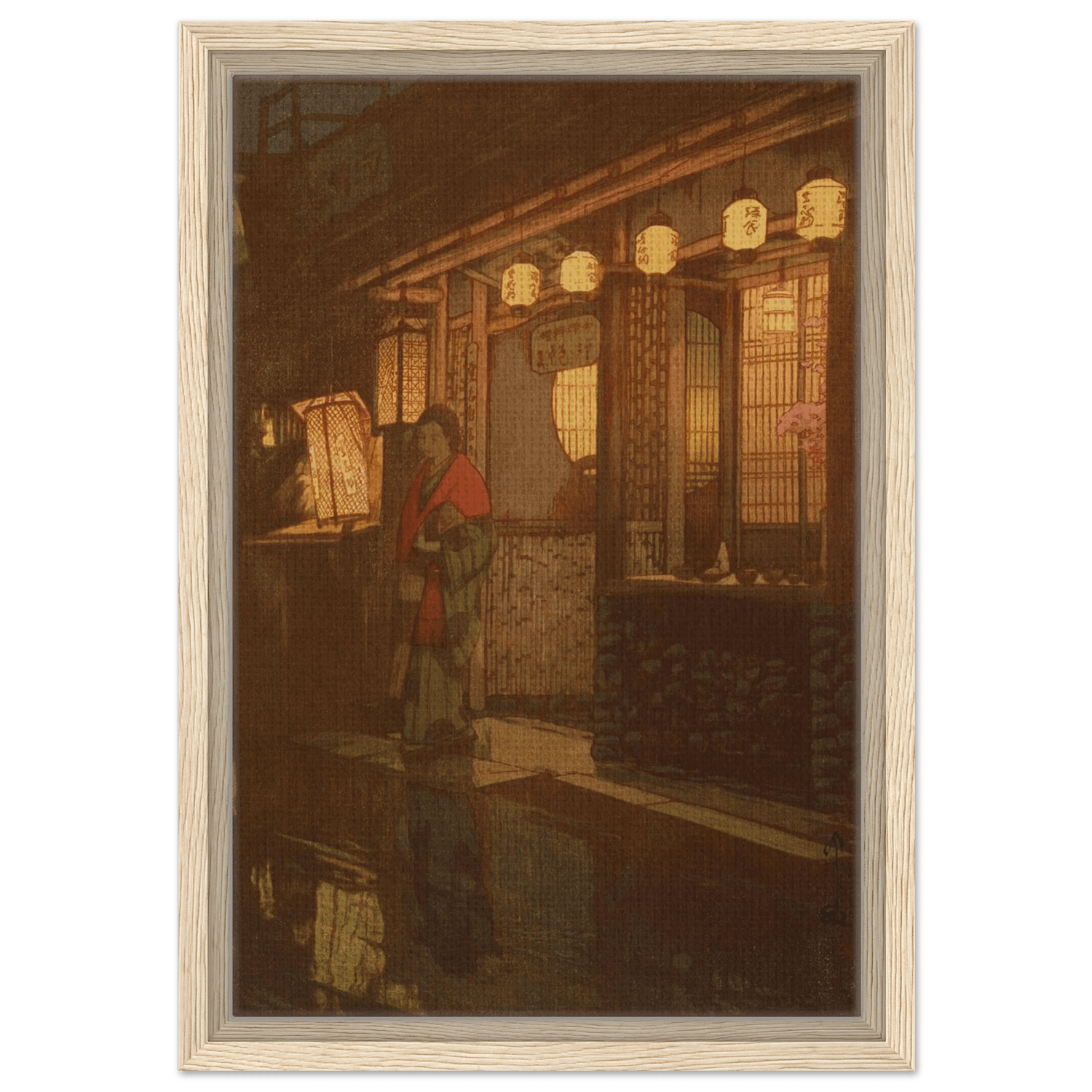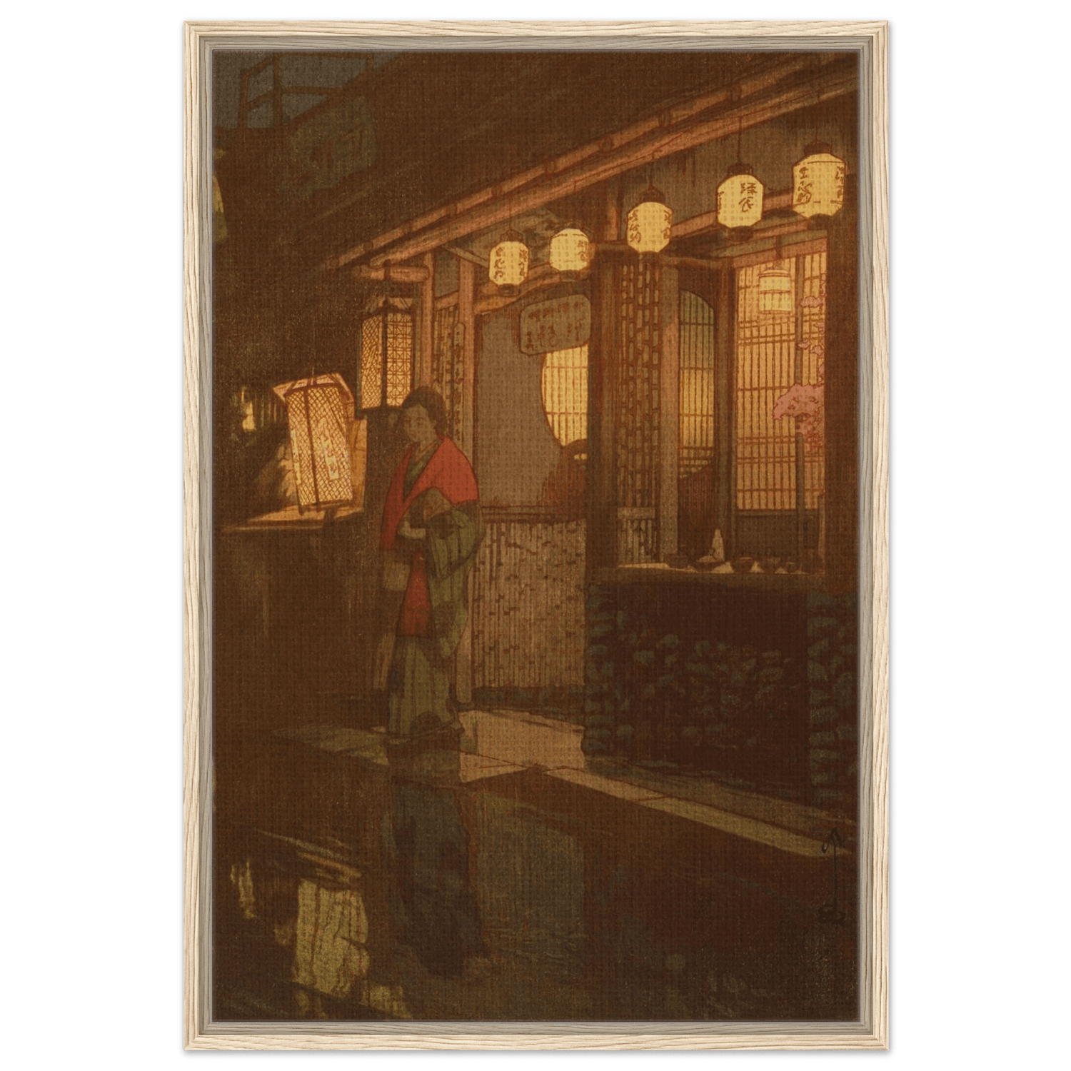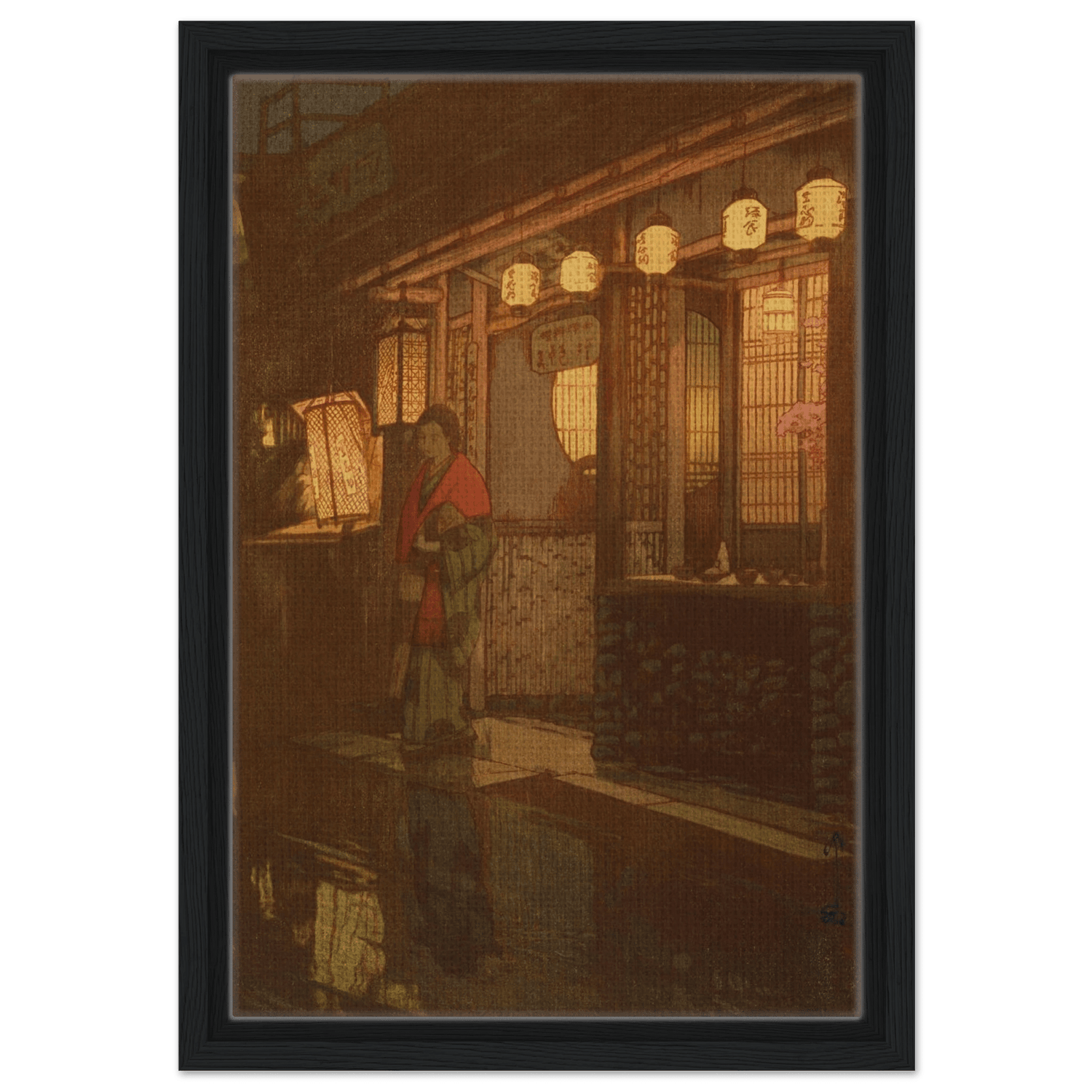 Sanftes Laternenlicht taucht die Szene in warmes Gold und Rot, während sich das Pflaster im Regen spiegelt. Eine Frau im Kimono steht vor einem kleinen Restaurant – ein flüchtiger Moment des Alltags, eingefangen mit stiller Würde und feinem Gespür für Atmosphäre. Hiroshi Yoshida lässt Licht und Schatten miteinander verschmelzen, sodass die Nacht zu atmen scheint – zwischen Intimität und Vergänglichkeit.