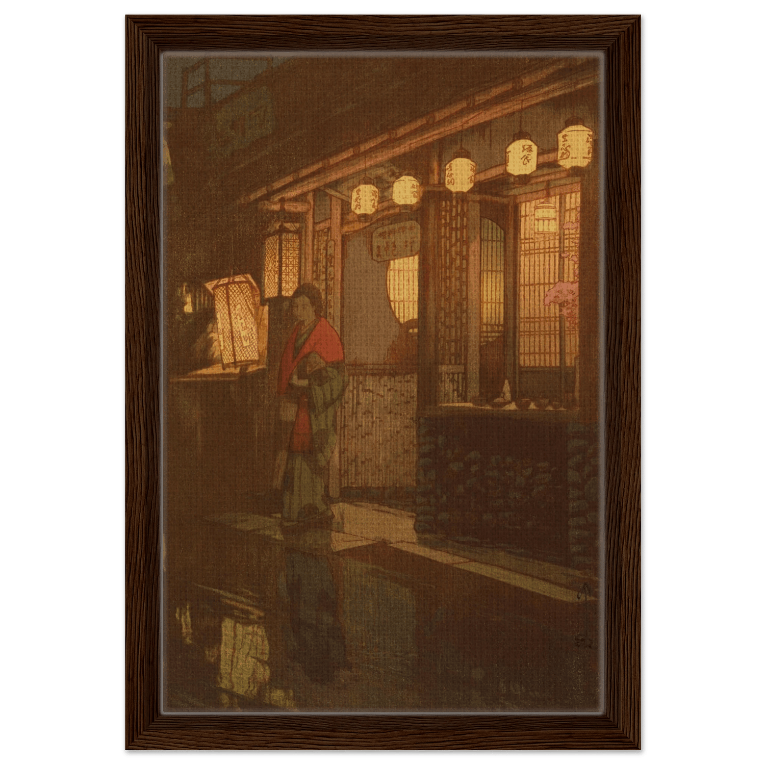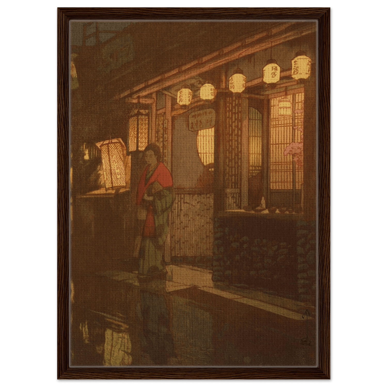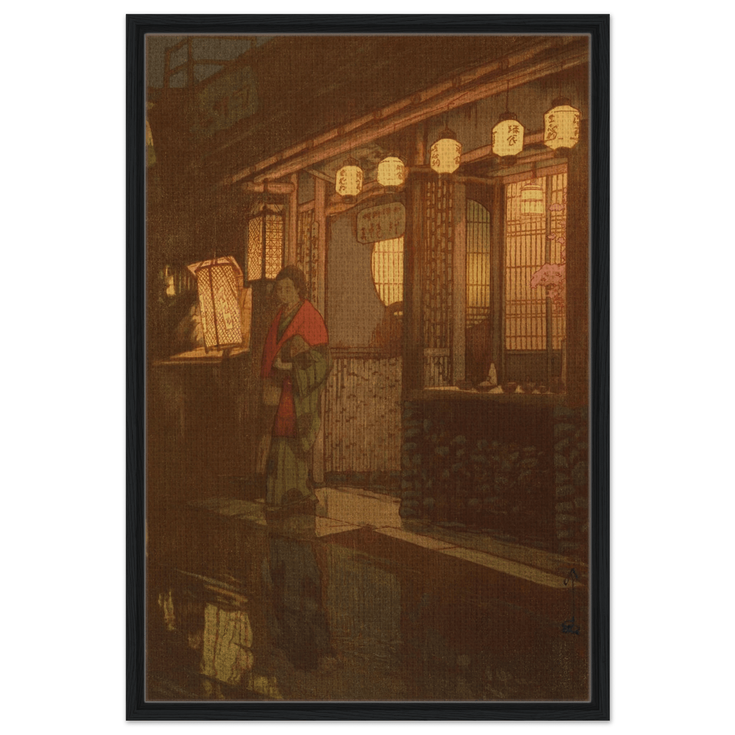 Sanftes Laternenlicht taucht die Szene in warmes Gold und Rot, während sich das Pflaster im Regen spiegelt. Eine Frau im Kimono steht vor einem kleinen Restaurant – ein flüchtiger Moment des Alltags, eingefangen mit stiller Würde und feinem Gespür für Atmosphäre. Hiroshi Yoshida lässt Licht und Schatten miteinander verschmelzen, sodass die Nacht zu atmen scheint – zwischen Intimität und Vergänglichkeit.