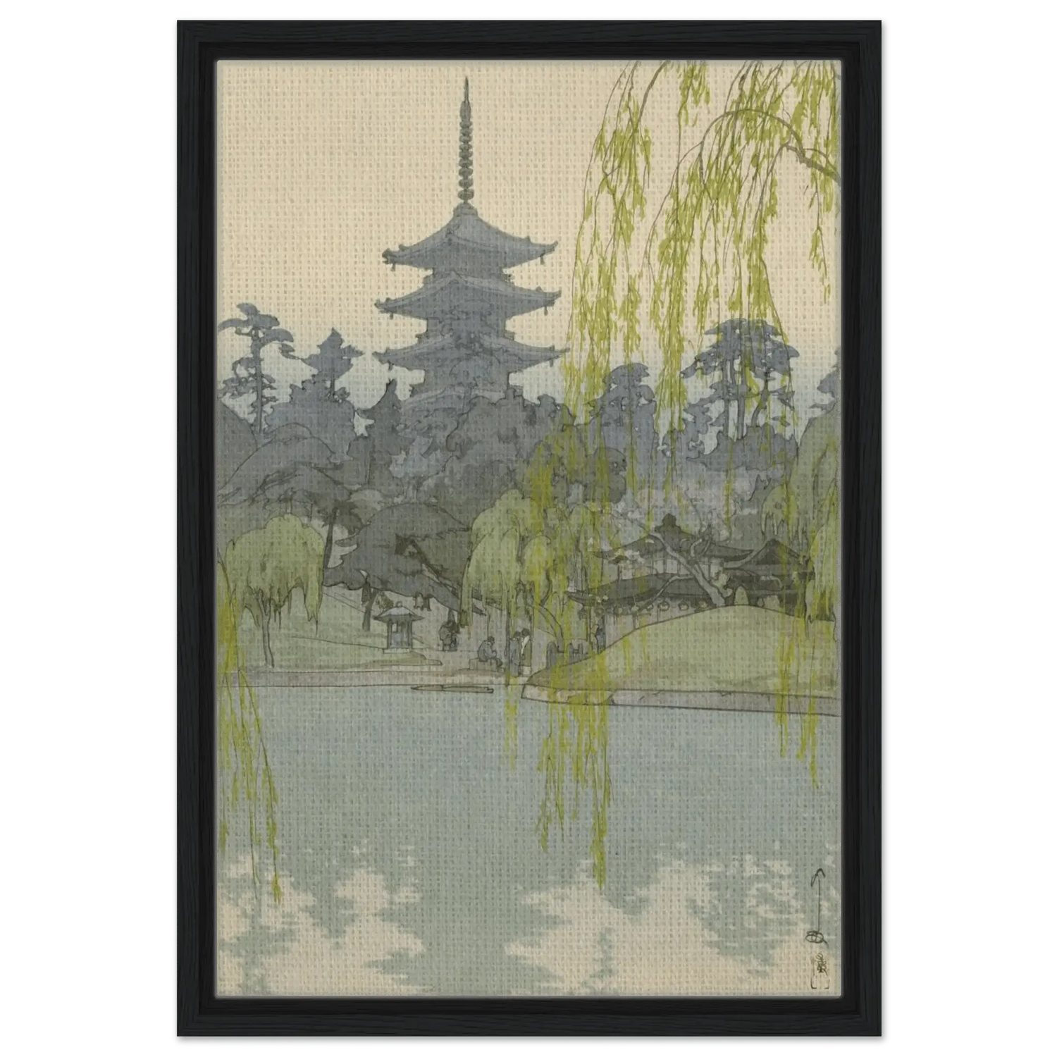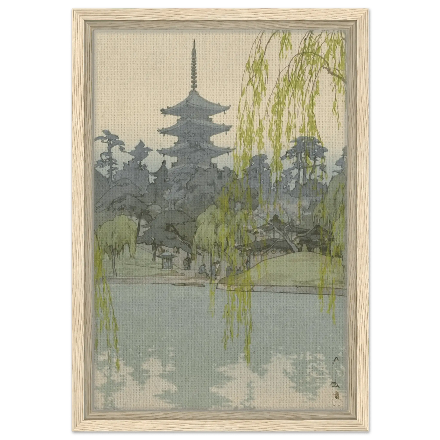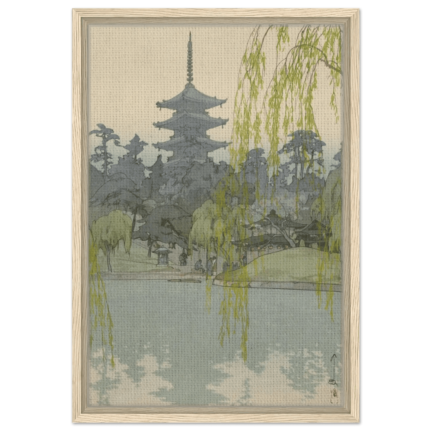 Zarte Weidenzweige neigen sich über das stille Wasser, das die Pagode in weichem Licht spiegelt. In dieser friedvollen Komposition verbindet Hiroshi Yoshida Natur, Architektur und Mensch zu einer harmonischen Einheit. Das Werk strahlt jene leise Melancholie aus, die im Frühling von Nara über den Sarusawa-Teich zieht – ein Ort, an dem Vergangenheit und Gegenwart still ineinander übergehen.
