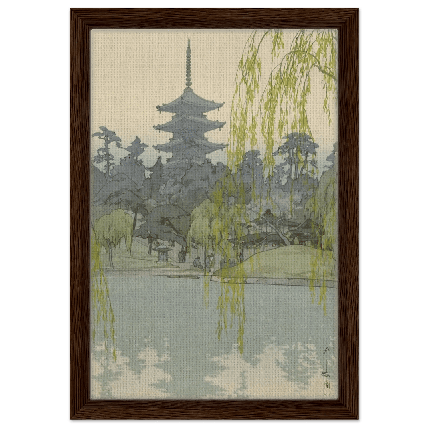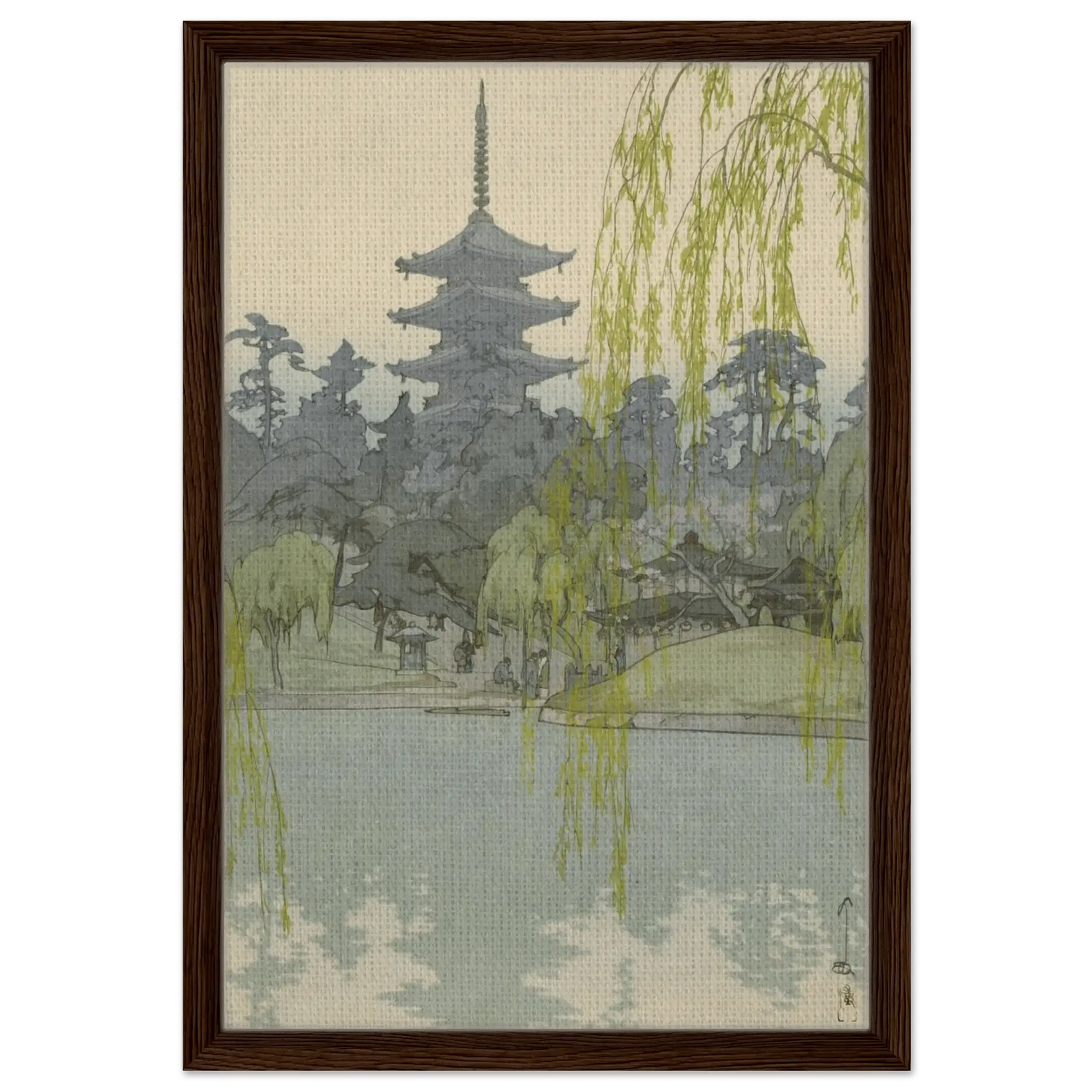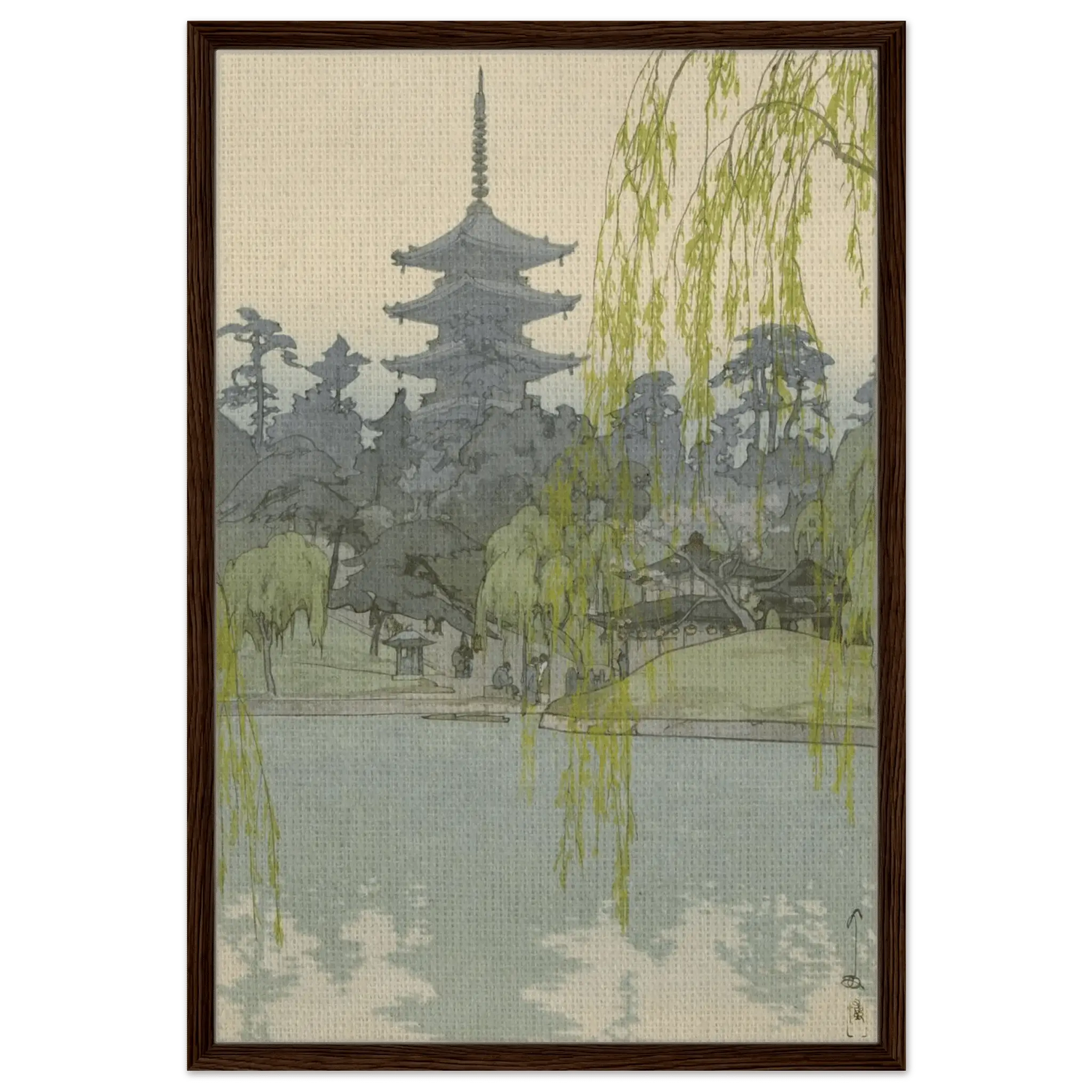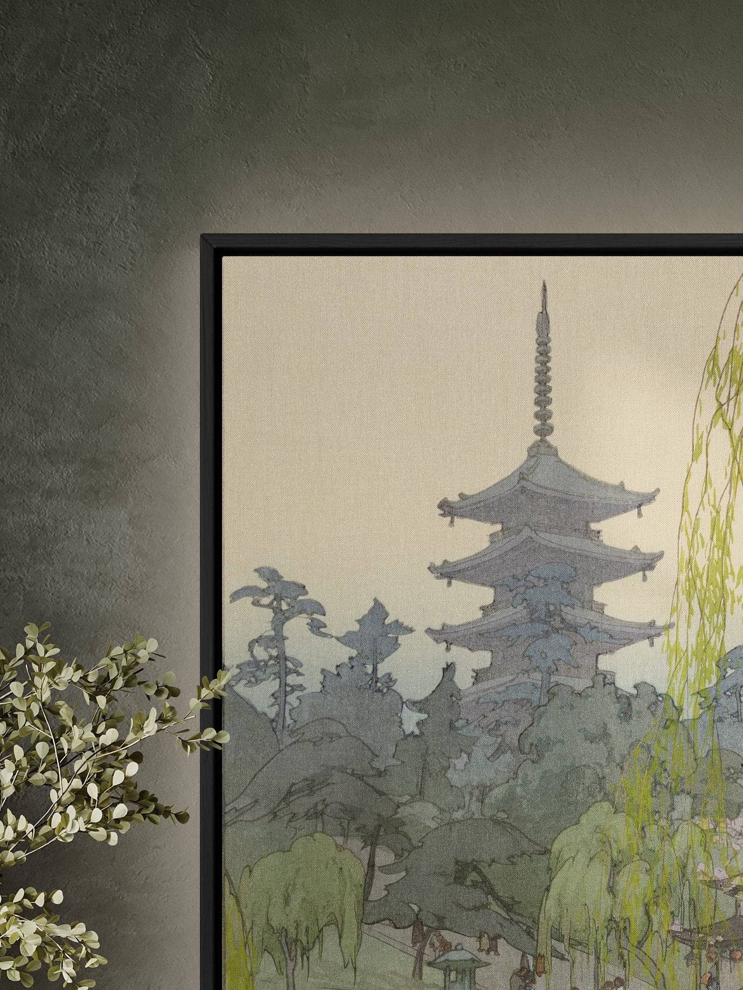Zarte Weidenzweige neigen sich über das stille Wasser, das die Pagode in weichem Licht spiegelt. In dieser friedvollen Komposition verbindet Hiroshi Yoshida Natur, Architektur und Mensch zu einer harmonischen Einheit. Das Werk strahlt jene leise Melancholie aus, die im Frühling von Nara über den Sarusawa-Teich zieht – ein Ort, an dem Vergangenheit und Gegenwart still ineinander übergehen.