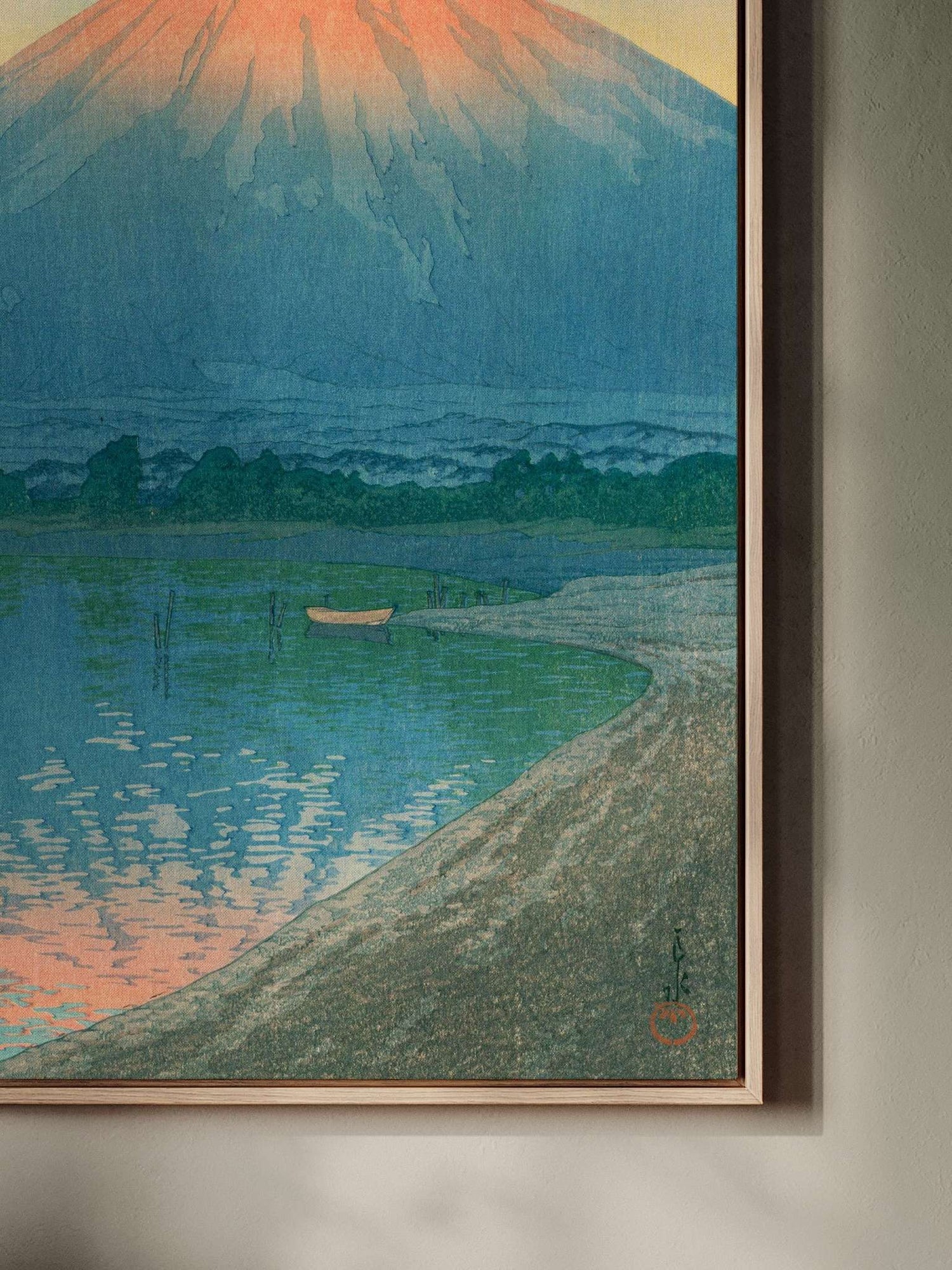 Im ersten Licht des Morgens erstrahlt der Fuji in zartem Rot, sein majestätischer Gipfel still über dem klaren See. Das Wasser spiegelt den Himmel, der sich zwischen Nacht und Tag öffnet, und ein einzelnes Boot ruht am Ufer. Kawase Hasui verwandelt den Moment des Sonnenaufgangs in ein Sinnbild stiller Erhabenheit – die Begegnung von Licht, Stille und Ewigkeit.